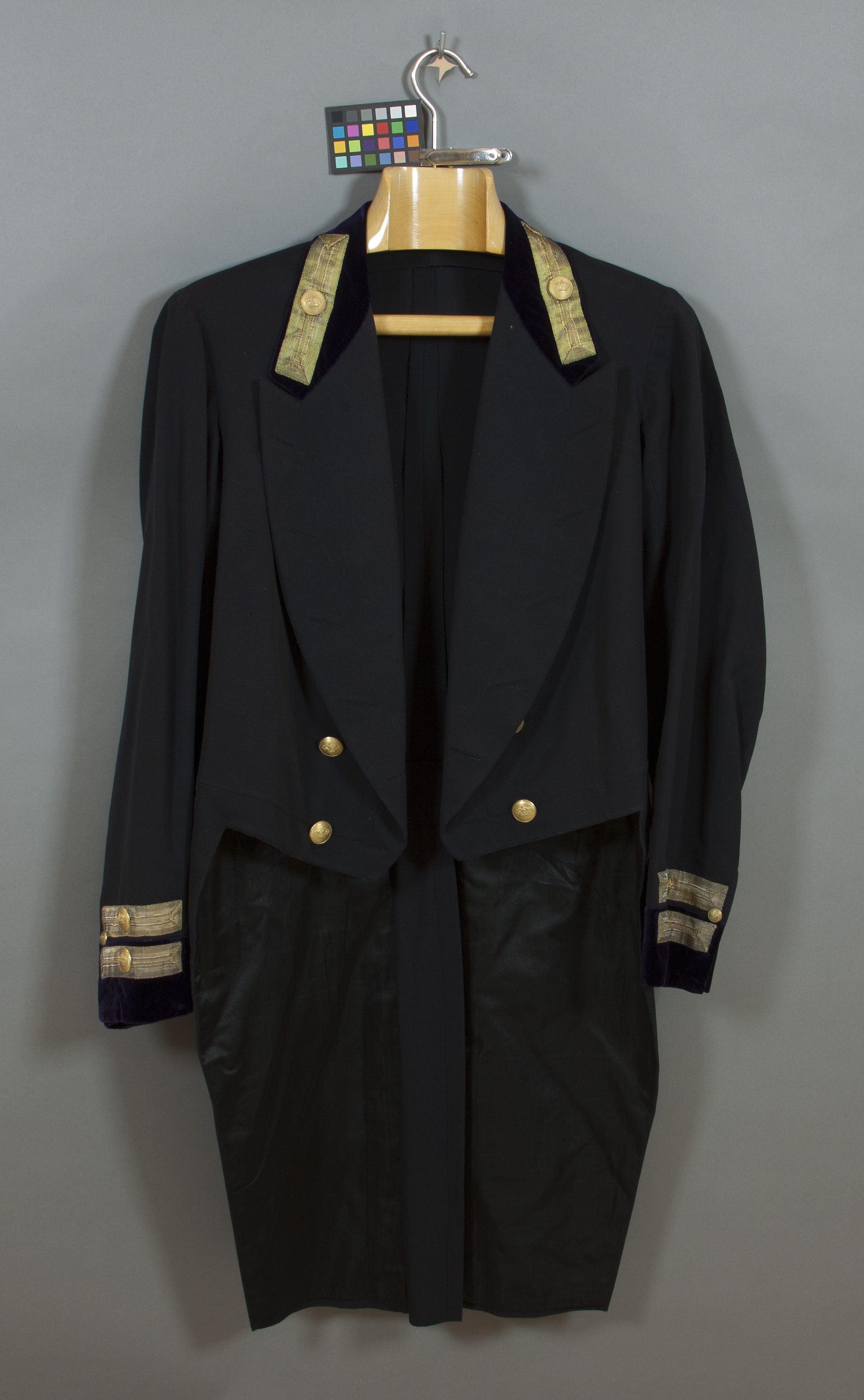 Frack av mörkblått kläde. Knäppning 6 knapphål och 6 knappar på vardera sidan. Fällkrage och ärmuppslag av mörkviolett sammet och guldgaloner i form av s.k. knapphål.2 knappar på ärmens guldgaloner samt ett 113 mm långt sprund med liten knapp. På kragen 2 knappar. Ficklock med guldgaloner i 3 vertikala rader, 3 knappar inunder. 1 knapp på vardera sidan om sprundet mellan ficklocken samt i skörtens nedre, inre hörn.. Knapparna är runda, välvda, förgyllda med kungakrona. Ovanför h. ficklock 2 små hål för fästande av kammarherrenyckel. En innerficka. Svart sidenfoder, vit atlas(?)foder i ärmarna.