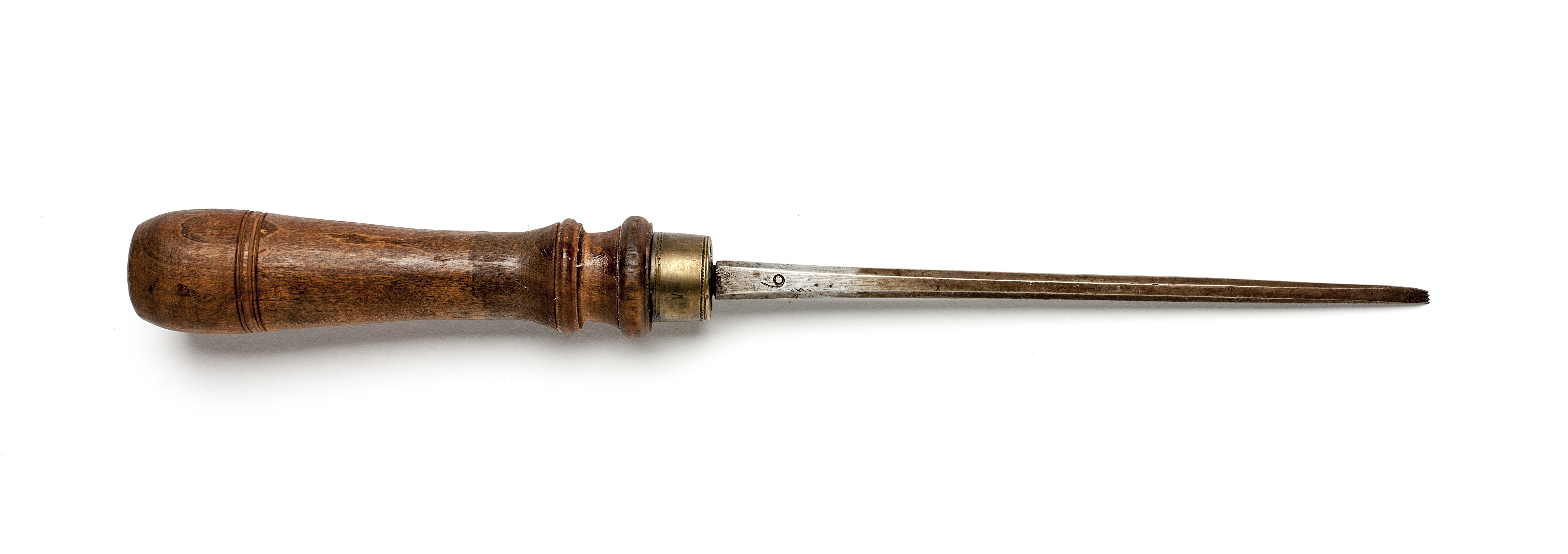 Klinga med åttsidig genomskärning. Stämplat på klingan: "9" (frakturstil) Fyrtandad egg. Svarvat skaft av päronträ, med två vulster nedtill ("rydboholmstyp"). Mässingsring.