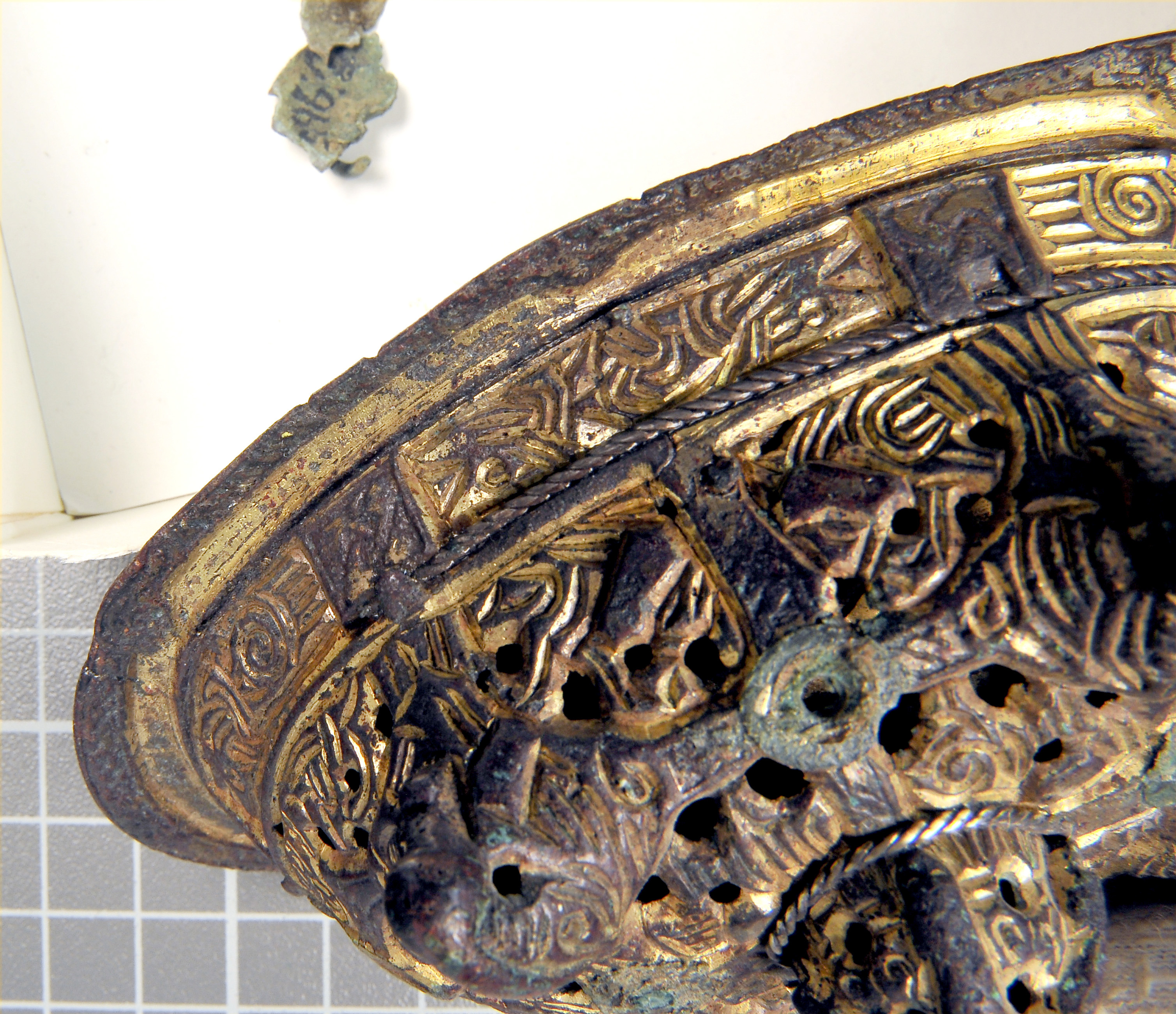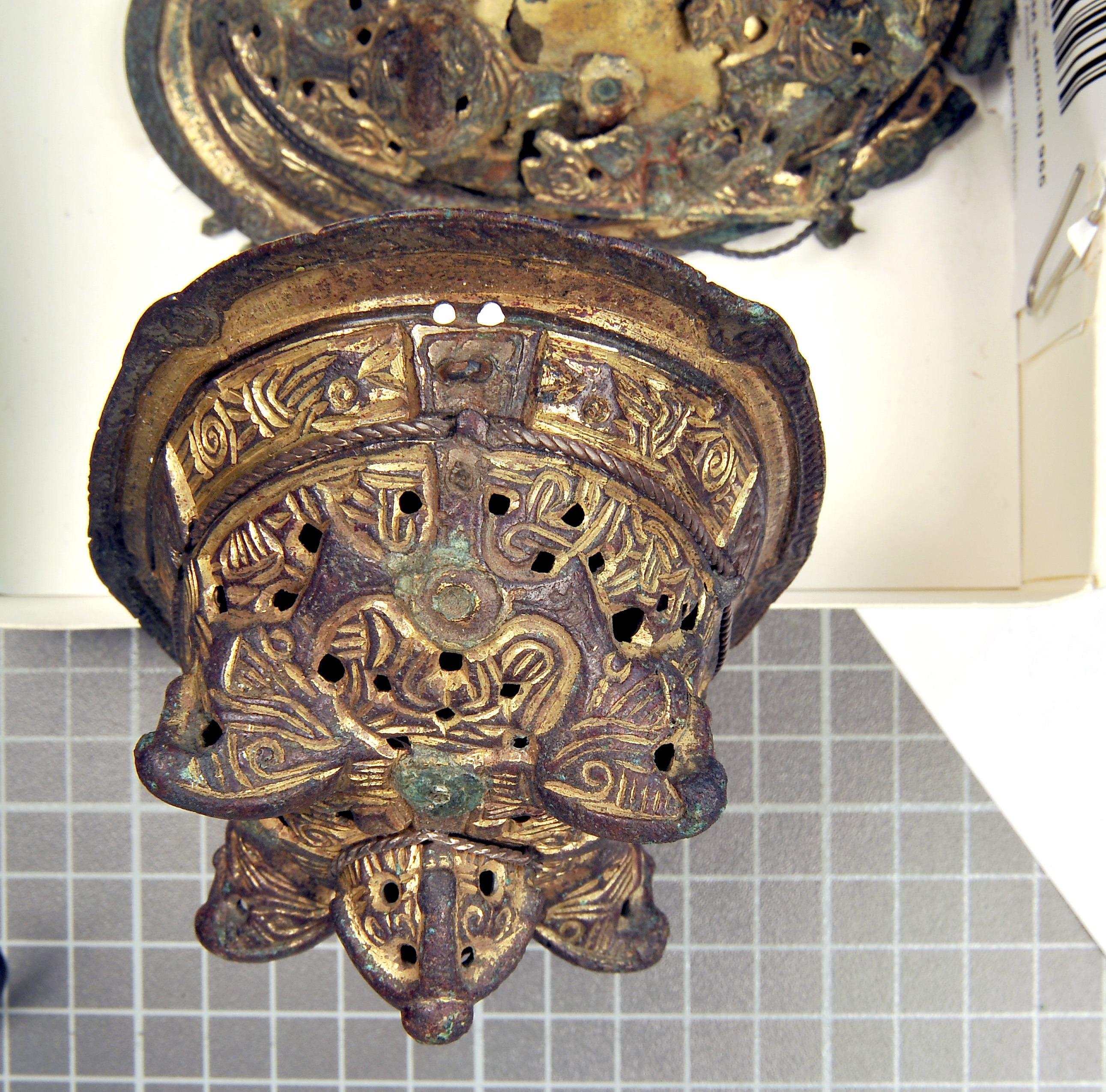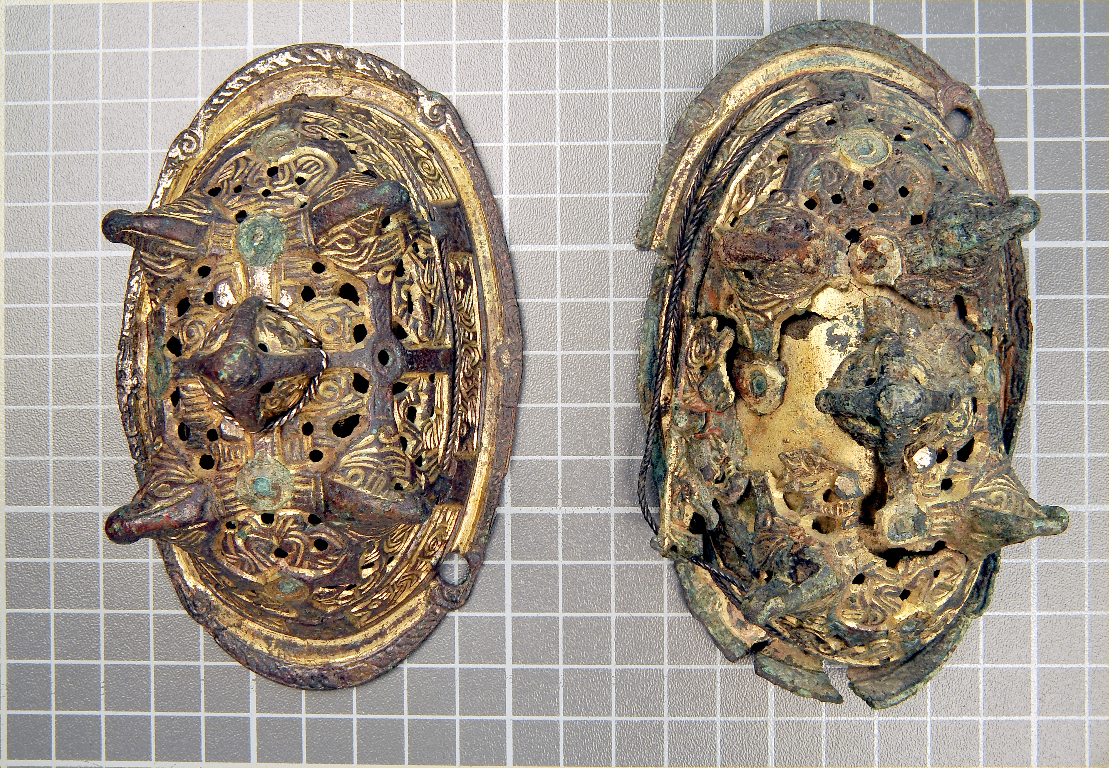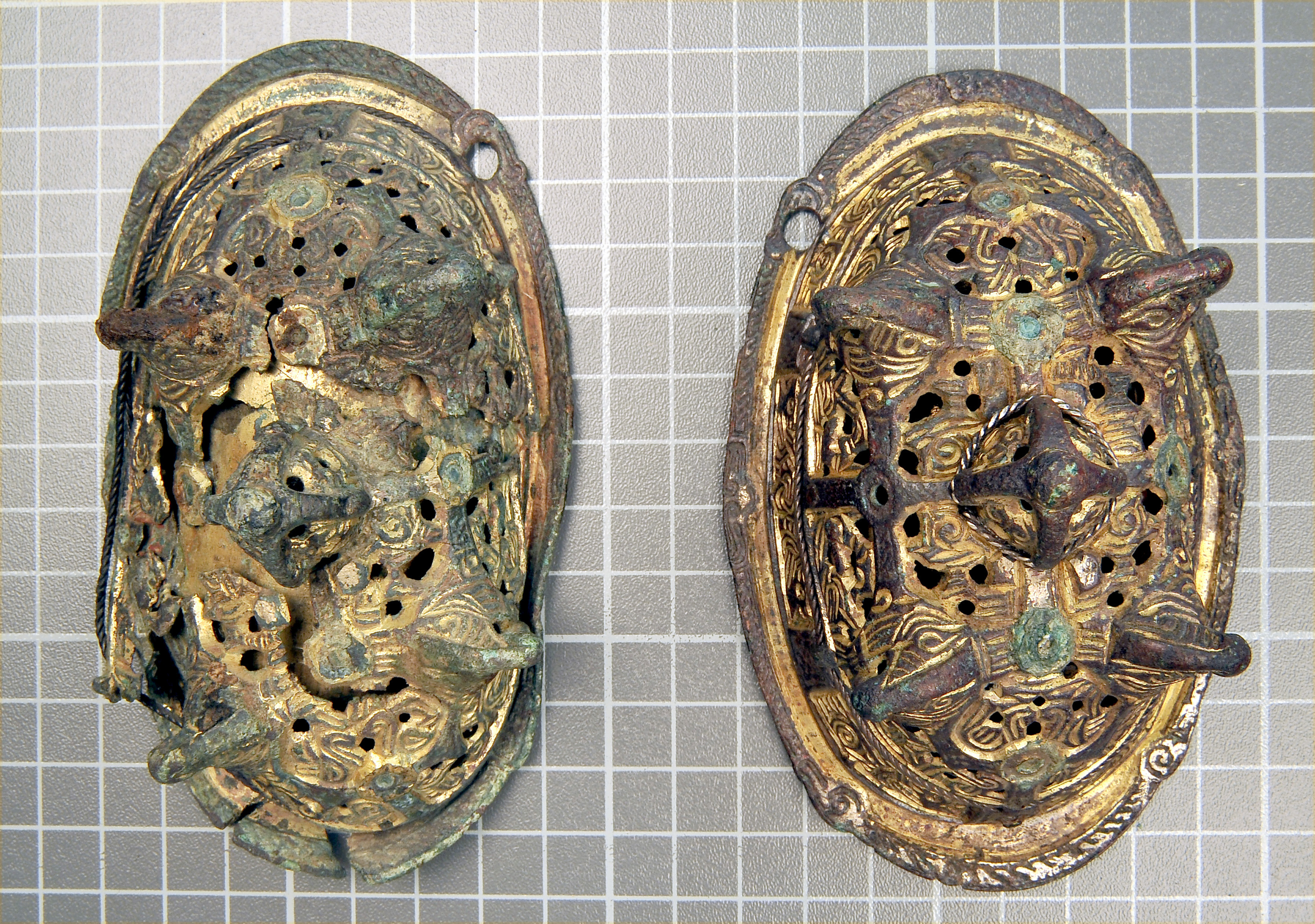 2 spännbucklor av typ P 52. Den ena skadad.