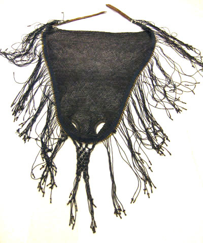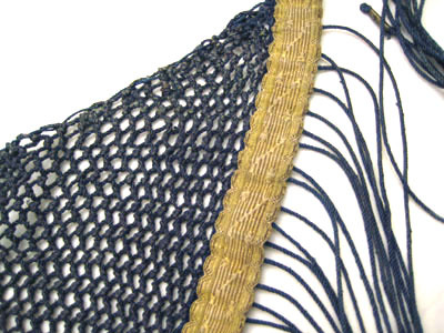 Hästtäcke. 6 cm lång snodd från blått nät. Hästbeklädnad enligt gula liggaren av ungersk ursprung. Täcket är flätad/knuten av blått silke och har utformning som ett nät och har två hål antagligen för ögonen. Beklädnaden är garnerad med guldgaloner samt fransar (510 mm långa) och alla fransar är skodda med mässingbleck. Täcket spänns ihop med läderrem och spänne.
