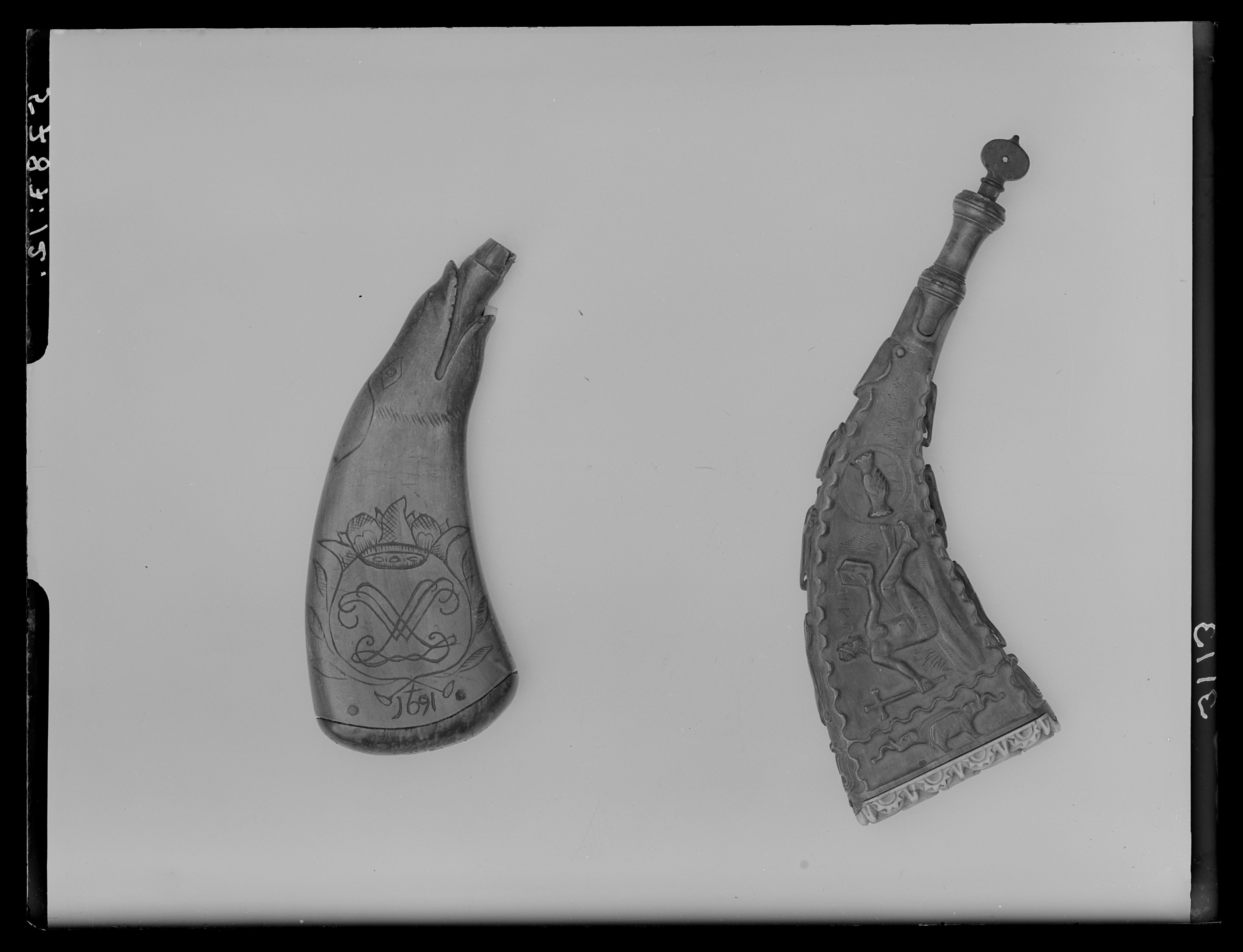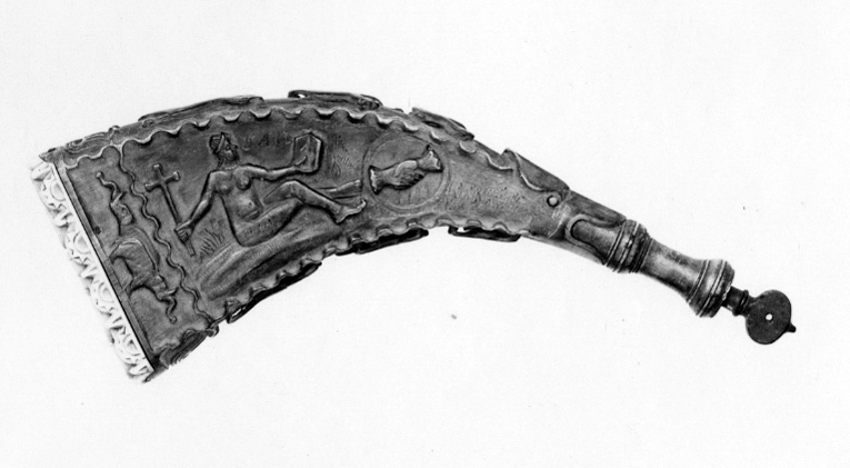 Fängkruthorn av gulbrunt, genomlysligt horn med snidad dekor, vågiga kantlister samt vågig list 20 mm från tjockänden, delvis i nästan fri relief. På ena sidan en sittande, naken mans(?)figur med långt, utslaget hår och halsband, i h hand ett kors, i v hand en bok, på h lår ristat:"H.H.V.", ovanför armen med boken: "I. A. U.". Framför mannen ett snidat handslag inom två ristade cirklar, ristat årtal 1722. Vid tjockänden två elefanter. På den andra sidan en sittande ängel med bok i handen, ristat:"WSP", dessutom hund? och fågel, vid tjockänden en påfågel. På vardera smalsidan tre hundar(?) samt ryck-ljusterliknande figur. Botten av elfenben med snidad dekor, blomma omgiven av rankor. Pip av svarvat, opak horn. Propp av bresiljeträ med oval platta med hål i mitten.