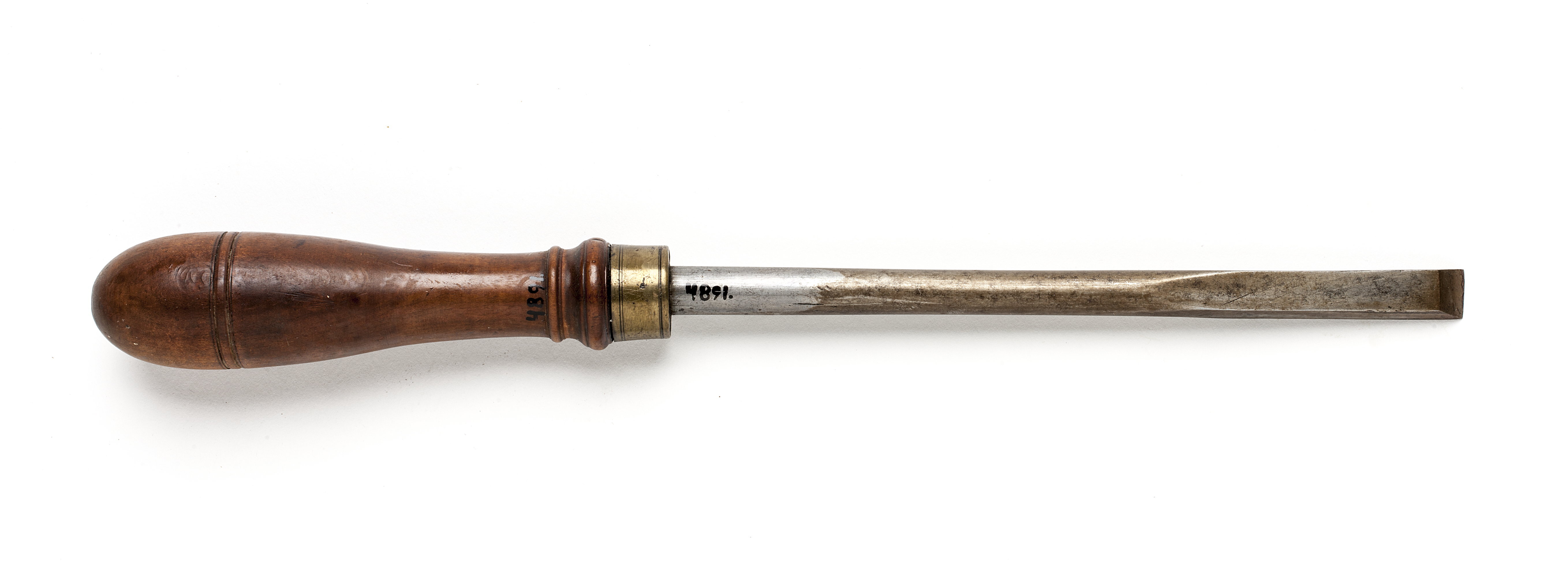 Rund klinga, i änden rektangulär genomskärning. Svarvat skaft av päronträ med två vulster nedtill ("skoklostertyp"). Mässingsring. Stämpel i skaftets ände vid fästet: "6" med stansar nr 5375.