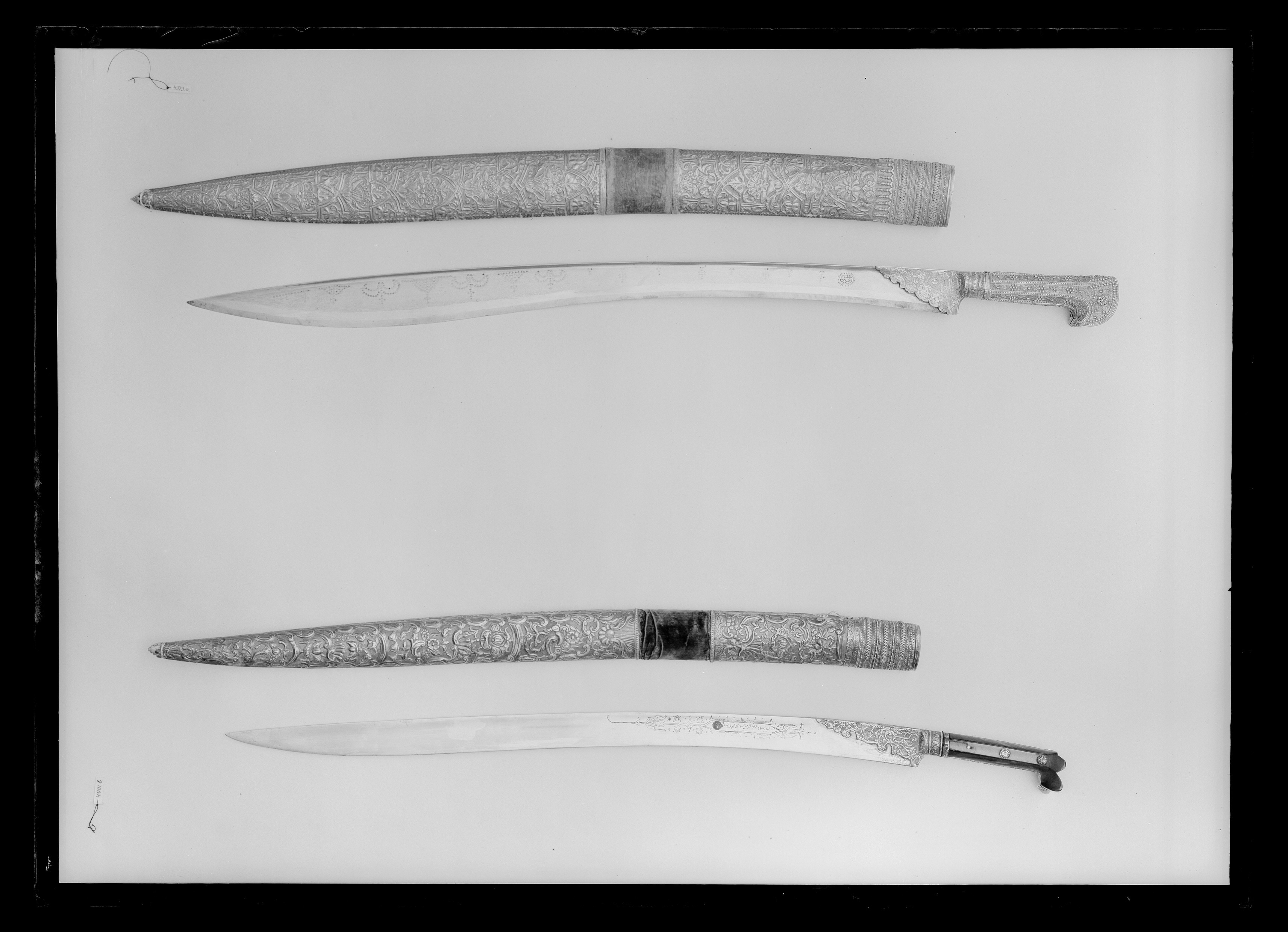 Fäste klätt med silverplåt ornerad med längsgående bårder av små förgyllda silverkulor. Mellan bårderna grupper om sju likadana silverkulor blomformigt ordnade. Mellan dessa blom-bladliknande ornament av tunn tvinnad silvertråd. Öronens ut och insida även med förgylld botten. 20 mm bred holk av silver övergående i ett över klingbasens rygg snett utskjutande, konturerat beslag med yttäckande ornering av graverade och punsade blad och blommor samt voluter. Klinga damaskerad på insidan med rektangulär stämpel inneslutande skrivtecken (otydliga) samt därefter utmed ryggen grupper med inslagna enkla stjärnor av silver, ordnade i trianglar, bågformer samt efter varandra.