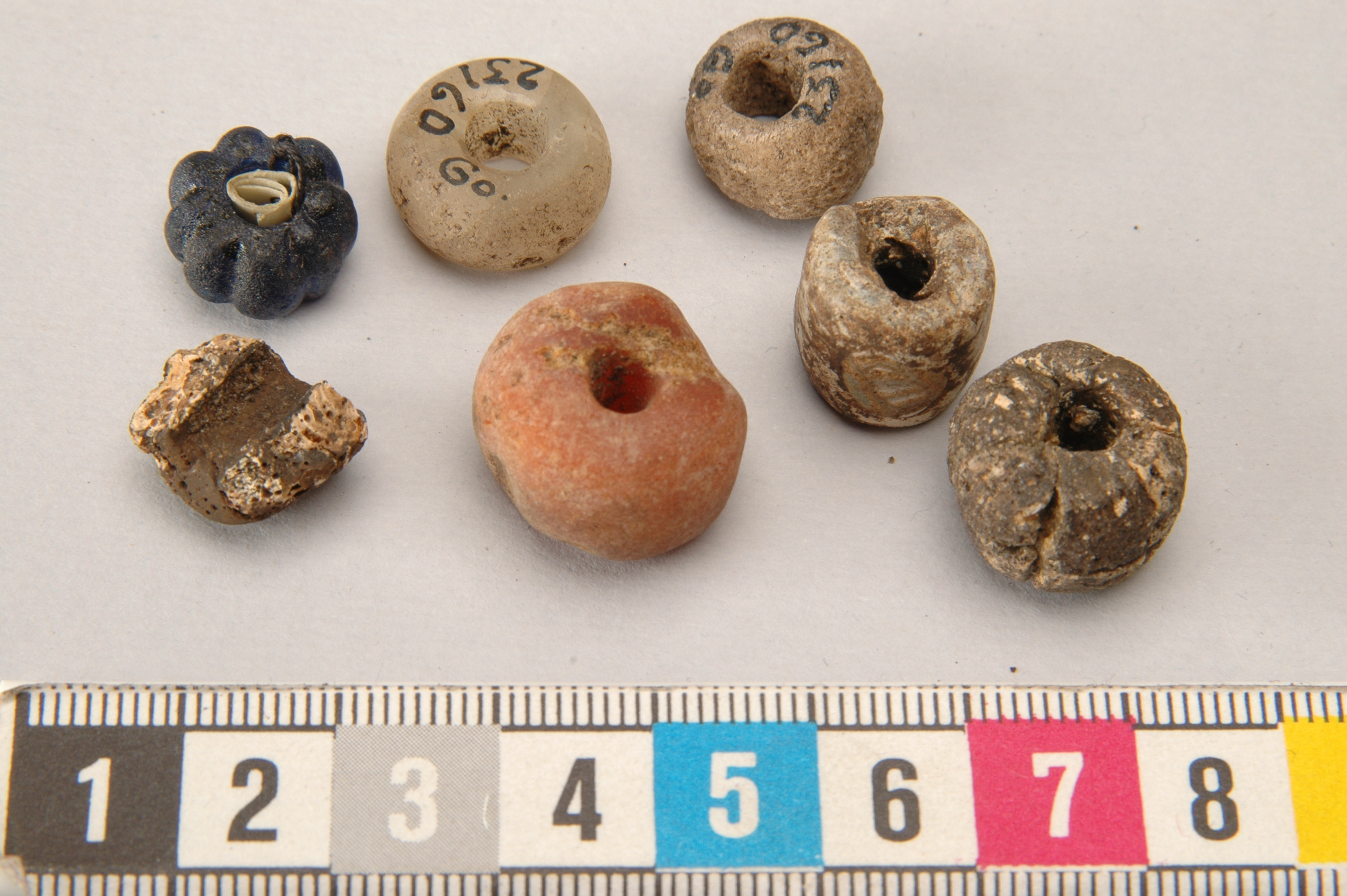 En pärla av bärnsten, en möjligen av sten. Tre av glaspärlorna starkt vittrade; av den ena endast hälften bevarad.