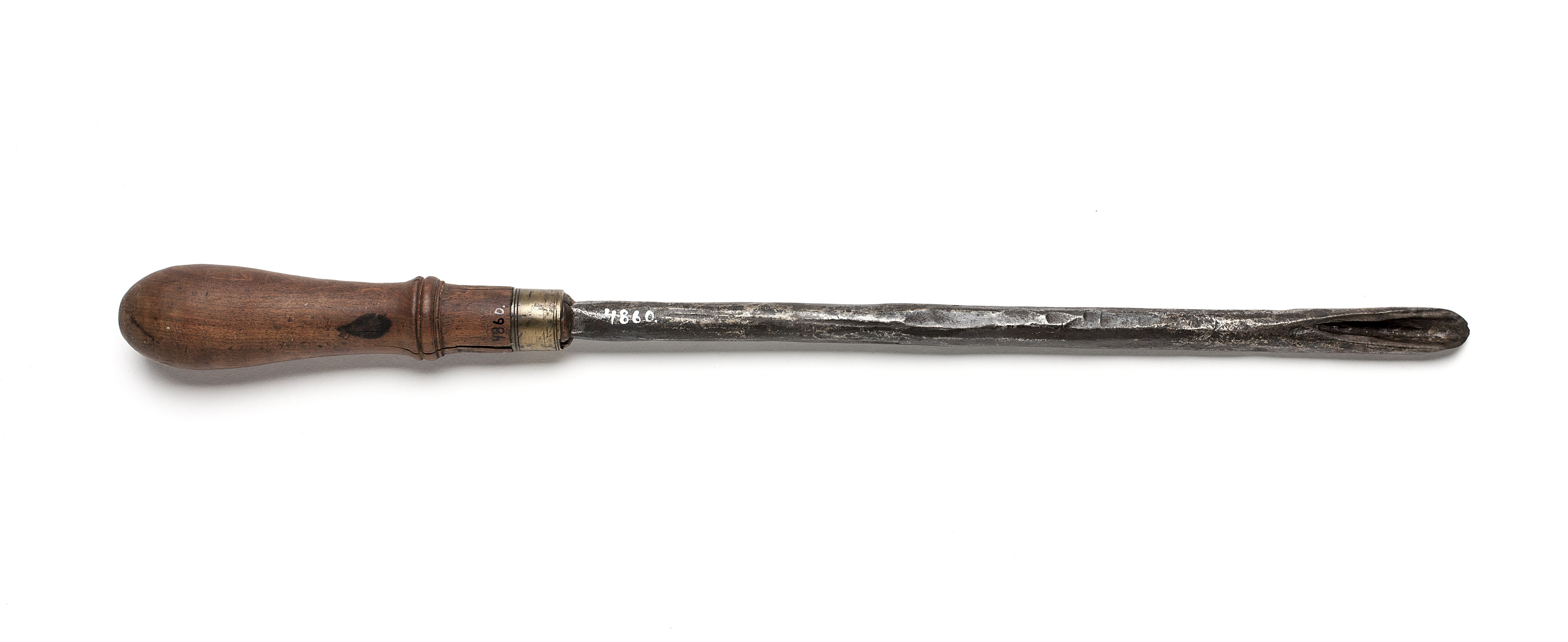 Grovt smidd, rund klinga. Svarvat skaft av päronträ med profilerad vulst mitt på. Mässingsring.