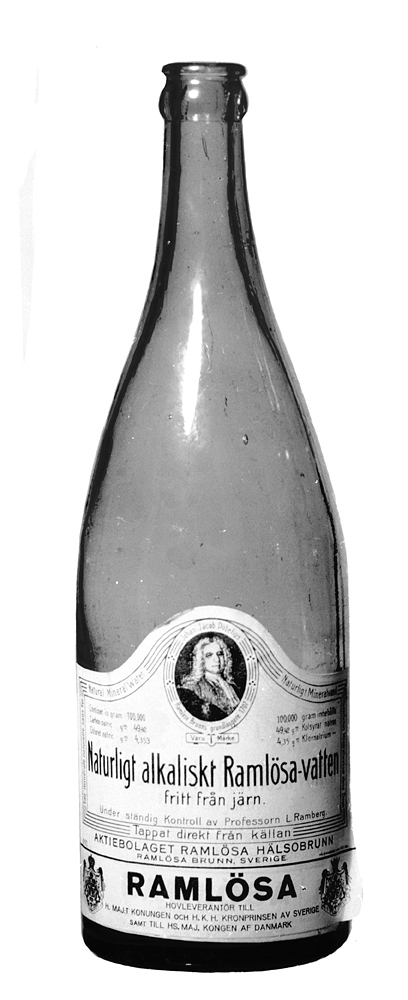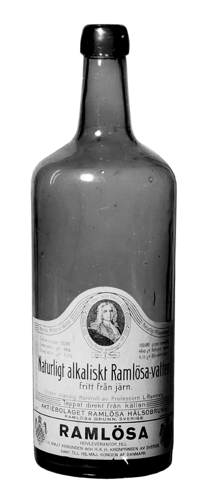 RAMLÖSA MINERALVATTEN tio flaskor, av två olika typer Av grönfärgat glas. Typ 1, fem stycken: Cylindriska, med tvärt indragen skuldra och smal cylindrisk hals, kring vars mynning en utstående flackstavig stärkring; nedtill en påklistrad vit etikett, varpå tryckt i svart, upptill "Naturligt alkaliskt Ramlösa-vatten"; nedtill RAMLÖSA m. m. Upptill bröstbild av Johan Jacob Döbelius, Ramlösa brunns grundläggare 1707, som här utgör varumärke. Höjd: 26,7 cm.; diameter: 8,6 cm. Typ 2, fem stycken: Cylindrisk, med sluttande skuldra, övergående i en smal hals, kring vars mynning en utstående flackstavig stärkring samt ovanför denna en utstående stavformig ring till fäste för blykapsel, nedtill etikett som på typ 1. Höjd: 27,5 cm.; diameter: 8,6 cm.