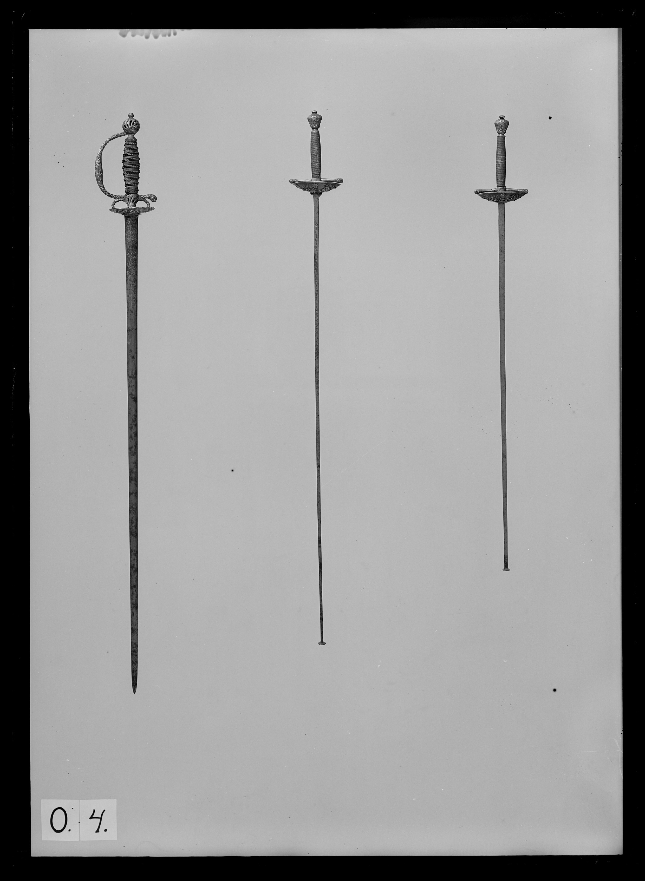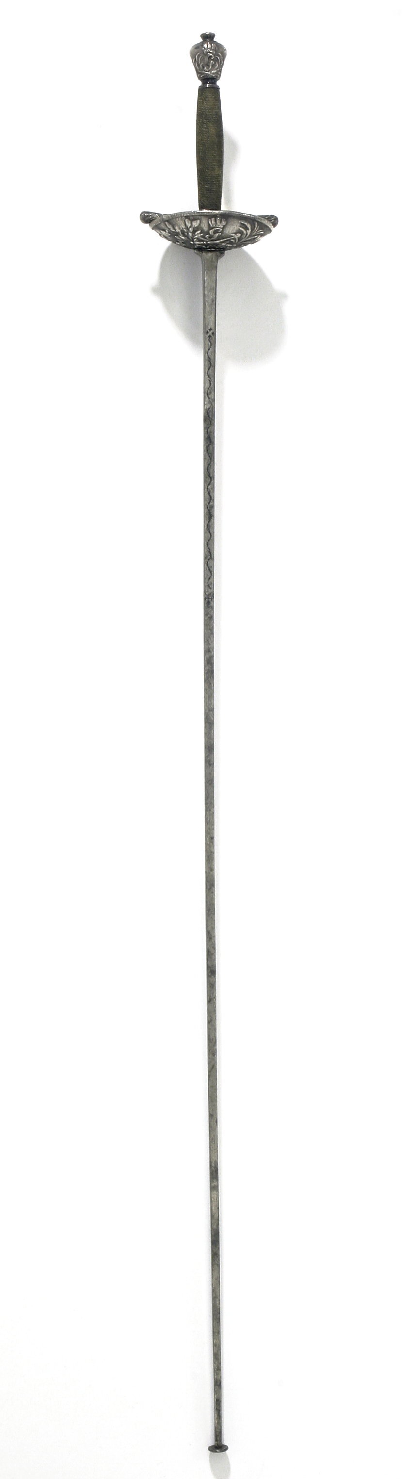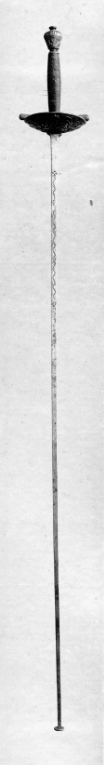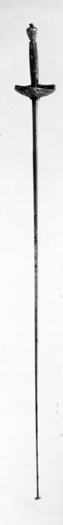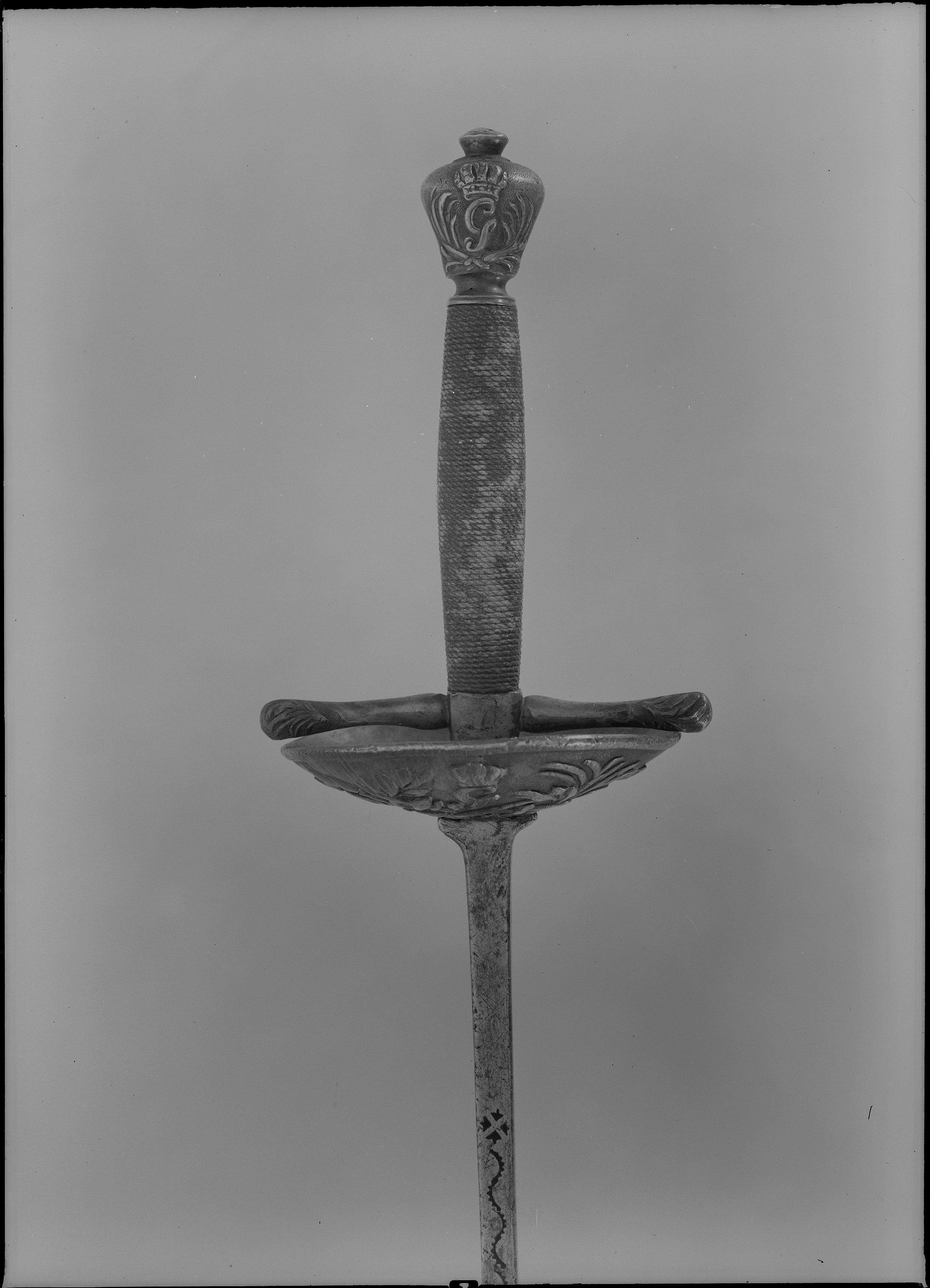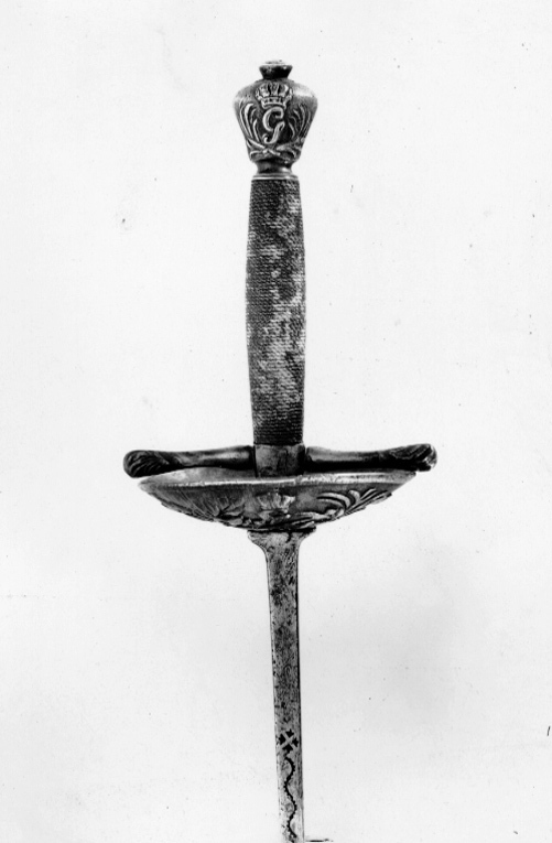 Fäste av reliefsnidat och ciselerat silver. Knapp omvänt päronformig, på ut- och insidan ett G i skrivstil under en kunglig krona, omgivet av två palmkvistar. Parerplåt rundoval, skålformig, på utsidan dekor i form av en korslagd spira och ett svärd, tre kronor, palm och lagerkvistar samt som centralt motiv ett krönt G som på knappen. (Varje ornament återfinns två gånger). Kavel lindad med segelgarn. Klinga rak med rektangulärt tvärsnitt samt på starka delens ut- och insida en 154 mm lång våglinje. Udden med en fastnitad, rund skiva, d: 12 mm. Vapnets dimensioner tyder på att det använts av Gustav III under hans gossetid.