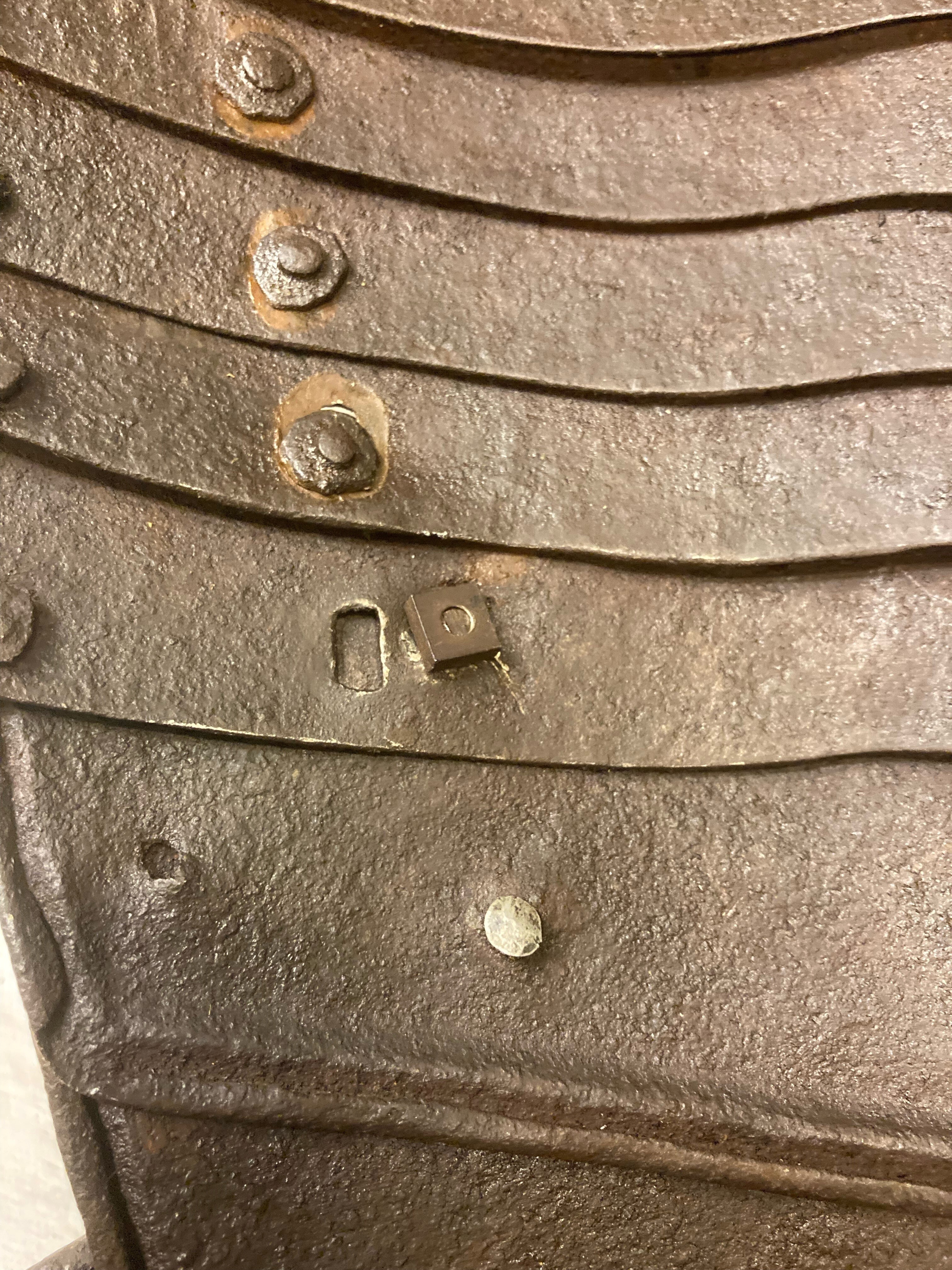Lång tassett/taska med knäbuckla bestående av 22 delar. De 18 lamellerna ovanför knäbucklan har en profilerad vågformig och spetig överkant som markeras av dekorativa, förgyllda nitar samt tre längsgående mejslade linjer. De två lamellerna nedanför knäbucklan med motsvarande dekor i nederkant. Ytter och innerkanter med inåt omvikt, rundsmidd kant med mejslad repdekor. Rörlig knäled bestående av knäbuckla samt fyra ovanförliggande och tre nedanför liggande lameller, nitade vid varandra i ytter- och innerkant. Knäbucklans vinge med inåt omvikt, rundsmidd kant med mejslad repdekor. Innanför denna tätt sittande förgyllde dekorativa nitar. Därefter tre mejslade parallella linjer. Mitt på musslan en ring av 11 förgyllda nitar, varav två har fäst knäledsremmen. Från cirkeln till knäbucklans mitt en 130 mm lång, i ändarna avsmalnande, driven vulst med mejslad repdekor. Mitt fram på knäbucklan en lodrätt vulst med mejslad repdekor i ett nedsänkt mandelformat parti. Nedersta lamellen uppdragen i en spets mitt fram, ovanför denna en sju-bladiga, förgylld, driven blomma med huggna strålar. Knäledens översta lamell är något större och dekorera med motsvarande blomma. Knäledsdelen är avtagbar. Dess översta lamell är försedd med hål som på lårdelens nedersta lamell motsvaras av nitar, varav den inre är vridbar. Lårdelens nedersta lamell har en inåt omvikt, rundsmidd nederkant med mejslad repdekor. Det saknas en lamell ovan den sista lamellen. Den översta lamellen är försedd med två hål som tappas in bukskenans nitar och låses med hake. Haken har varit försedd med en nu saknad skruv för att säkra att den inte glider ur låsläge. Lårdelens lameller är i ytterkant nitade direkt i varandra i avlånga hål, för ökad rörlighet. På insidan, mitt fram sitter lamellerna delvis samman på ursprungligt läder och längs innerkanten är numera lamellerna också nitade direkt i varandra. Lamellernas innerkanter har ursprungligt nitats i läder för att öka rörligheten. I ytterkanten nitrad för läder som ett dekorativt band kan fästas i. På den sjätte lamellens ytterkant en nit som troligen hållit rem som hållit fast delen mot lårets baksida. Lamellernas nederkant är vågformig av materialbesparande skäl. Dekoren överensstämmer med övriga rustningsdelar