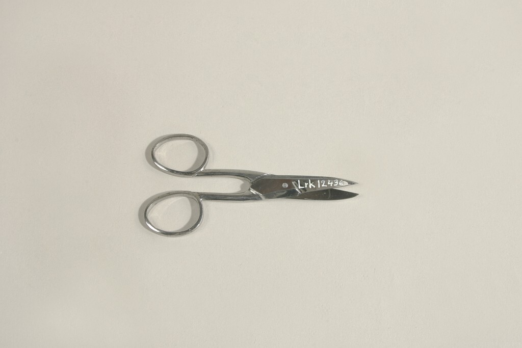 Sax av polerat stål med bladens baksidor räfflade. Skruvhuvudet räfflat. På ena skänkeln otydlig stämpel: "BKOO - // et -ES" och en klocka.