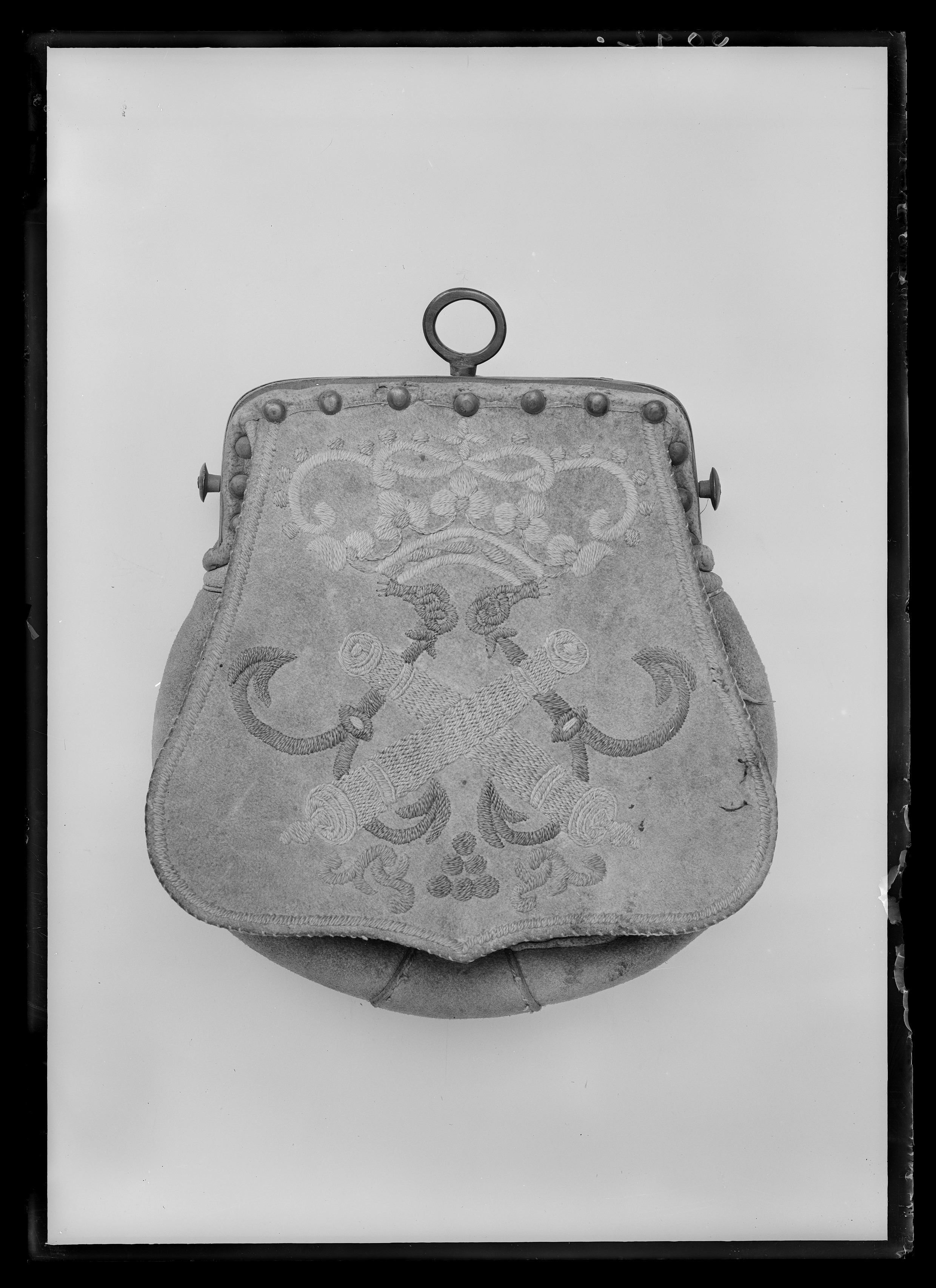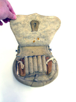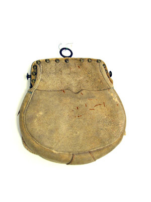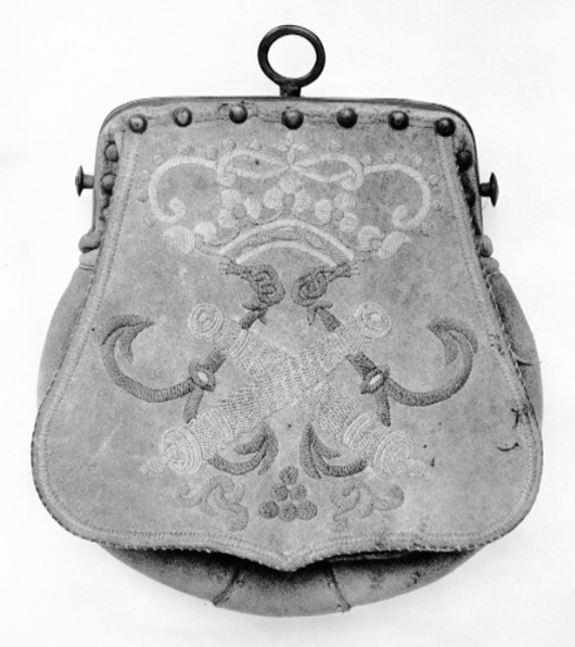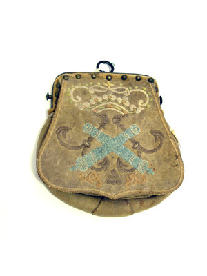 Väska av sämskat läder, upptill plan, nedtill vidgad och rundad med löstlock, täckande framsidan och med broderier av silkegarn. Sluten krona av naturfärgat och grönt silke, korslagda kanoner av ljusblått silke framför två från varandra vända ankare av ljusbrunt silke. På baksidan öppen ficka. Innanför det öppna locket formsytt fodral för fem patroner med tomhylsor av stål, vid sidorna fastsydda små påsar med dragsko av läder. Upptill bygel av mässing med knappformiga hållare på hals bäranordning. Bygeln fastsatt med mässingstännlikor. Vid låset ringformigt handtag av koppar.