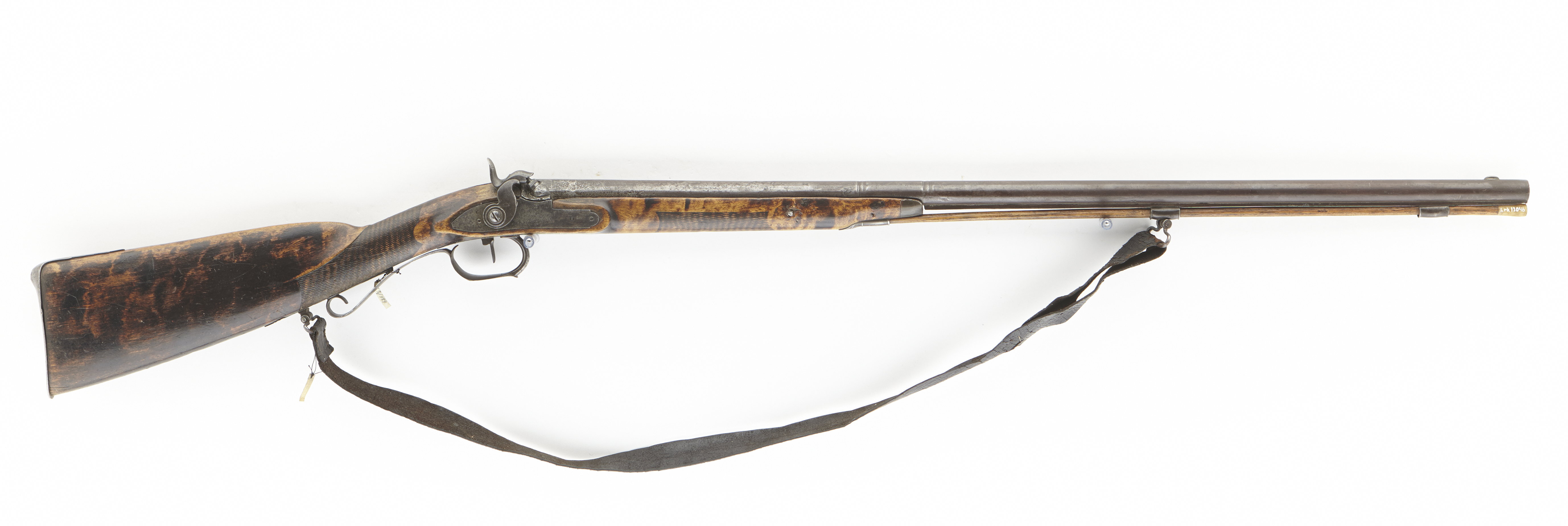 Rund, slätborrad pipa av stål med fasad och åttsidig kammare. Pipan är baktill förlängd, svansskruv och plundertrumma i ett stycke med den förlängda pipdelen. På pipan där framstocken slutar är på ovansidan två infilade ringar, 45 mm från varandra. På pipans undersida finns en spång, vilken är stöd för laddstocken. På spången två rörkor av stål, den bakre är fäste för rembygel. Riktmedel: Sikte infilat i svansskruvbladets främre del, inlaxat stolpkorn av silver. Fästning: Ett häfte. Pipan fäst med krysskruv samt ett pipstift. Slaglås med plant låsbleck, baktill utdraget i en tvär avskuren spets, fram avrundat. Framför hanen ingraverat "A. G. Lindfors". S-formig hane med rundad kropp och ring runt nötskruven, nätskuret tumgrepp. Länk nöt-slagfjäder, fäst med en skruv i nöten. Studeln fäst med två skruvar, varav den ena fäster stången. Stångjäder fäst med en skruv. Fästning: Två låsskruvar. Avtryckarbleck med avtryckaren monterad i två uppstående vingar på blecket, blecket profilerat. Avtryckaren spetsig nedåt samt med välvd framsida och plan baksida. Halvstock av mörkbetsad björk med svängd undersida och nätskuren kolvhals. Kindstöd på vänster sida med rundade kanter. Framstocken nätskuren mittpå. Bakplåt av stål med utskjutande häl, spets på kolvryggen, fäst med två skruvar. S-format låsskruvbleck av stål med en bakåtriktad vinge vid den bakre skruven. En rörka av stål där laddstocksrännan går in i stocken. Pålimmat näsband av horn. Varbygel av stål infälld i kolvens trä. Främre fästpunkten på bygeln är med en gängad tapp, fäst i avtryckarblecket. Den bakre armen består av en vid bygelns bas utgående arm, vilken är upprullad i änden samt förenad med en i kolven infälld, plan, profilerad platta. Varbygeln är baktill fäst med en grov skruv, vars huvud utgör bakre rembygeln. Tillbehör: Laddstock av trä, konisk med ändbeslag av horn.
