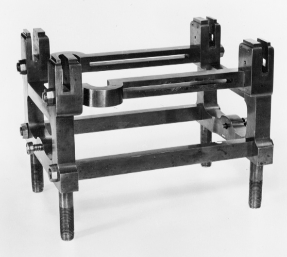 Rektangulär ram som står på bordet nr 8110, fastskruvad vid detta med två fasta skruvar på ramens undersida. I varje hörn finns ett vågrätt, fyrsidigt hål för stavarna nr 8022 och nr 8023. Mitt på ramens undre sida finns en förtjockning med ett vågrätt, gängat hål för sammankoppling av dockan med fjäderbelastningen nr 8046-8056. Upptill, i var ände sitter en kloss (35,6x41,7x41,7) med en lodrät slits i vilken lagret nr 8026 är monterat. Vågrätt genom var kloss går ett gängat hål för skruvarna (l 78,9-81,0) nr 8034 och två hål för stiften nr 8018.
