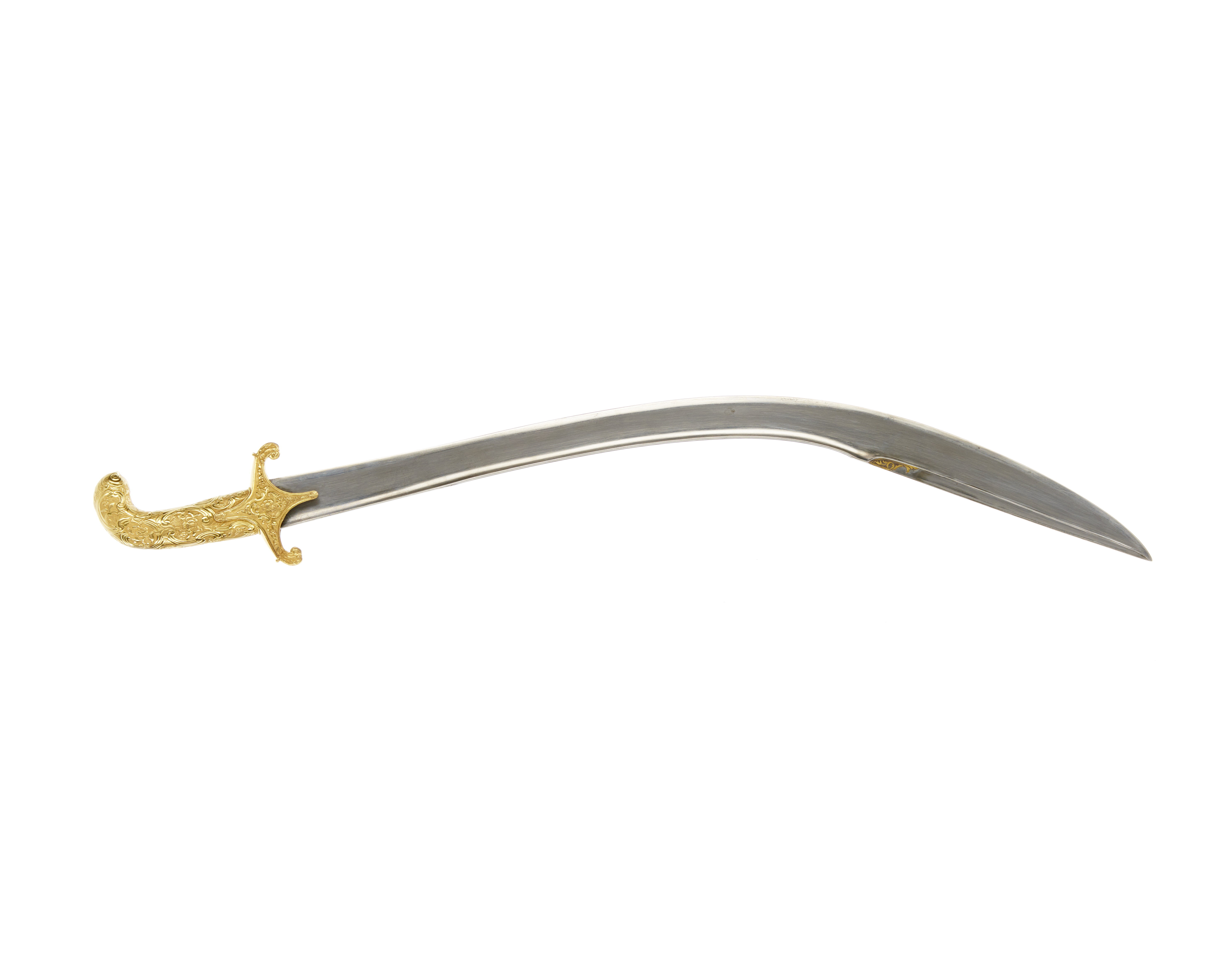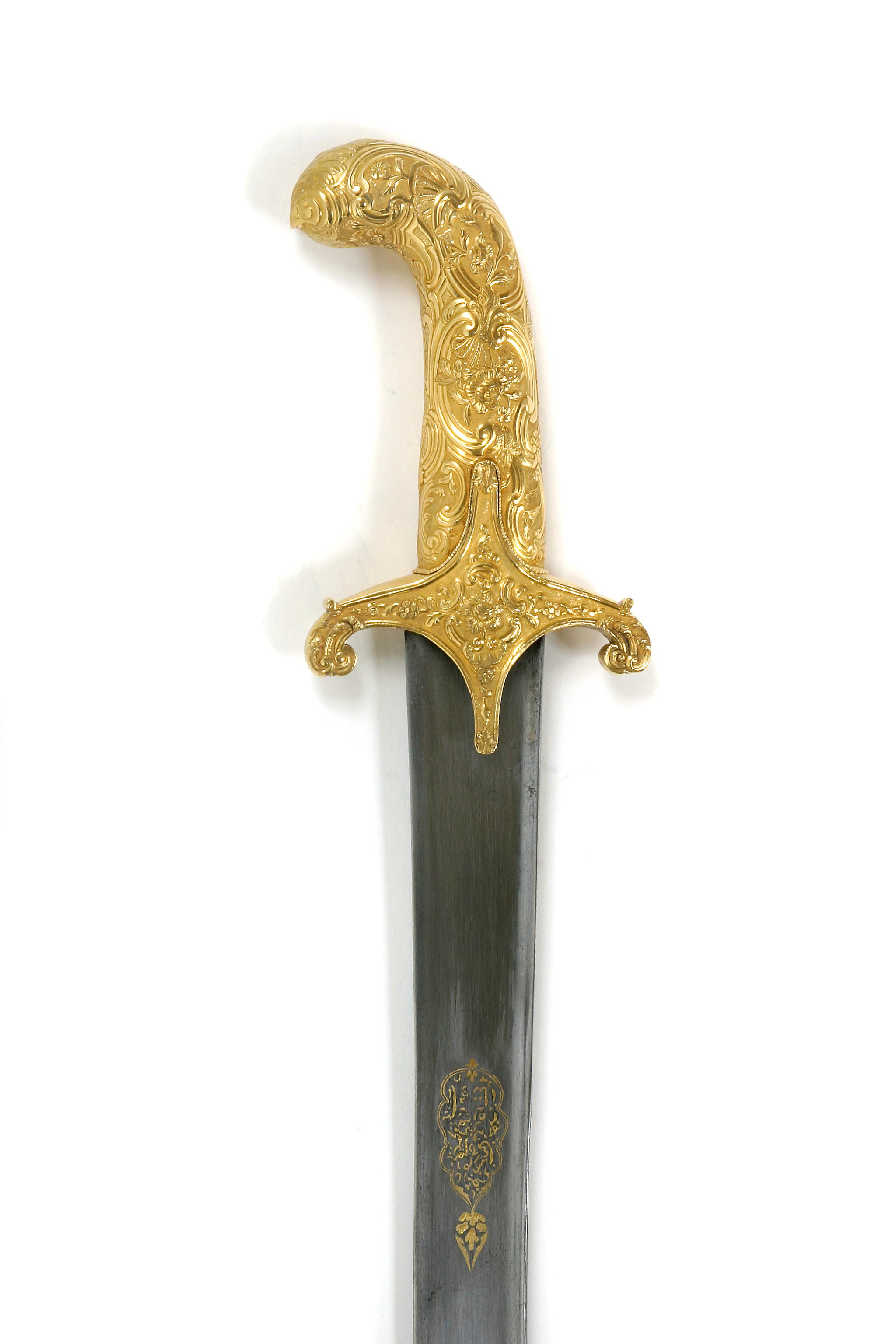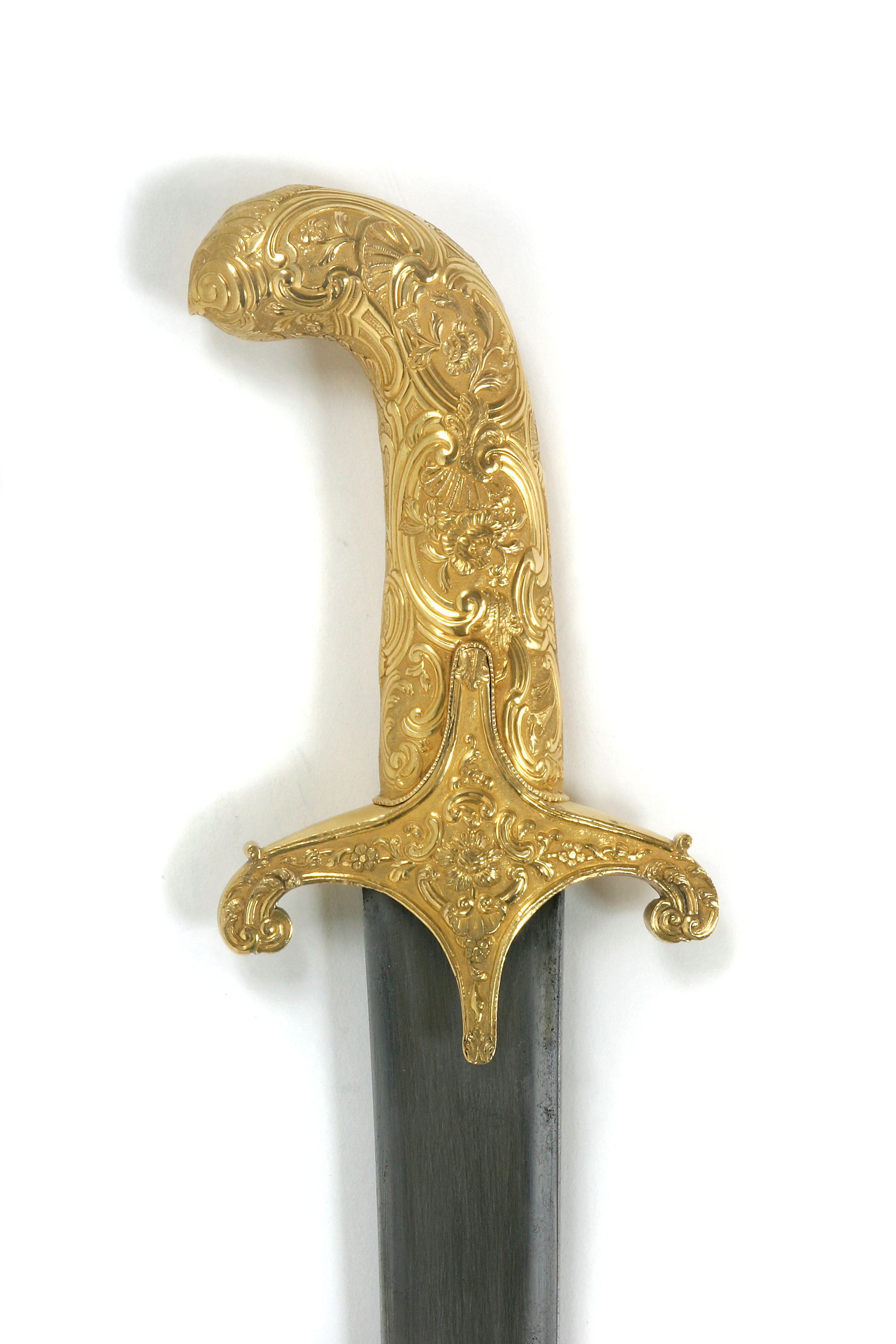 Korsformigt fäst (utan handbygel), i sin helhet beslaget med driven, snidad och ciselerad plåt av guld. Korta, bågformigt nedåtböjda parerstänger, utgående från ett kryss, vars mittparti är vertikalt utdraget till styrskenor. Rik och kraftig reliefornering i nyrokoko. Kavel och pareranordning tillverkade i två olika stycken. Kaveln med ovalt tvärsnitt och framåtböjd överdel. Klinga fint damaskerad, polerad och böjd samt eneggad med 240 mm lång jelman. På utsidan av starka delen i påslaget guld en konturerad, långsträckt kartusch med arabisk inskription, kartuschen avslutad med ett bladliknande ornament. På båda sidor vid bakre kanten av jelmanens överdel ett slingrande bladornament i påslaget guld. Ryggsidan med början ca 130 mm från fästet fram till jelmanen svagt vinkelformigt med förhöjda kanter och mittås.