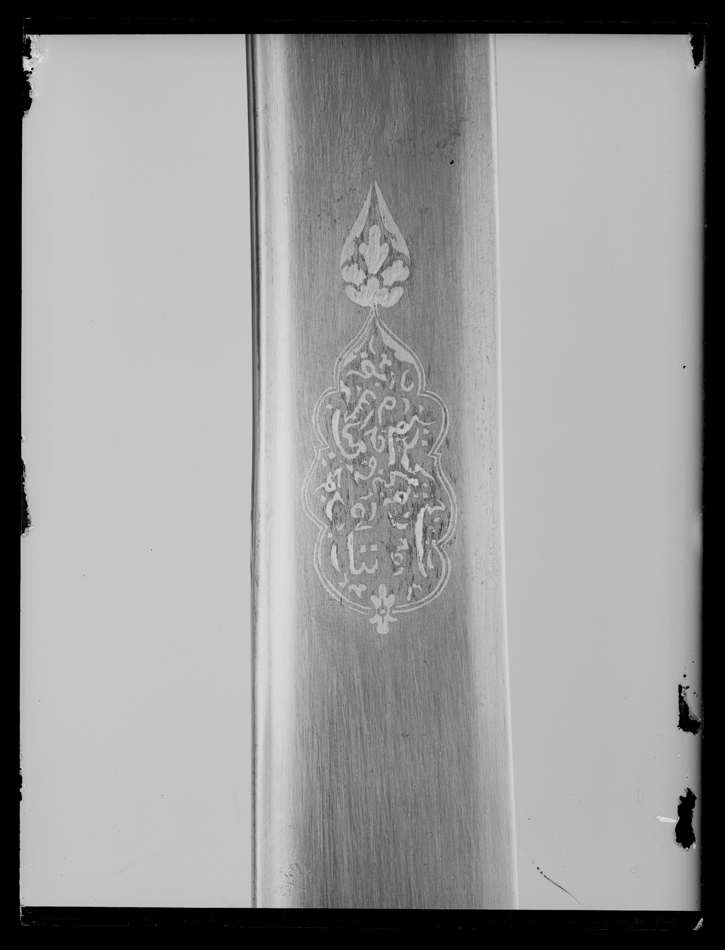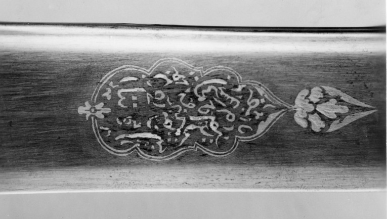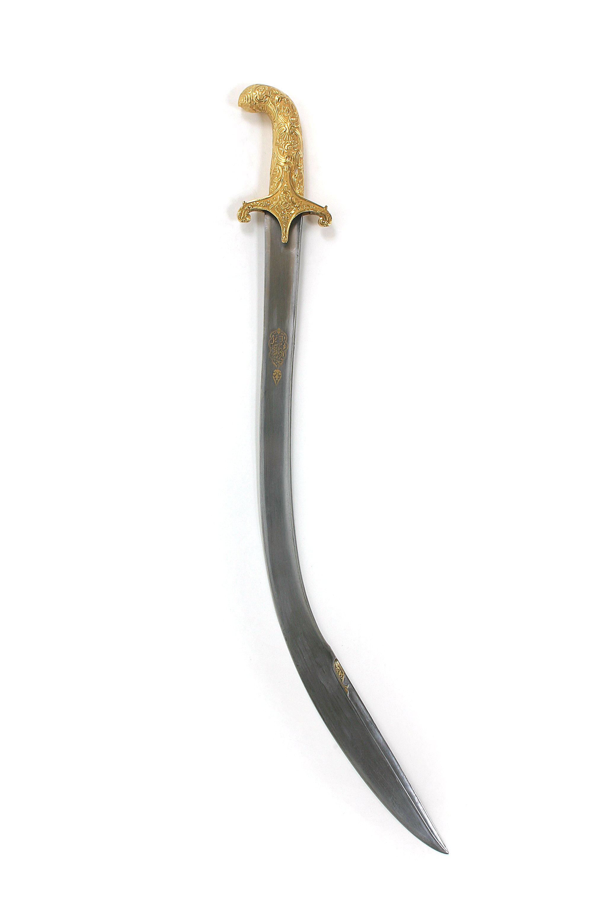 Korsformigt fäst (utan handbygel), i sin helhet beslaget med driven, snidad och ciselerad plåt av guld. Korta, bågformigt nedåtböjda parerstänger, utgående från ett kryss, vars mittparti är vertikalt utdraget till styrskenor. Rik och kraftig reliefornering i nyrokoko. Kavel och pareranordning tillverkade i två olika stycken. Kaveln med ovalt tvärsnitt och framåtböjd överdel. Klinga fint damaskerad, polerad och böjd samt eneggad med 240 mm lång jelman. På utsidan av starka delen i påslaget guld en konturerad, långsträckt kartusch med arabisk inskription, kartuschen avslutad med ett bladliknande ornament. På båda sidor vid bakre kanten av jelmanens överdel ett slingrande bladornament i påslaget guld. Ryggsidan med början ca 130 mm från fästet fram till jelmanen svagt vinkelformigt med förhöjda kanter och mittås.