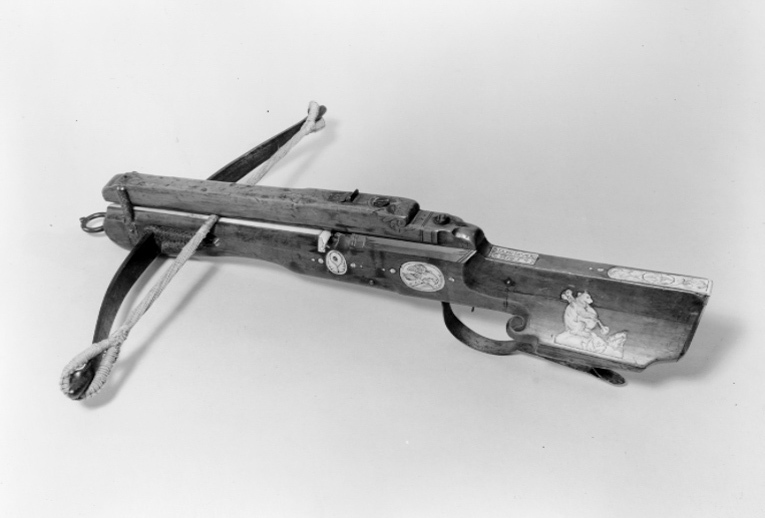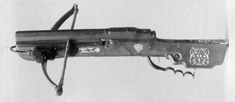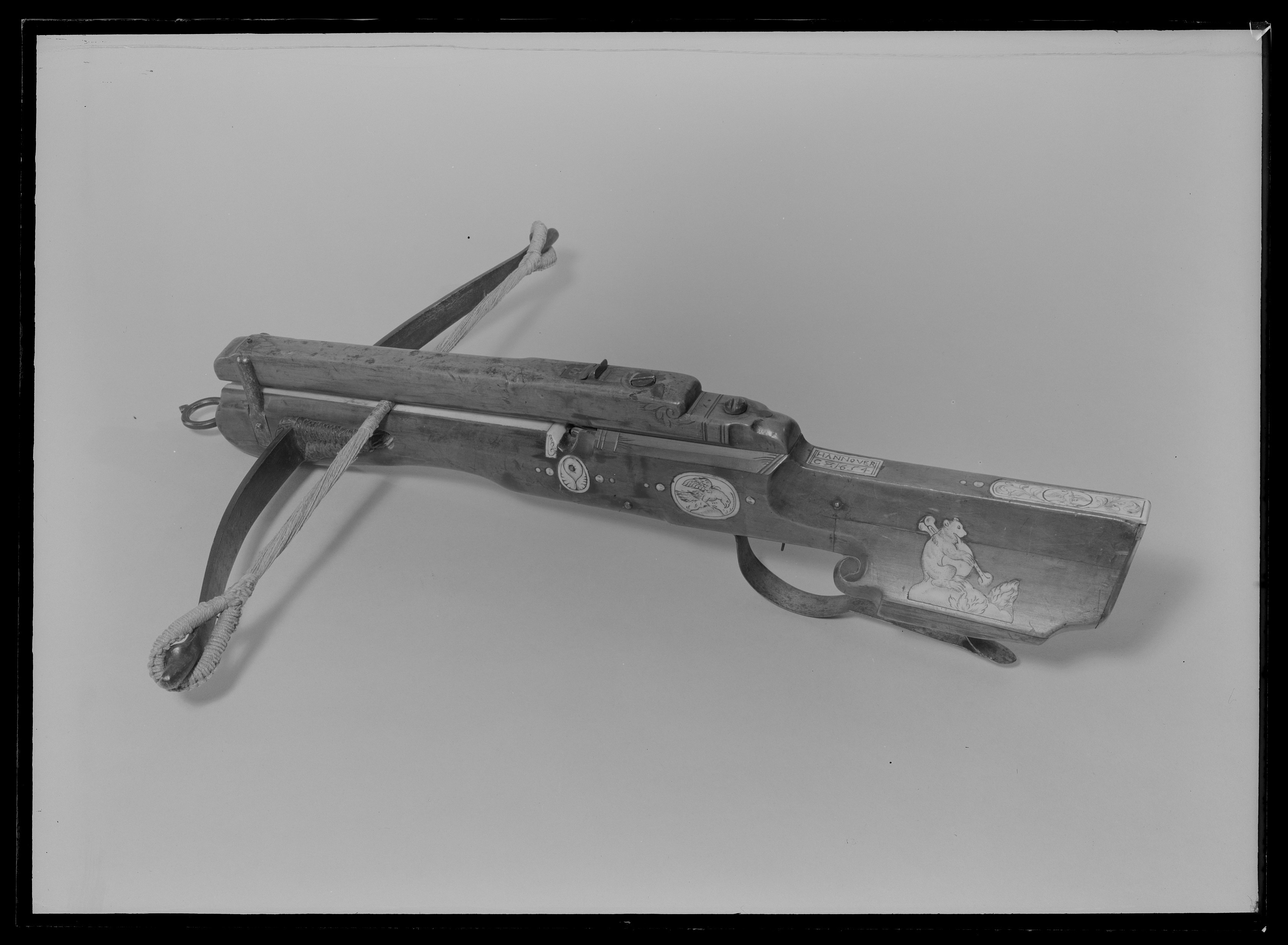 Båge av stål fäst vid stocken med snörning av hampa som är övermålad med brunt. Sträng av hampa eller lin. Lås med snälltryck och nöt med stränghållare av stål. Stock av päronträ med övertäckt pilränna av ben. Övertäckningen av trä med kvadratisk genomskärning, delvis med fasade kanter, fäst vid stocken med två skruvar baktill och två stålskenor, en på vardera sidan om framänden. Övertäckningen ornerad med skurna bladornament. På bakre delen och på översidan framtill. Undersidan av övertäckningen klädd med ben. Stolpsikte med klaffsikte och stolpkorn av stål. Kolv av tysk typ med snidad volut intill vingen. Bakplåt av ben. Kolvlådelock täckt av vit benplatta graverad med oval och bladmotiv. På anslaget graverad beninläggning i form av björn som spelar på säckpipa. På kolvryggen inlagd benplatta och längre fram på stocken rektangulär benplatta med "HANNOVER // C Z 1654". På stockens sidor graverade benplattor bl. a. oval med fågel. Grunt brett urtag för handen på framstockens undersida. Varbygel av stål. Framtill rund ring av stål.