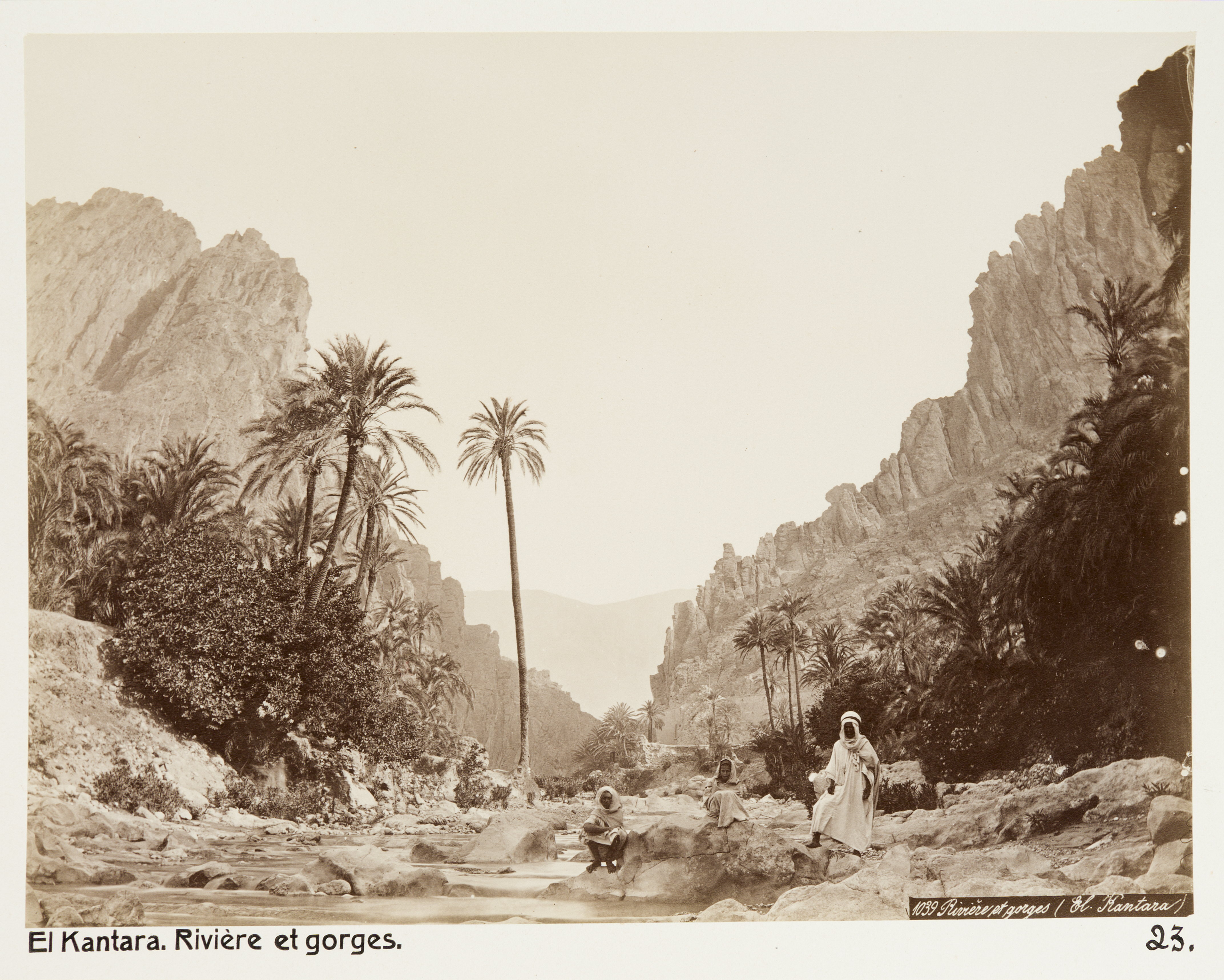 El Kantara, Algeriet. Flod och raviner. Bilden är en dubblett till LXVI:F.30. Bilderna med inventarienummer LXVI:K.H.01.-137. är inköpta av Johanna Kempe, f. Wallis, i Alger, Biskra, Tunis, Constantine, Oran och Blidah vid hennes vistelse i nämnda städer tillsammans med sin dotter och svärson, Wilhelmina och Walther von Hallwyl, dotterdottern Irma samt fröknarna Caroline Pflaum och Ida Uhse under deras resa genom Algeriet och Tunisien samt åter över Schweiz 11 februari - 19 maj 1889. Förestående uppgifter lämnade med ledning av fröken Ida Uhses Reseanteckningar. Vissa av bilderna är dubbletter till bilder i inventarienummerserien LXVI:F.01.-138. som köptes in av Wilhelmina von Hallwyl under samma resa.