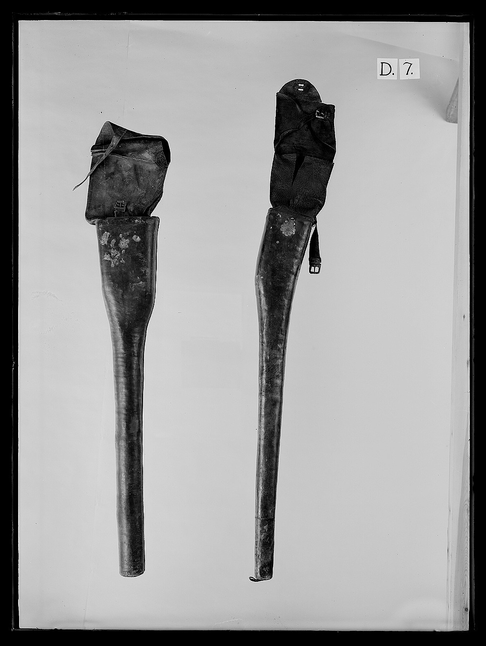 Fodral av svartbrunt läder, söm längs ena sidan samt runt framänden, med förstyvning, l: 1060 mm, därav en rörformig del, l: ca 730 mm, d: ca 70 mm i framänden. Framänden rund med ett runt, uppslitet hål, d: ca 20 mm. Röret baktill övergående i en fyrsidig del, l: ca 250 mm, b: ca 110 mm, h: ca 180 mm i bakänden. På ena sidan vid övergången rund-kantig del klistrat järnvägsetiketter med text: " Wadsbro ", " fr. Töreboda // 2709 " (2 st), svart tryckt samt en med röd tryckt text: " Öfvergångsstation ", därnedanför skrivet med blyerts: " Flen ". Bakom de förstyvade delen är lädret utdraget ytterligare ca 400 mm på ena sidan och 230 mm på den andra, vid den kortare delen fastsytt en infällsflik, l: ca 110 mm med rundad kant. På den längre delen fastsytt en läderrem, l: 250 mm, b: ca 20 mm med sju spännhål, därav tre förenade med slits. På den kortare delen ett rektangulärt spänne av mässing. På remmens ände samt på den förstyvade, kantiga delen på spännesidan rester av röda lacksigill efter förslutning.