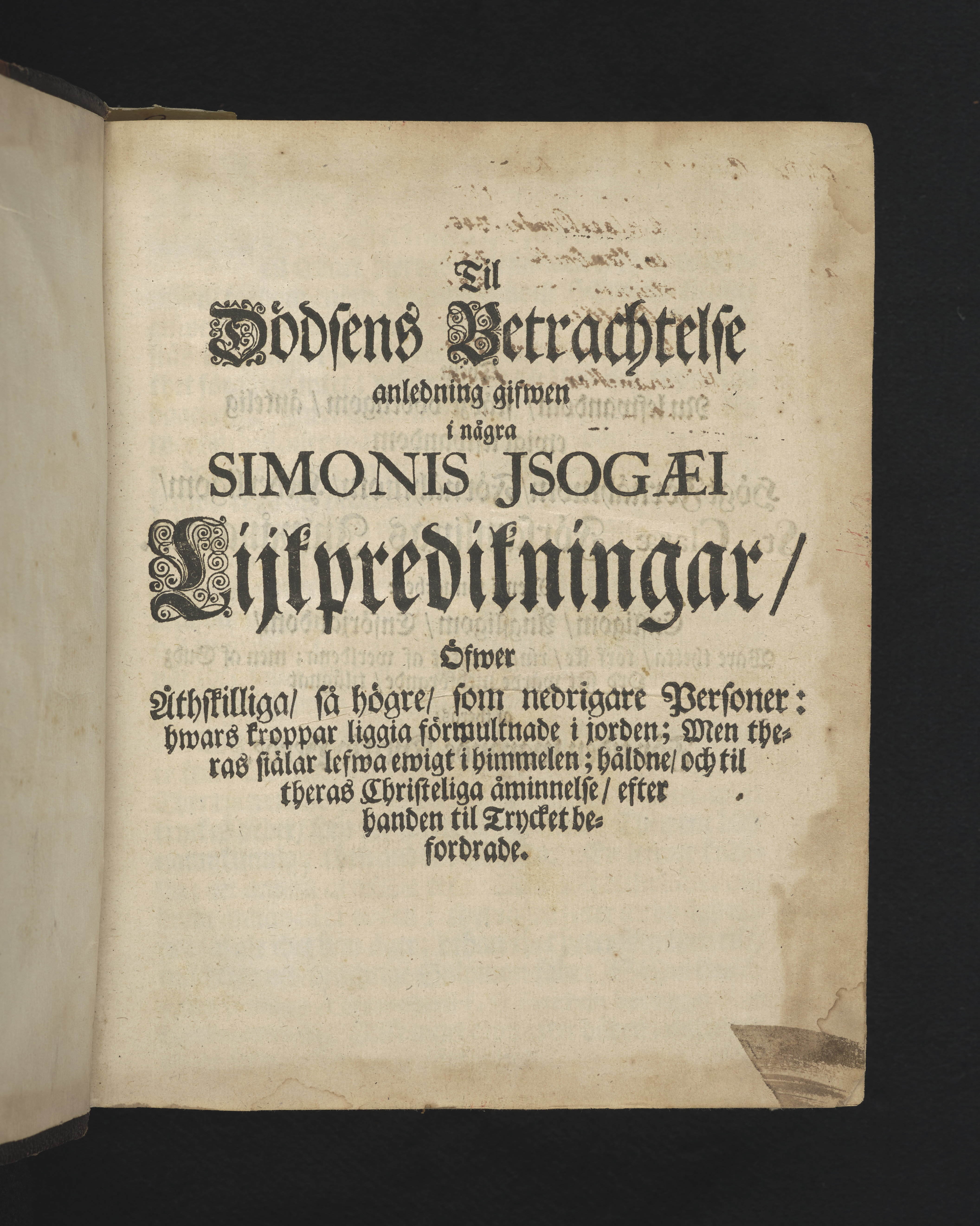 Til dödsens betracktelse anledning gifven i några Simonis Isogai lijkpredikningar, öfwer åthskilliga, så högre, som nedrigere personer: hwars kroppar liggia förmultnade i jorden; men theras siälar lefwa ewigt i himmelen; håldne, och til theras christeliga åminnelse, efter handen til trycket befordrade.