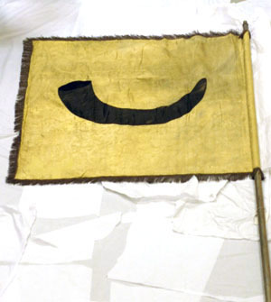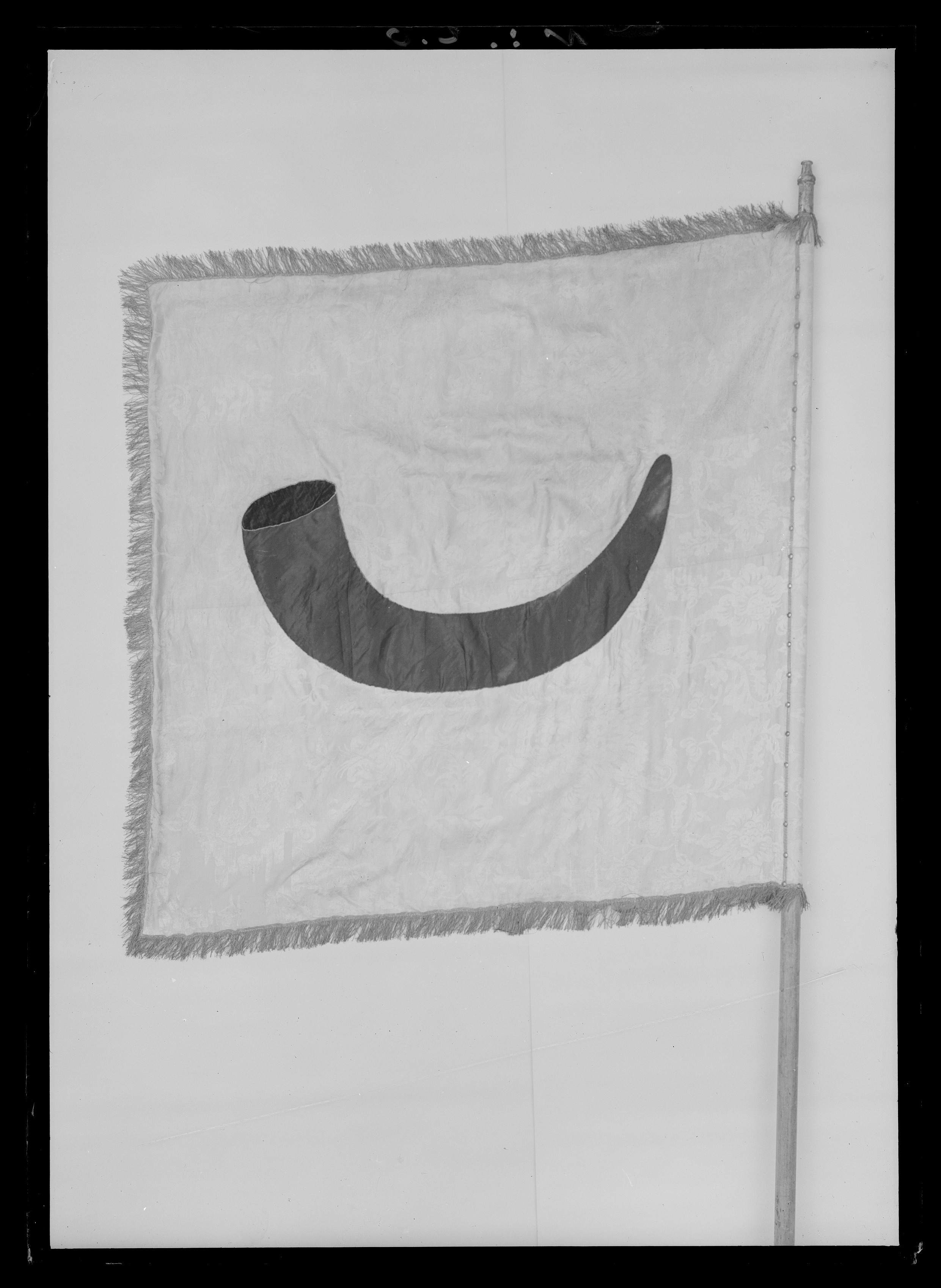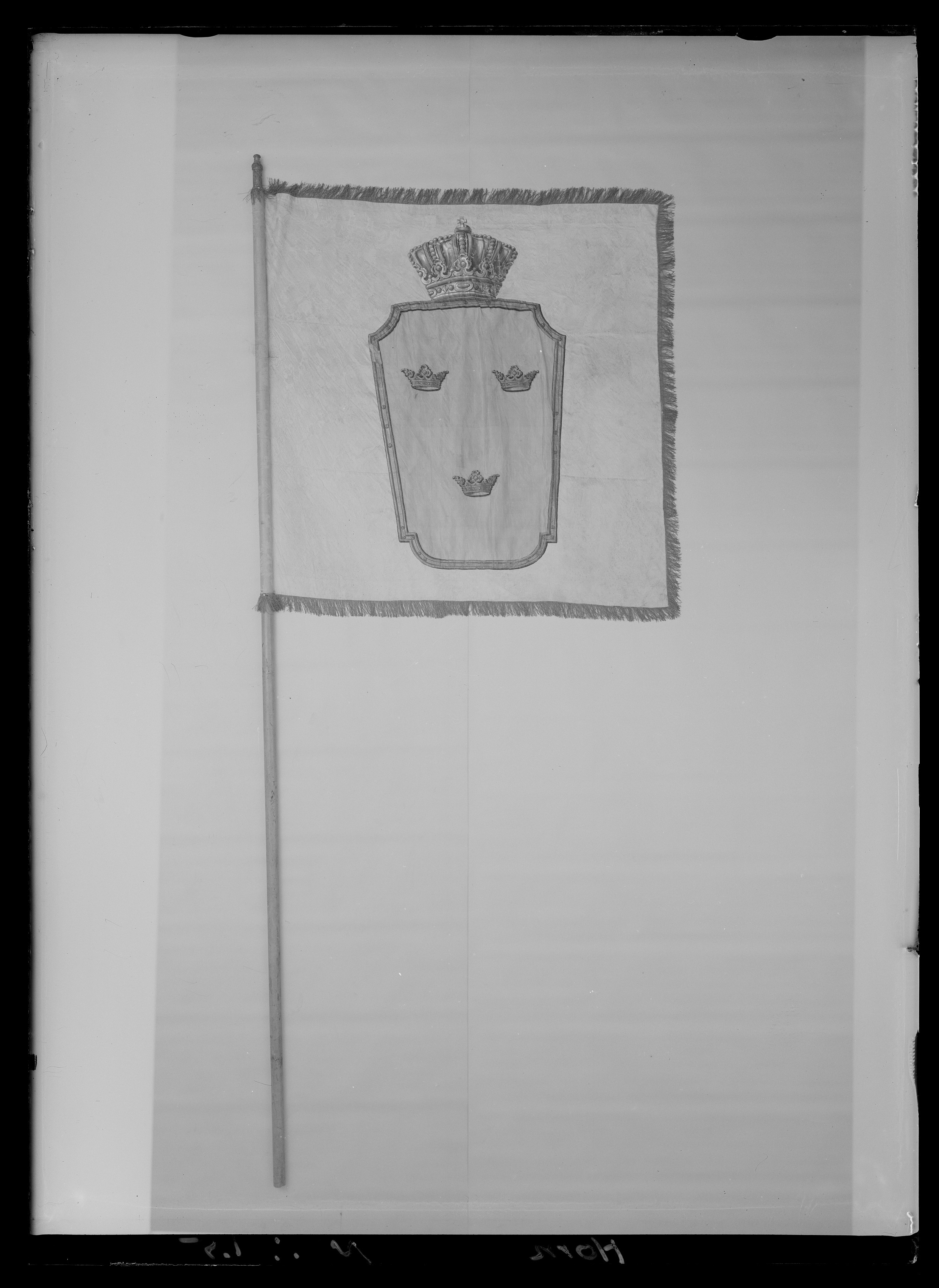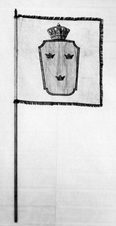 Tornerbanér på dukens vänstersida krönt av lilla riksvapnet, målat på taft, som sytts fast på duken av ljust gul damast dekorerad med ett blommönster. Kronan är bemålad med guldfärg. Mittfältet inne i kronan är av blå taft. Dukens högersida är av mörkt gul damast med blommor och bladmönster. Släkten Horns vapen, ett horn i svart taft och sammet, sytt på. En frans av mörkt guldfärgad eller brun tvinnad tråd. En galon med guldtråd löper längs med stången där duken är fästad. Stången är av bemålad furu med ett svart undre lager övermålat med gul färg. Fanspets av förgylld mässing. Etikett med påskrift fastsatt på fanstången: "Gripsholm 1945//nr IX:3//Gr Claes Horn/17d Strömsholm/1777".