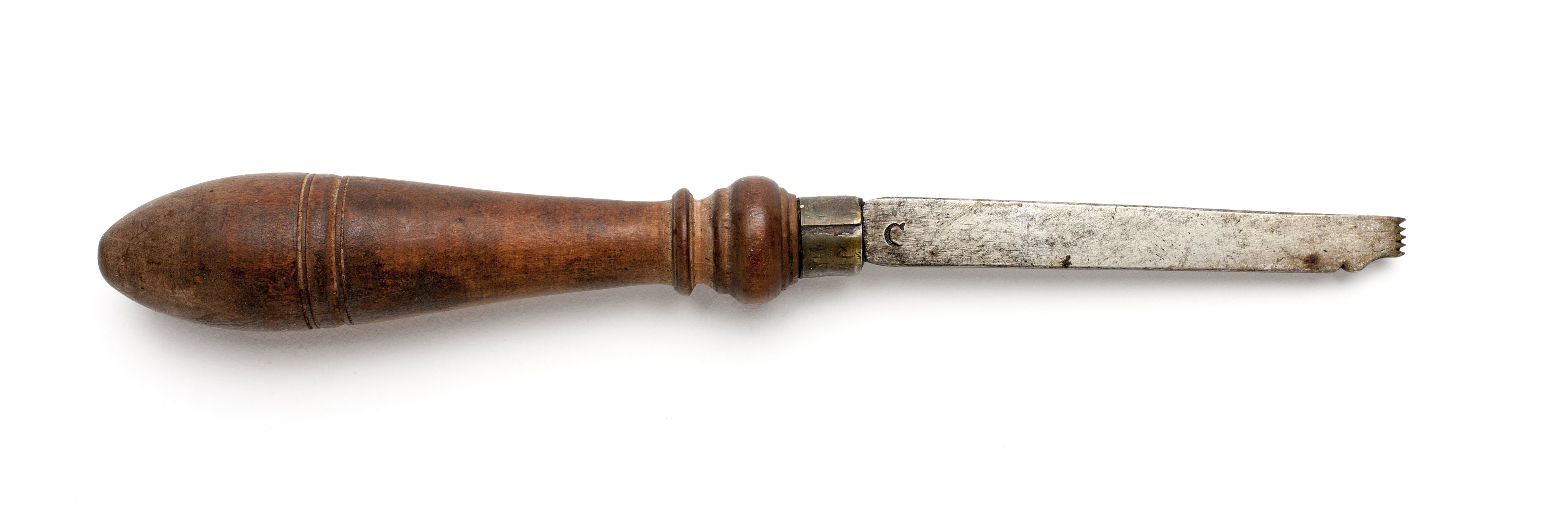 Klinga med rektangulär genomskärning. Stämplat på klingan: "C"d med stans nr 3841 Femtandad egg. Svarvat skaft av päronträ med två vulster nedtill. Mässingsring.