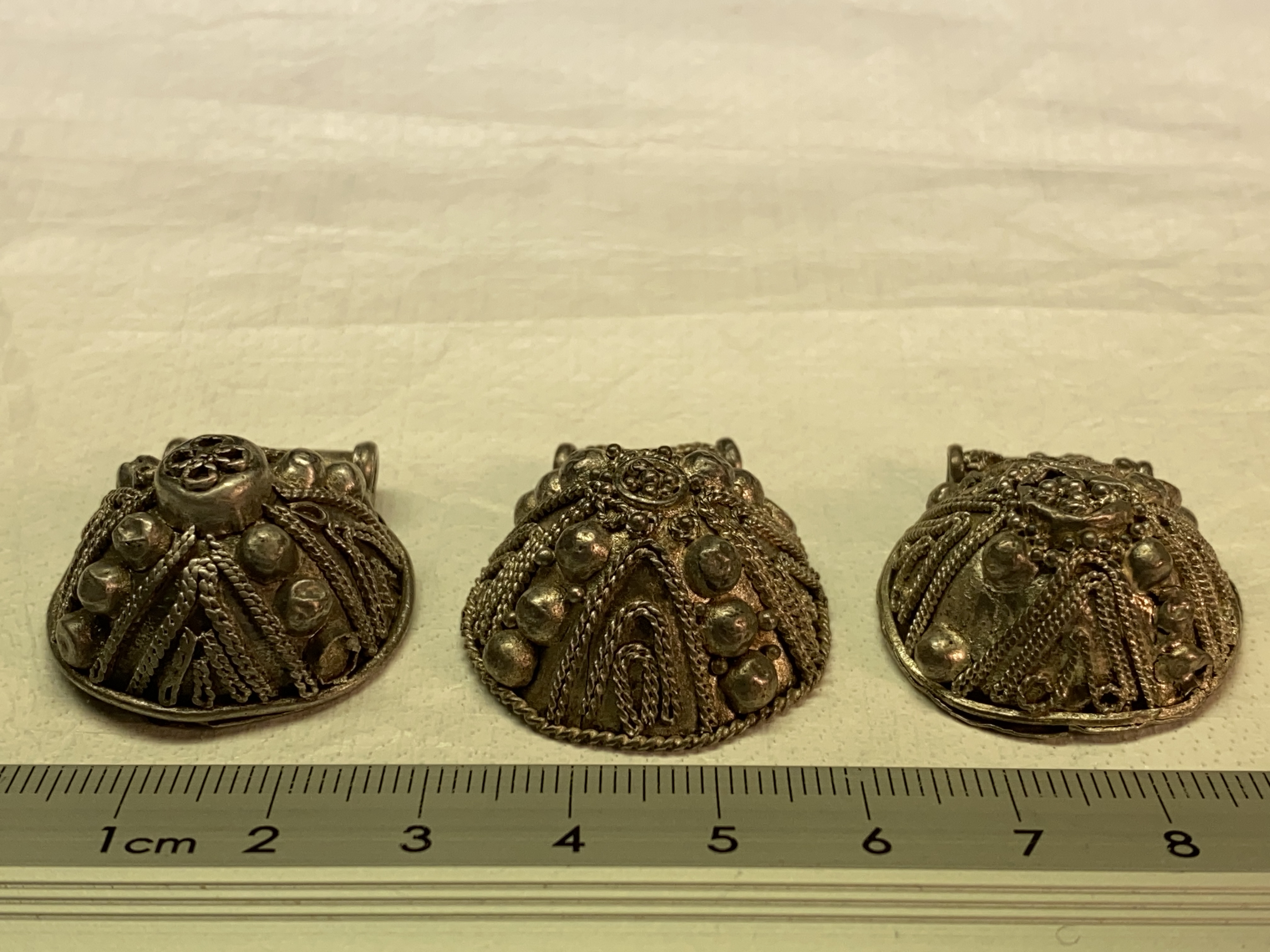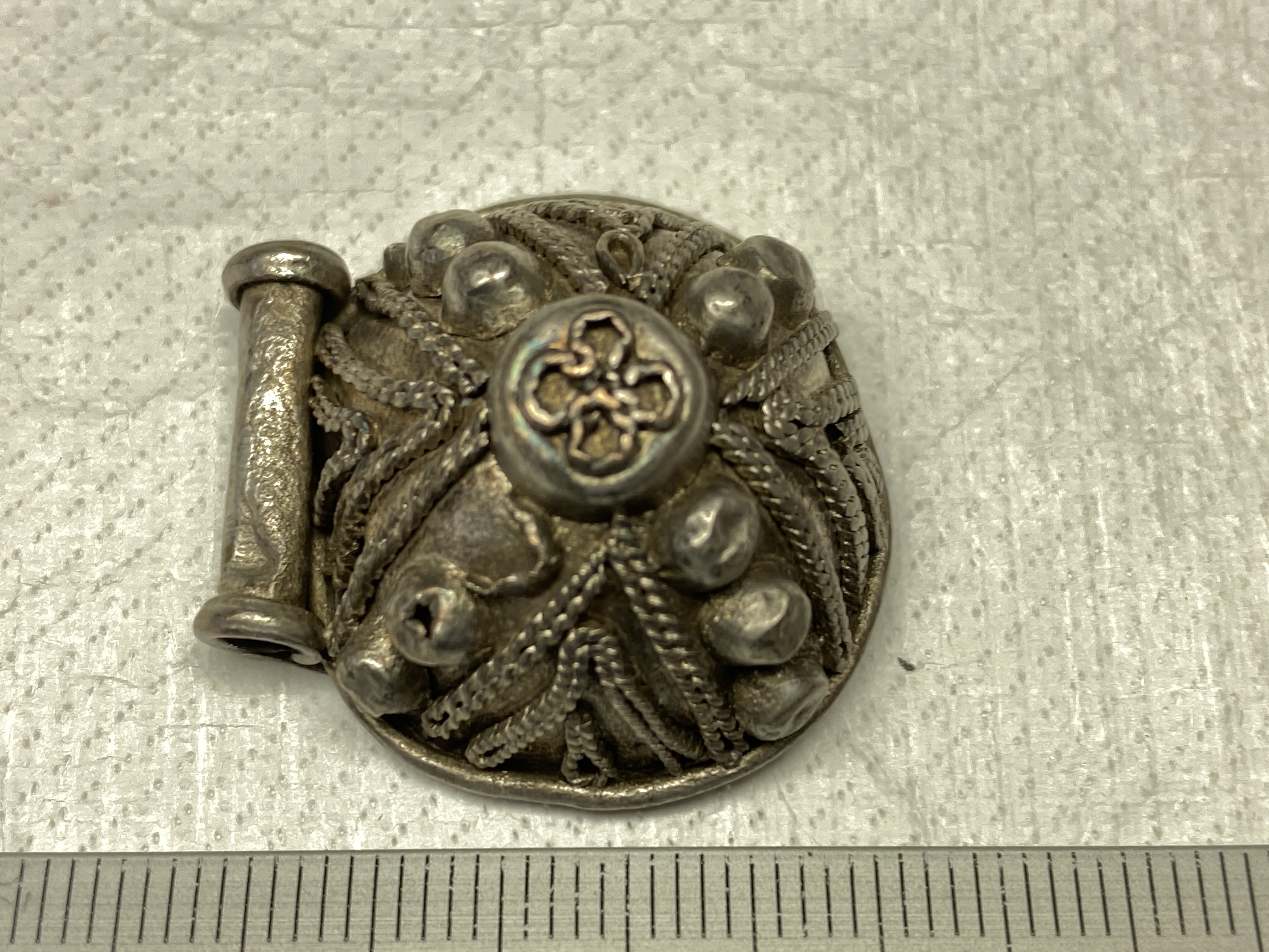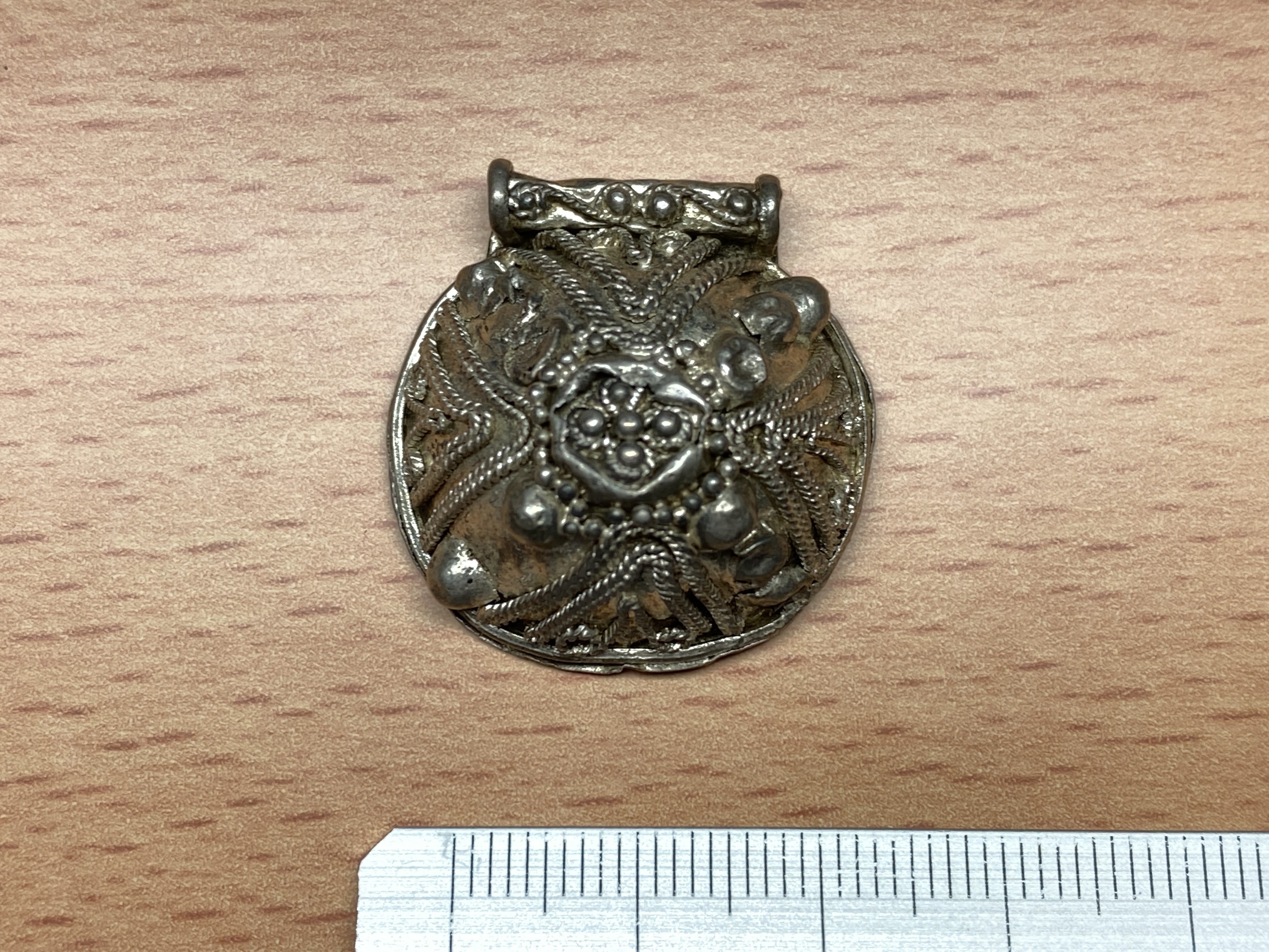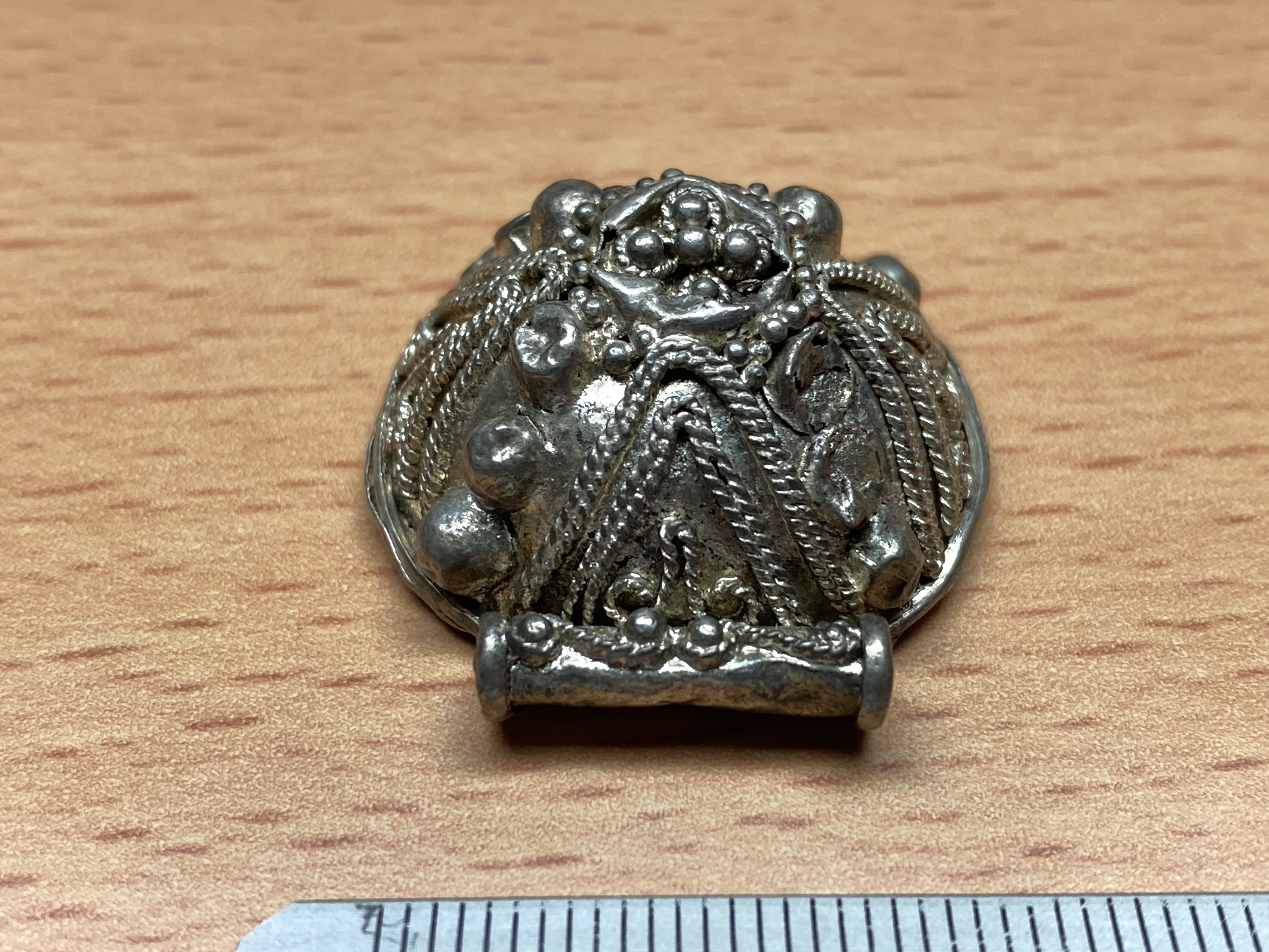 Kupigt hängsmycket med dekorerat upphängningsrör. Dekor i korsform med kulor och filigran. på baksidan slätt lock.