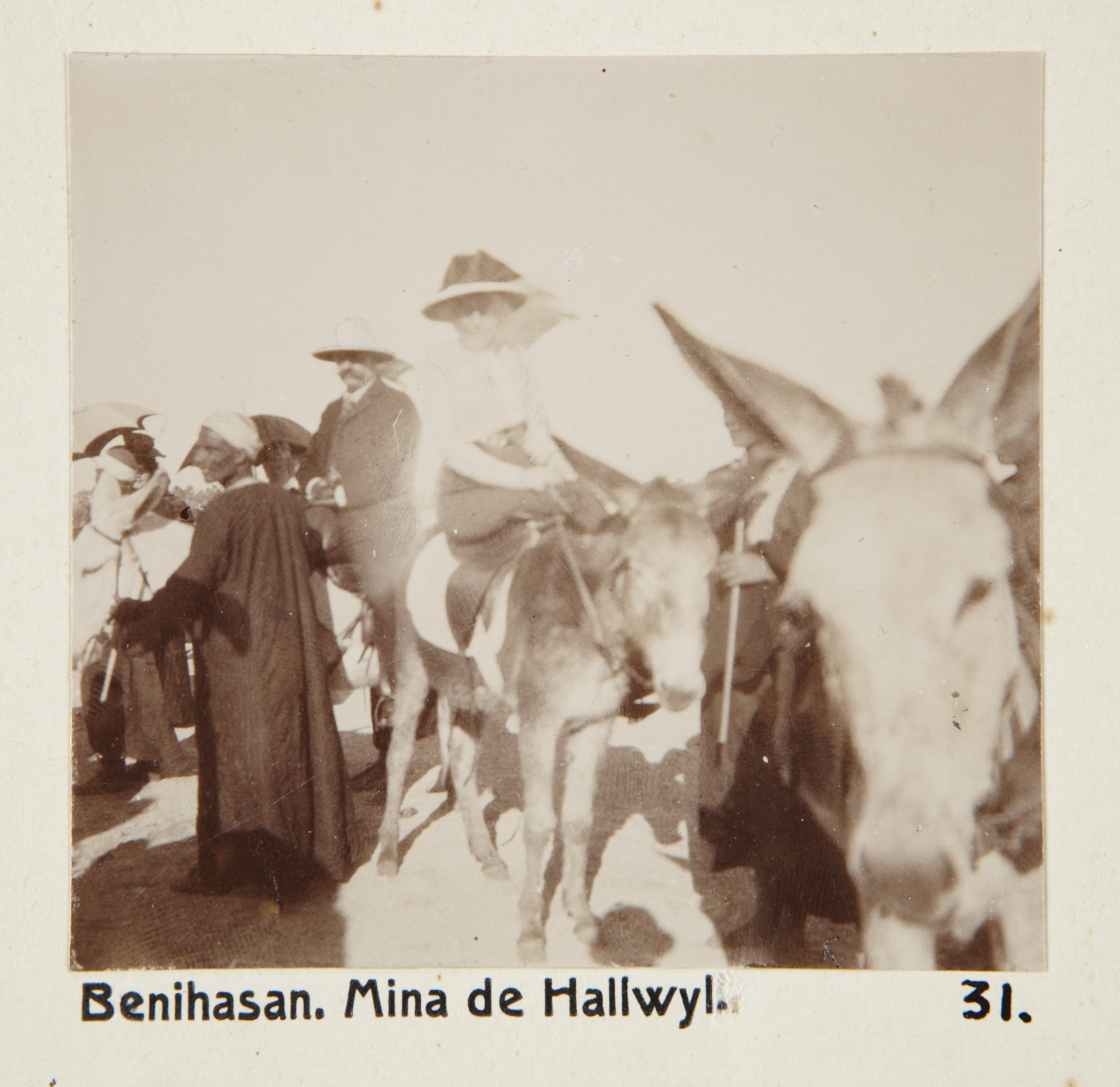 Beni Hasan, Egypten. Mina von Hallwyl. Text på fotografiet: Benihasan. Mina de Hallwyl. Fotografierna LXVI:M.01.- 201. kommer från resan till Egypten och Sudan som Wilhelmina och Walther von Hallwyl gjorde vintern 1900-1901. De lämnade Sverige den 5 november 1900 och fortsatte från Egypten till Palestina den 28 mars 1901. Med på resan var döttrarna Ellen med maken Henric de Maré och Irma med maken Wilhelm von Geijer. Wilhelminas sällskapsdam, fröken Ida Uhse reste också med. Under en del av resan anslöt sig ledamoten av Internationella domstolen i Kairo, assessorn Otto Conrad Waldemar Cedercrantz med makan Anna Elisabeth. Vid resan uppför Nilen hade Walther von Hallwyl hyrt ångfartyget Columbia med besättning. Båtresan startade i Kairo 27 december 1900, gick ända till Wadi Halfa varifrån man reste vidare med tåg till Khartum och tillbaka till Wadi Halfa. Båten vände åter i riktning mot Kairo, men det verkar som att sällskapet tog tåg sista biten, från Luxor. Henric och Ellen de Maré samt fru Cedercrantz lämnade båten redan då de passerade Luxor första gången. Resten av sällskapet återvände till Kairo den 1 mars. Fotografierna LXVI:M.01.-120. togs av resenärerna själva, de största av Ellen de Maré, de mellersta av Wilhelmina von Hallwyl och de minsta av Wilhelm von Geijer. Resten köptes av professionella fotografer i Kairo, de flesta från Studio Photogr. Artistique G. Lekegian & Cie. Alla uppgifter kommer från Ida Uhses reseanteckningar.