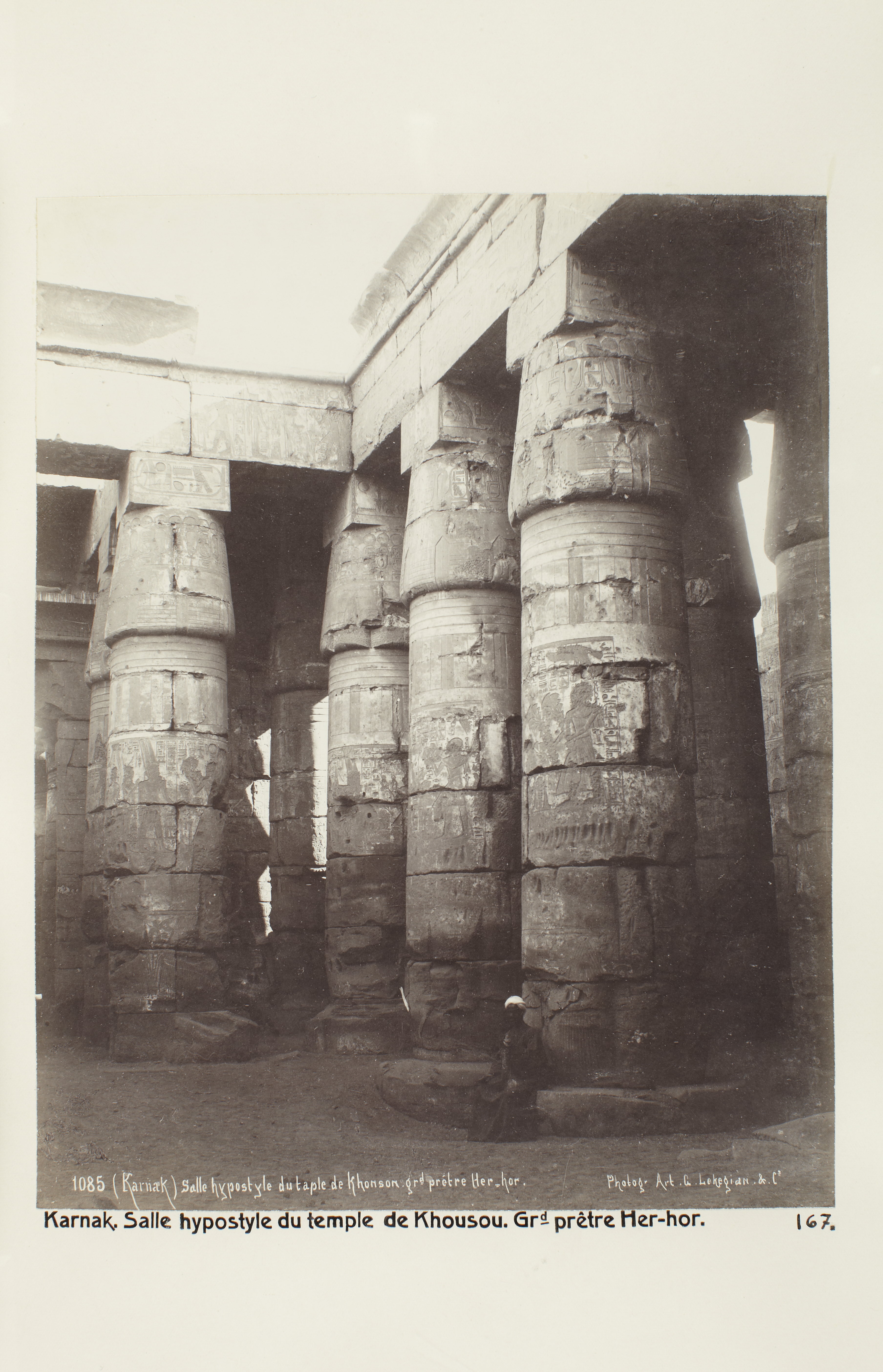 Kolonnhallen i Khonsou-templet, översteprästen Her-hor (Horus?). Karnak, Egypten. Text på fotografiet: Karnak. Salle hypostyle du temple de Khonsou, Gr d prêtre Her-hor. Fotografierna LXVI:M.01.- 201. kommer från resan till Egypten och Sudan som Wilhelmina och Walther von Hallwyl gjorde vintern 1900-1901. De lämnade Sverige den 5 november 1900 och fortsatte från Egypten till Palestina den 28 mars 1901. Med på resan var döttrarna Ellen med maken Henric de Maré och Irma med maken Wilhelm von Geijer. Wilhelminas sällskapsdam, fröken Ida Uhse reste också med. Under en del av resan anslöt sig ledamoten av Internationella domstolen i Kairo, assessorn Otto Conrad Waldemar Cedercrantz med makan Anna Elisabeth. Vid resan uppför Nilen hade Walther von Hallwyl hyrt ångfartyget Columbia med besättning. Båtresan startade i Kairo 27 december 1900, gick ända till Wadi Halfa varifrån man reste vidare med tåg till Khartum och tillbaka till Wadi Halfa. Båten vände åter i riktning mot Kairo, men det verkar som att sällskapet tog tåg sista biten, från Luxor. Henric och Ellen de Maré samt fru Cedercrantz lämnade båten redan då de passerade Luxor första gången. Resten av sällskapet återvände till Kairo den 1 mars. Fotografierna LXVI:M.01.-120. togs av resenärerna själva, de största av Ellen de Maré, de mellersta av Wilhelmina von Hallwyl och de minsta av Wilhelm von Geijer. Resten köptes av professionella fotografer i Kairo, de flesta från Studio Photogr. Artistique G. Lekegian & Cie. Alla uppgifter kommer från Ida Uhses reseanteckningar. Inköpt hos studio Photogr. Artistique G. Lekegian & Co.