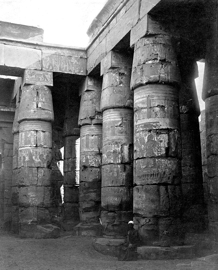 Fotografi. Kolonnhallen i Khonsou-templet, översteprästen Her-hor (Horus?). Karnak, Egypten.