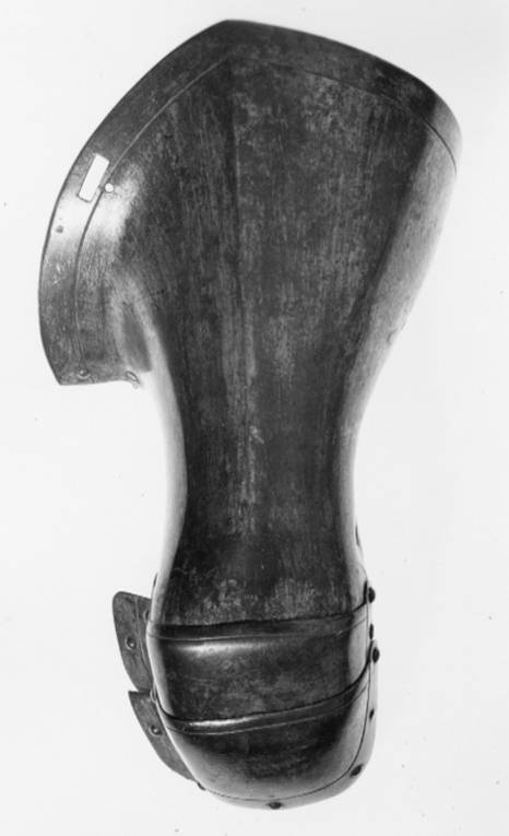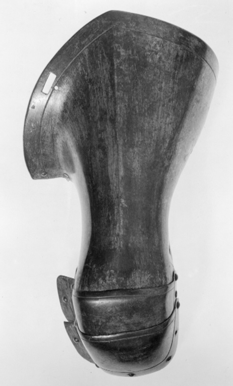 Av stål. Utsidan med sliten förgyllning och insidan svart med slagmärken. Sammanlagt fyra delar (delar till tummen saknas). Enkel dekor i form av filad kantlinje. Välvd kraftig form med bred uppåtsvängd krage. I kragens övre kant rektangulärt fästhål. Över knogar och fingrar två välvda plåtar nitade omlott med inre kant uppvikt, B 25 mm (extra skydd för tummen?) främre kant utdragen i en centrerad svag spets. Ursprungligen separat skydd för tummen av flera mindre plåtar, endast den första återstår. Längs kanterna sitter nitar i rad med kullriga skallar. På insidan nitbrickor och rester av kantband. I nedre kant är fäst ett svart läderstycke, B ca 150 mm, tydligt avslitet och fäst med sju nitar med nerslipad skalle, på motstående sida rester av läder (samma stycke?)