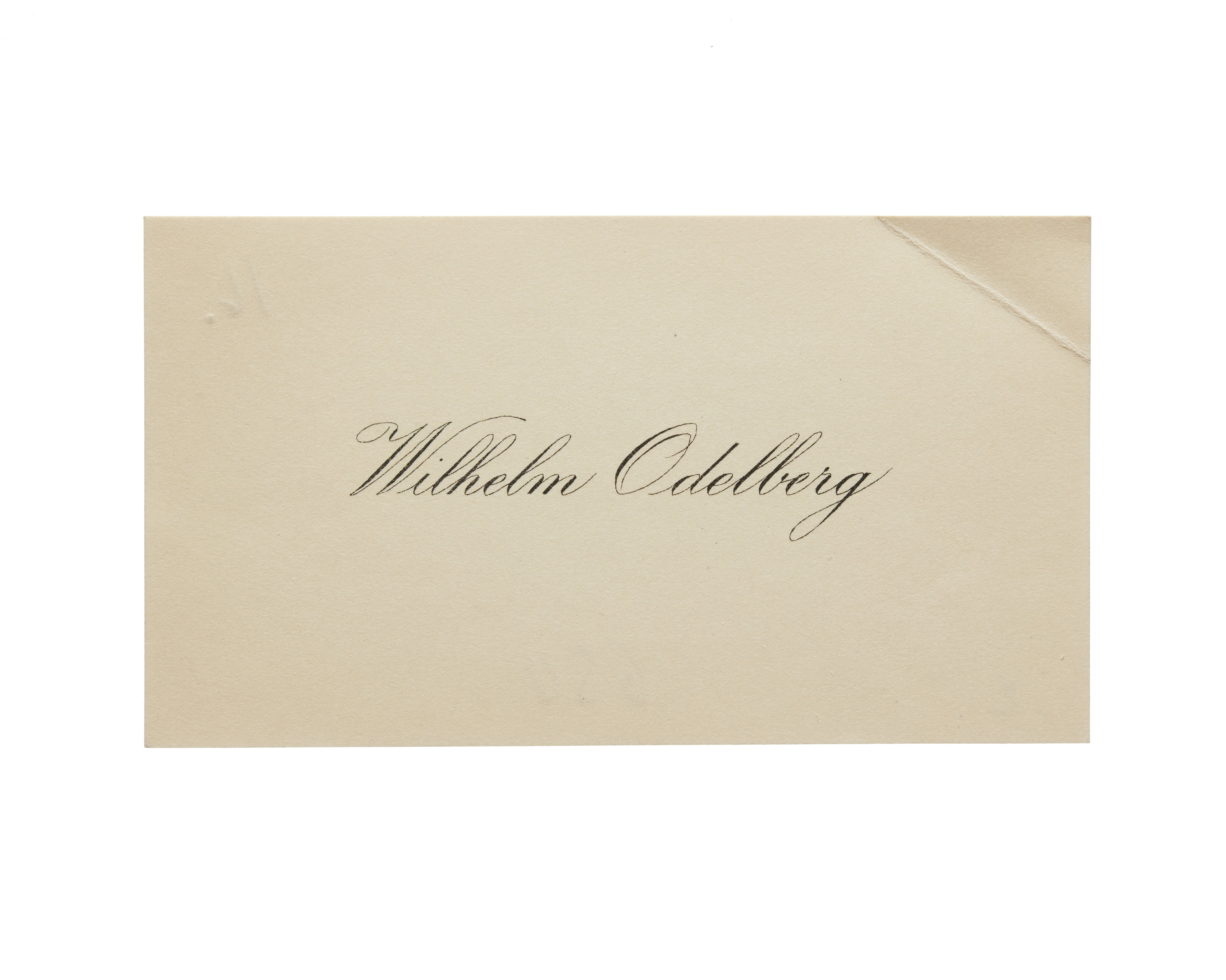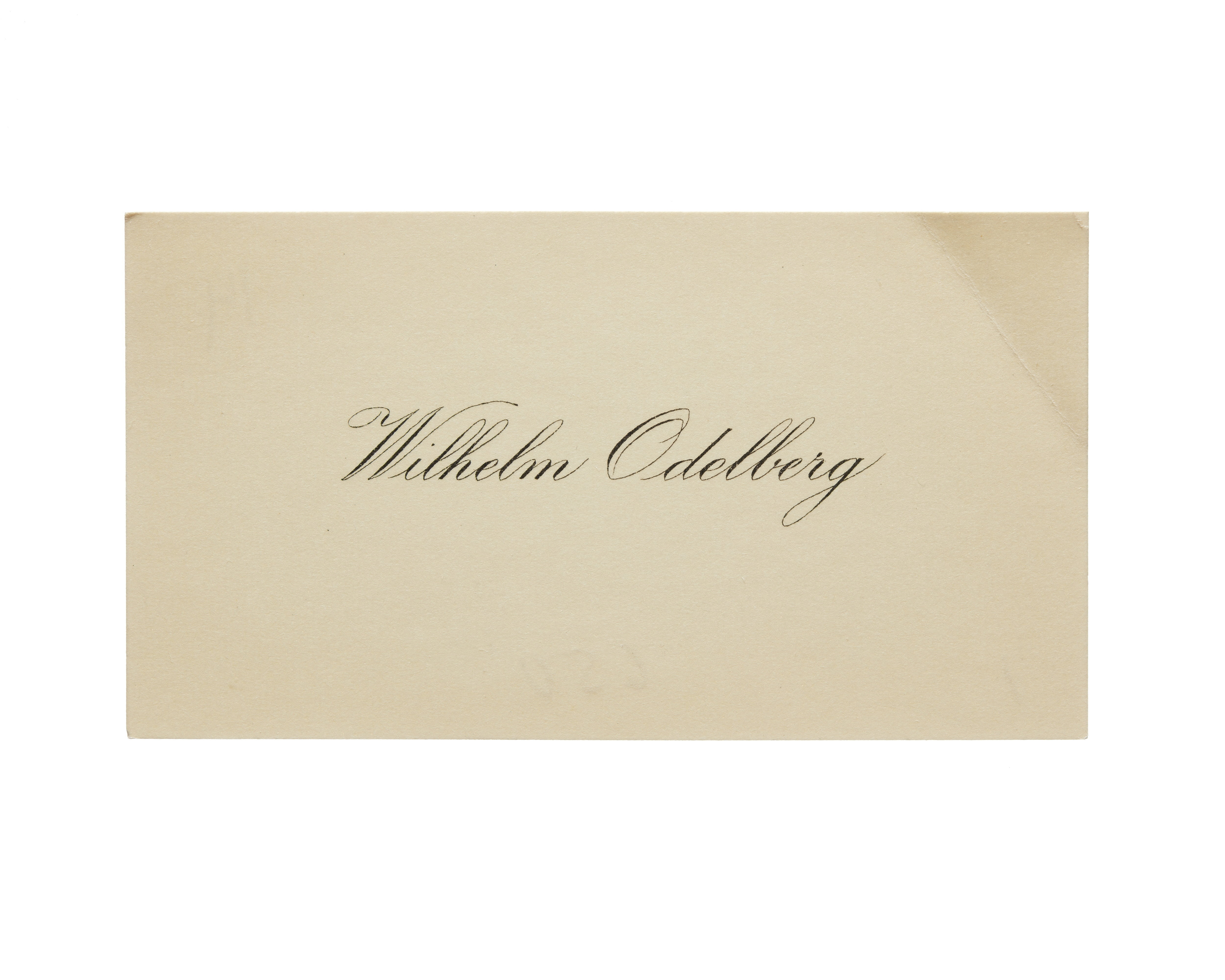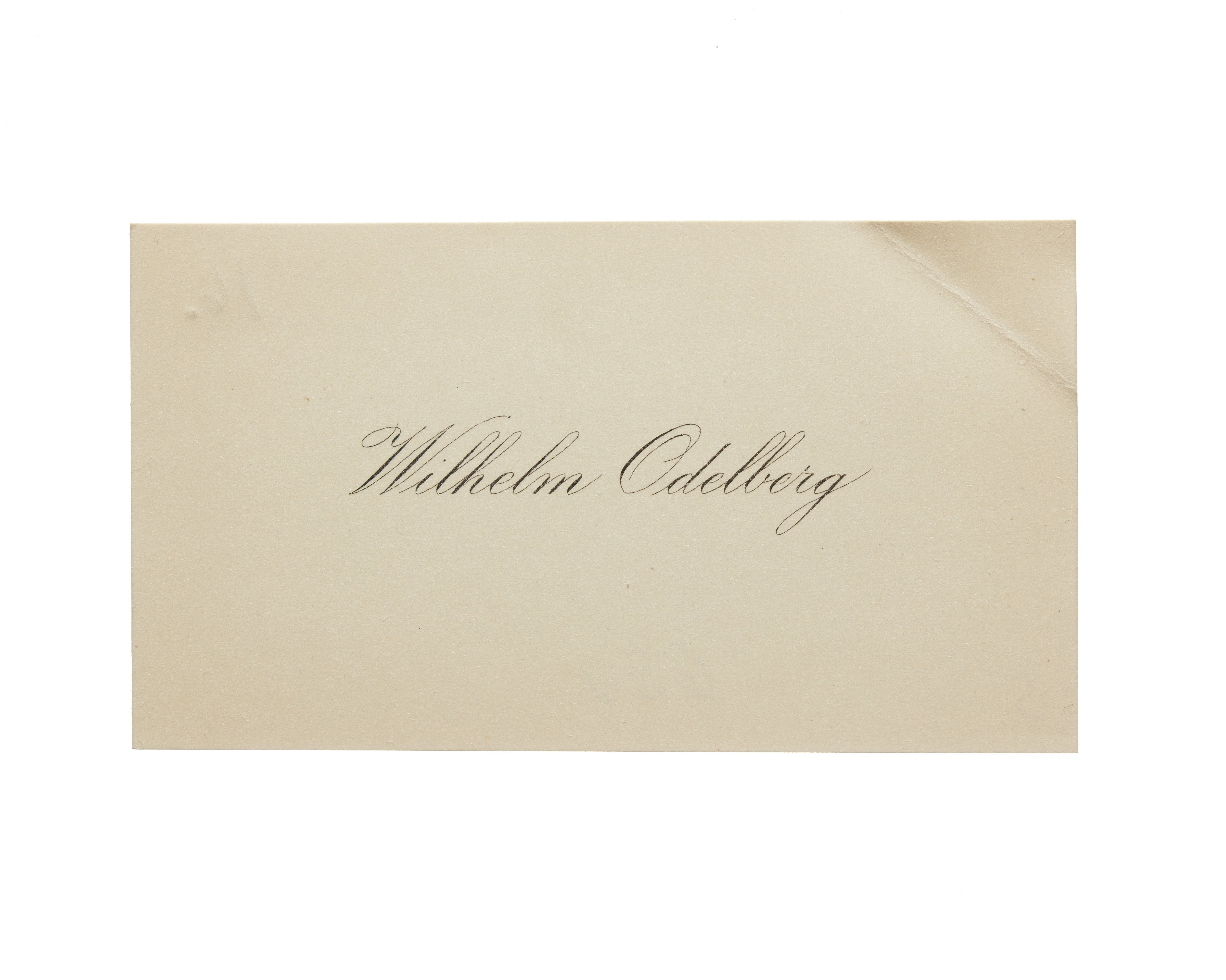 Fem visitkort från bruksägare Wilhelm Odelberg. Första kortet daterat 1914, vikt i övre högra hörnet. Andra kortet daterat 1916, vikt i övre högra hörnet. Tredje kortet daterat 1916, vikt i övre högra hörnet. Fjärde kortet daterat 1916, vikt i övre högra hörnet. Femte kortet daterat 1916, vikt i övre högra hörnet.