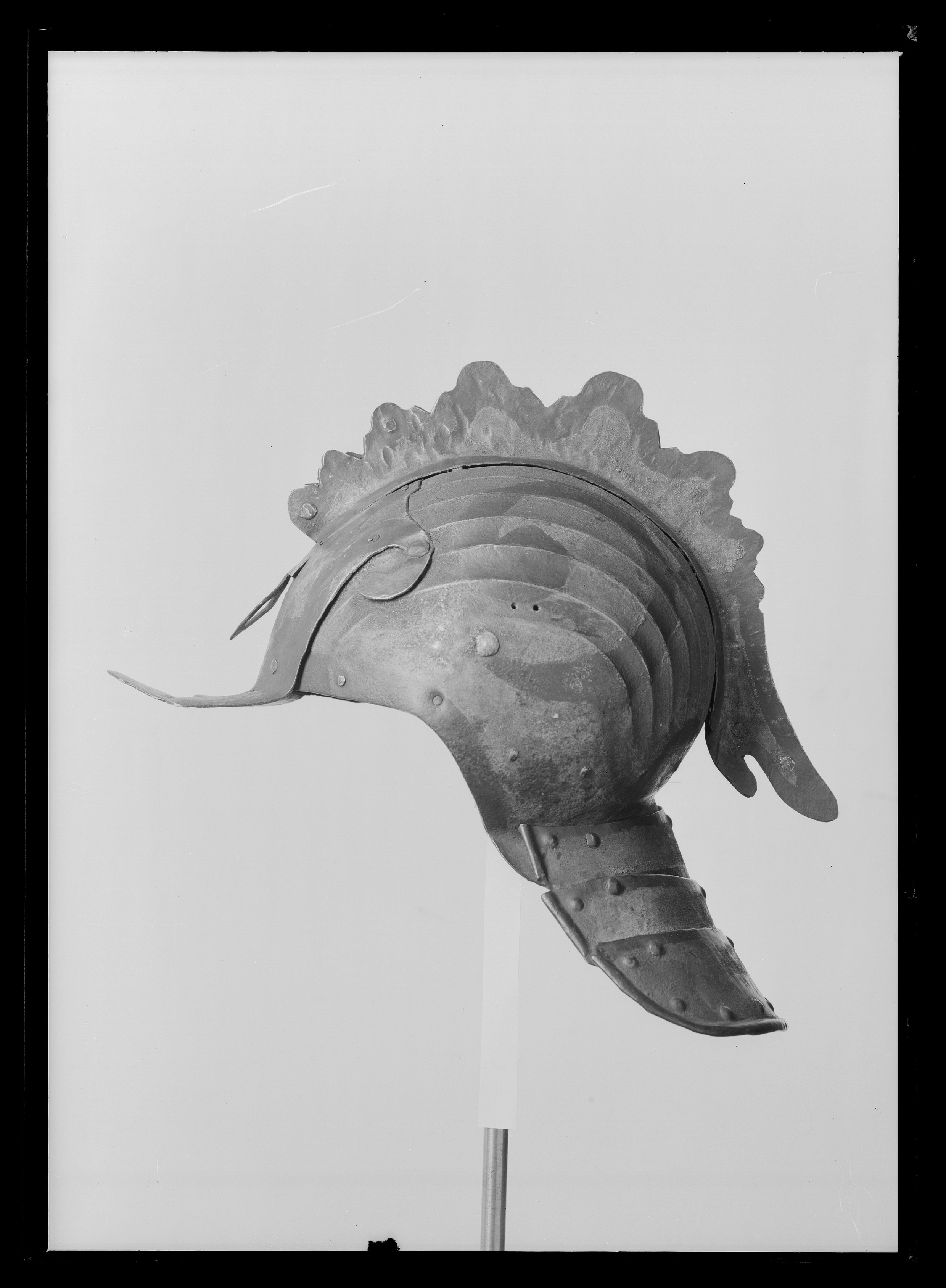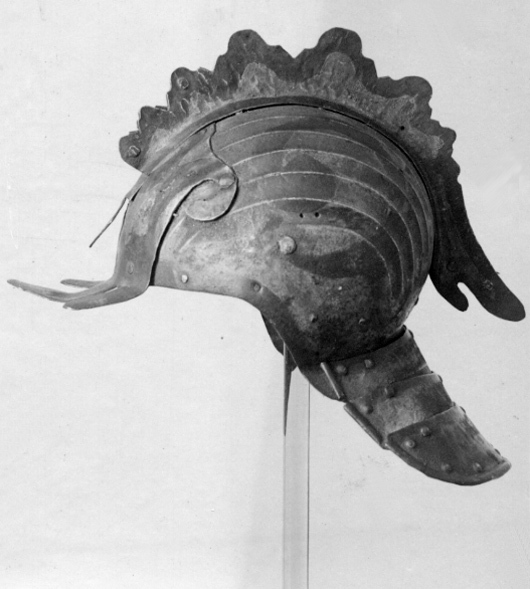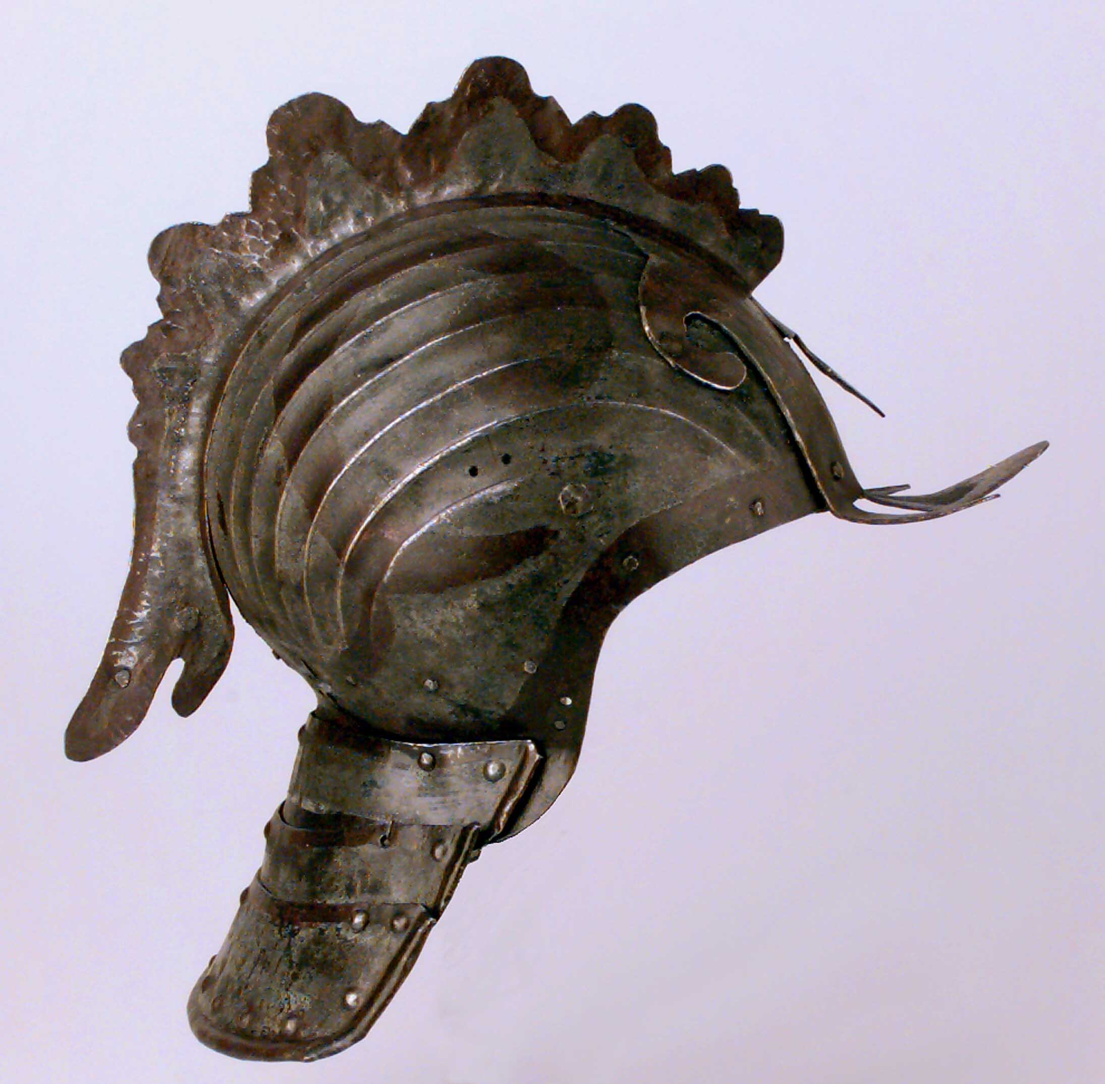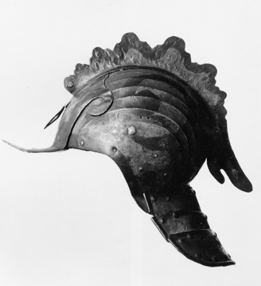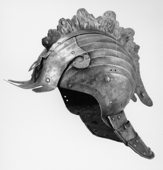 Hjälm, ändrad till tornerhjälm med tuppkam, ca 1580.