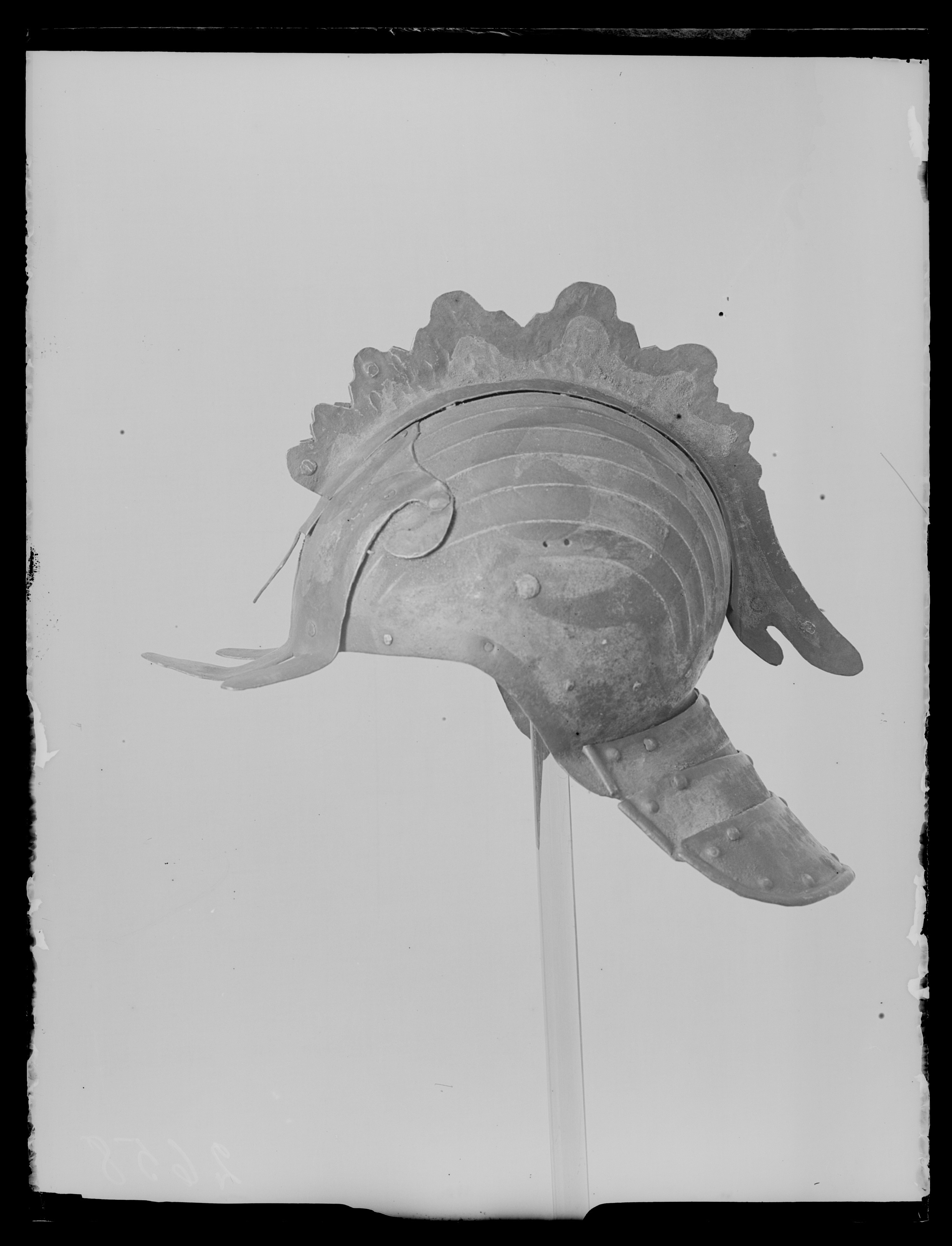 Hjälmklocka med 16 längsgående, konkava fält, b: ca 20 mm med punsade kantlinjer. Nackskärm med tre lameller, omvikt kantvulst längs ytterkanterna. På ytterskenan dekornitar, punsade på baksidan, 11 längs ytterkanterna samt en mitt på överkanten. På de övriga lamellerna vardera 3 punsade nitar längs överkanten samt 2 riktiga nitar var. Framtill nitat en pannskärm i form av tre tungor, på klockan en högt uppdragen, ca 130 mm bred plåt, upptill avslutad med spets och voluter liknande en fransk lilja. På klockans mittlinje fäst en uppstående plåt med vågig kant, liknande en tuppkam, h: ca 55 mm på bredaste stället, tvåtungad bakspets, framtill avslutad med en rombisk, genombruten platta framför pannplattan. Hjälmen utvänigt dekorerad med mönster i form av kantbård samt rankmönster med breda rankor i rödgul färg (grundering?) med rester av guldfärg. Bakgrunden är gråvit med ett pulver strött i lacken (enl. litt. blyglans).
