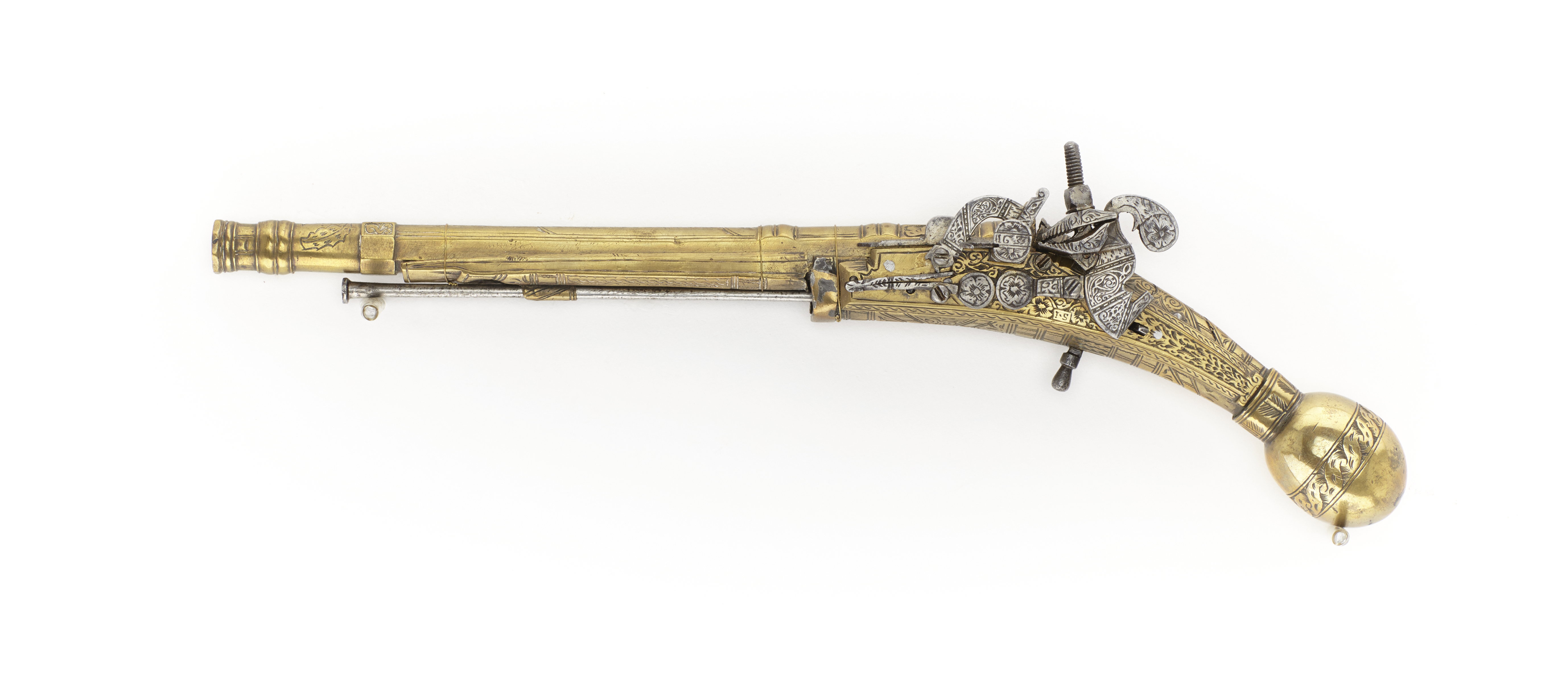 Snapplåspistol, vänsterpistol, Skottland, 1633, helt av mässing.