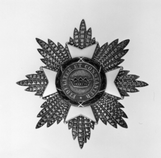 Åttauddig, flinkerad strålstjärna, varje udd sammansatt av fem bladformiga spetsar med repstavskanter, lodräta och vågräta uddarna förgyllda. På stjärnan fäst ett vitemaljerat malteserkors av förgyllt silver, kulor på spetsarna. Välvd medaljong av förgyllt silver med punsad yta, därpå fäst en grönemaljerad, öppen krona, kantring täckt med blå emalj, guldtext: " FIDELITER ET CONSTANTER ". Däromkring en grönemaljerad lagerkrans. Frånsidan slät, vertikalt placerad säkerhetsnål.