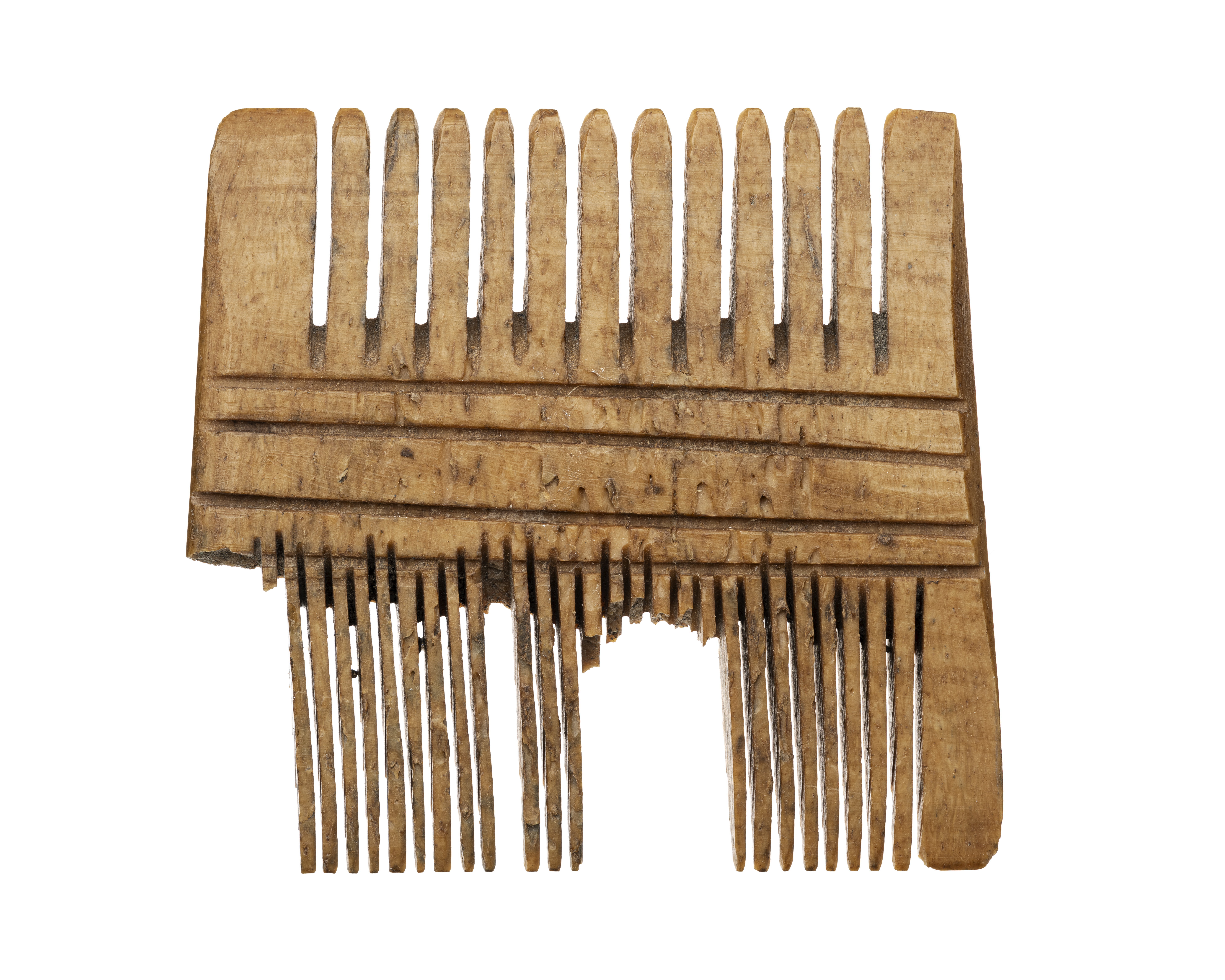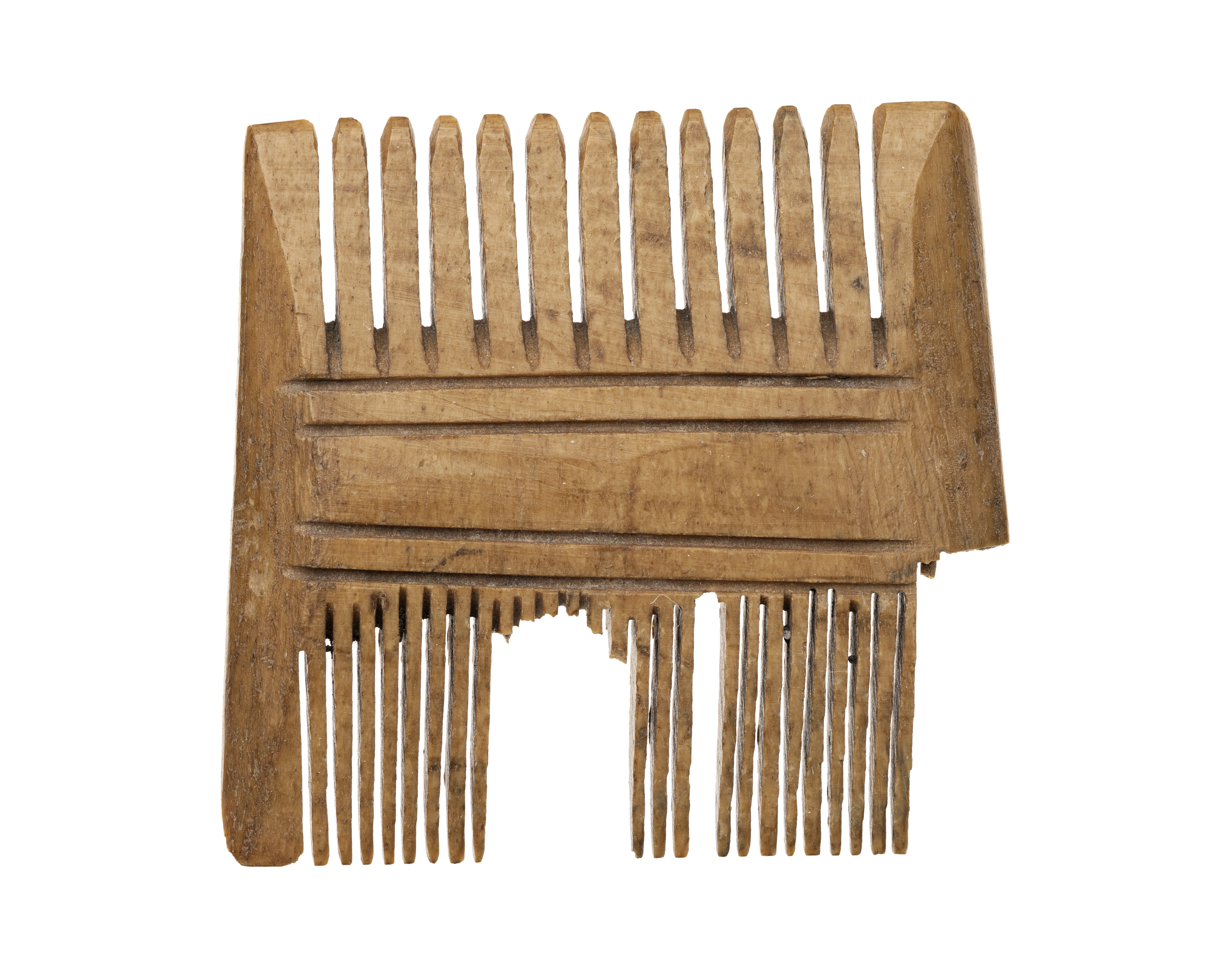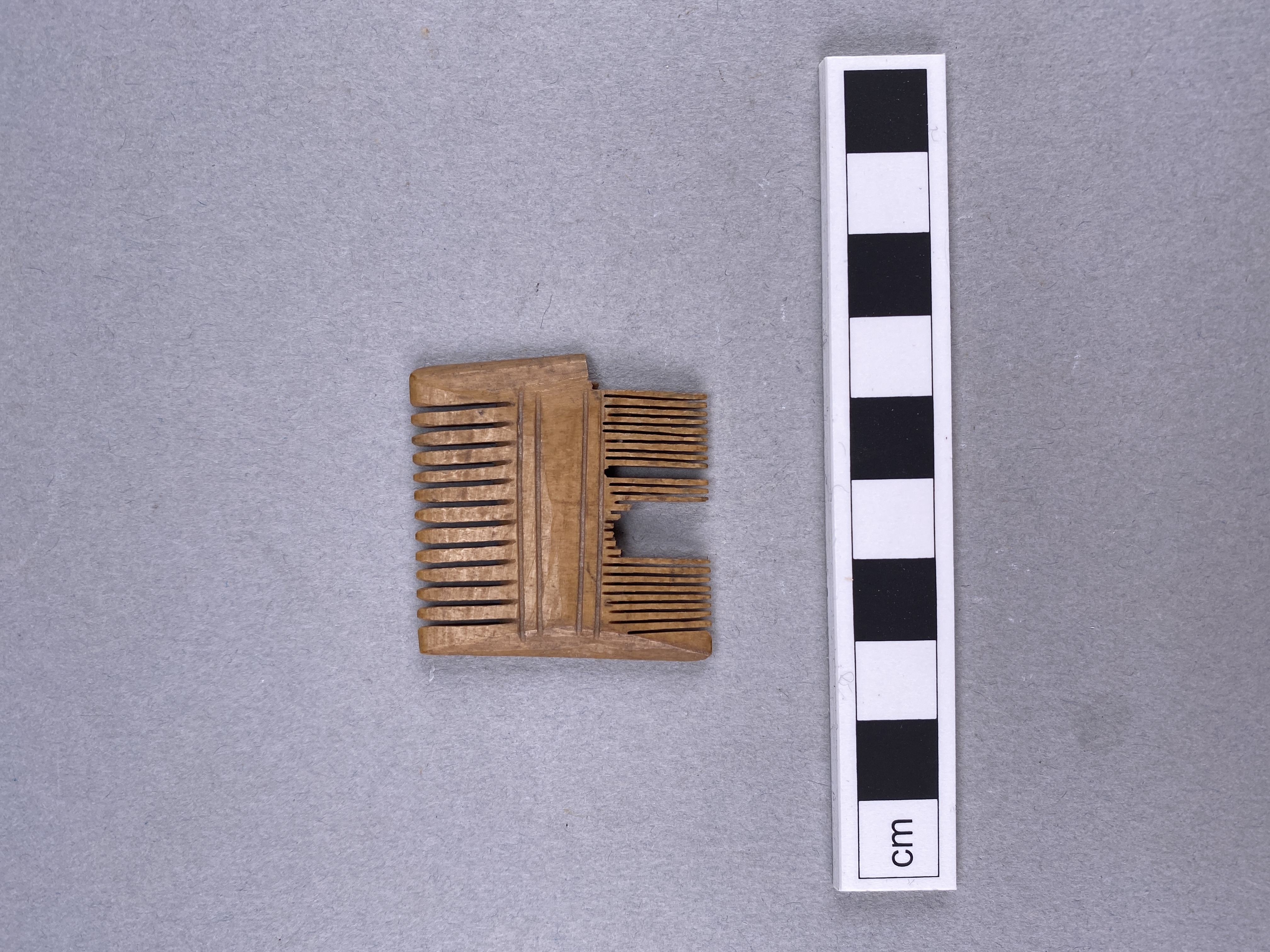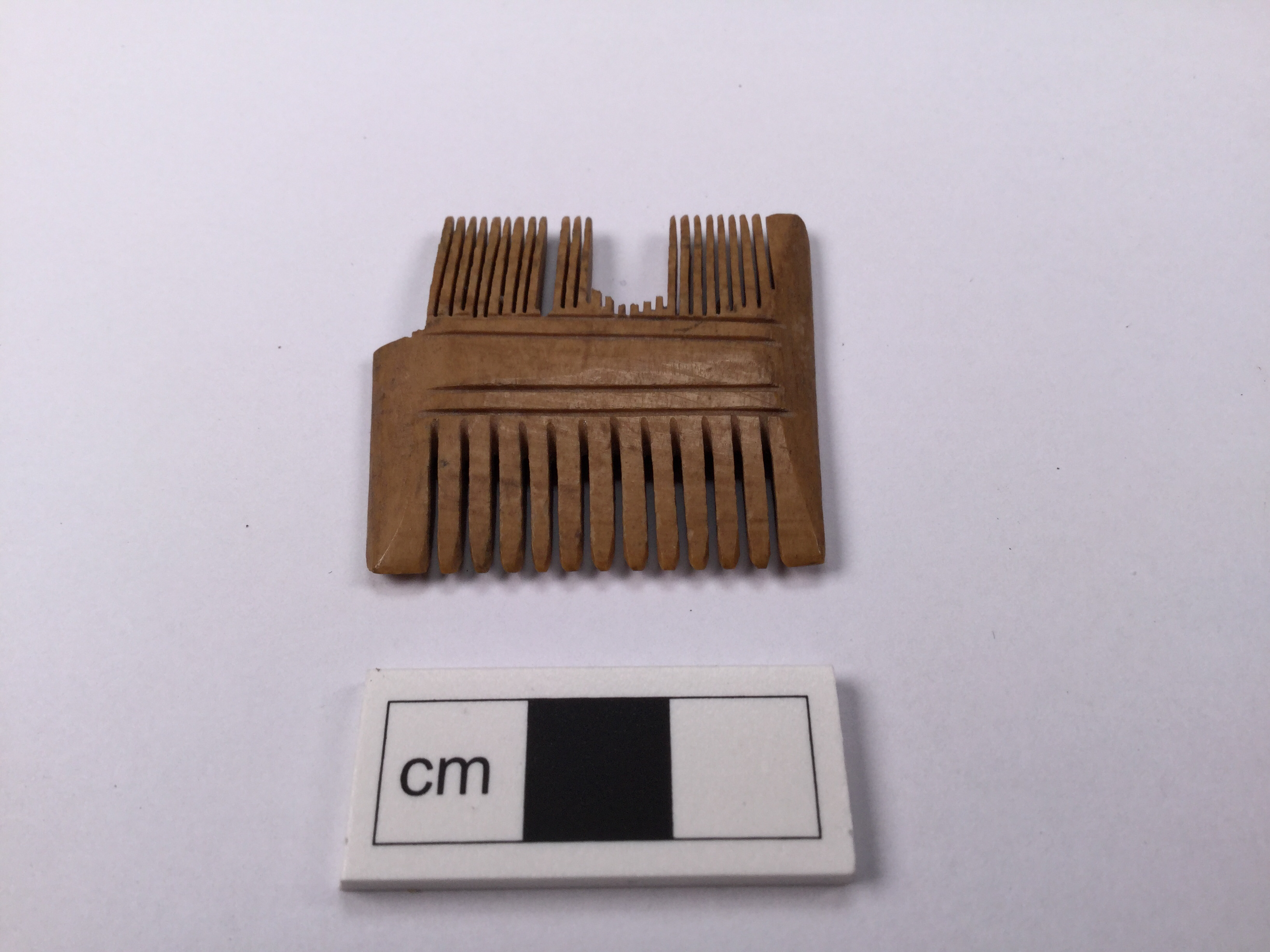 Liten dubbelkam. Några tänder på den täta sidan avbrutna. Ornerad med raka, skurna streck på mittendelen.
