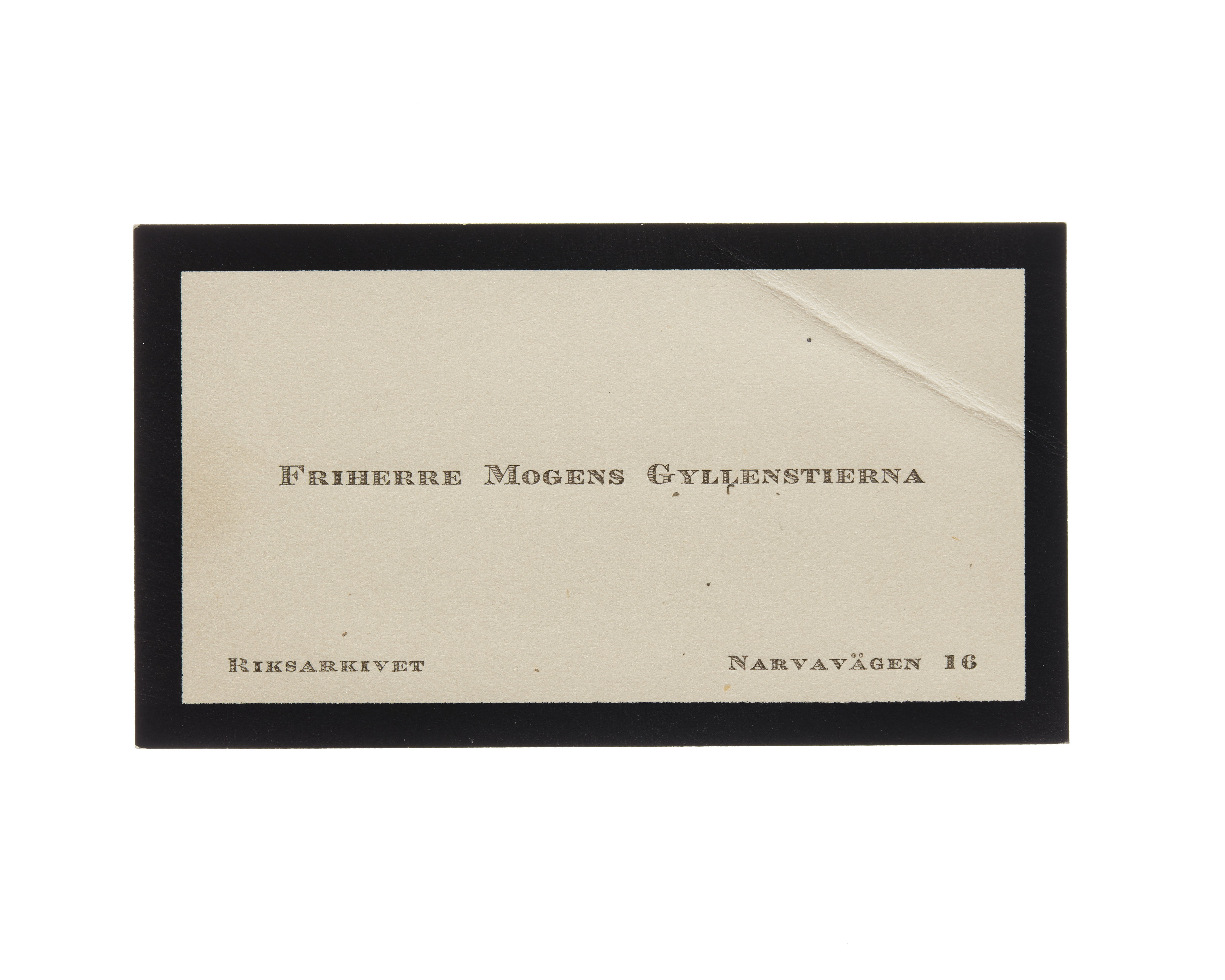 Tre visitkort från Friherre Mogens N. Gyllenstierna, Jur. stud. Första kortet daterat 1916, adress (nerde högra hörnet) Uppsala. Andra kortet daterat 1916. Tredje kortet daterat 1929 samt sorgkant, vikt i övre högra hörnet. Adress (nedre vänstra hörnet) Riksarkivet, (nedre högra hörnet) Narvavägen 16.