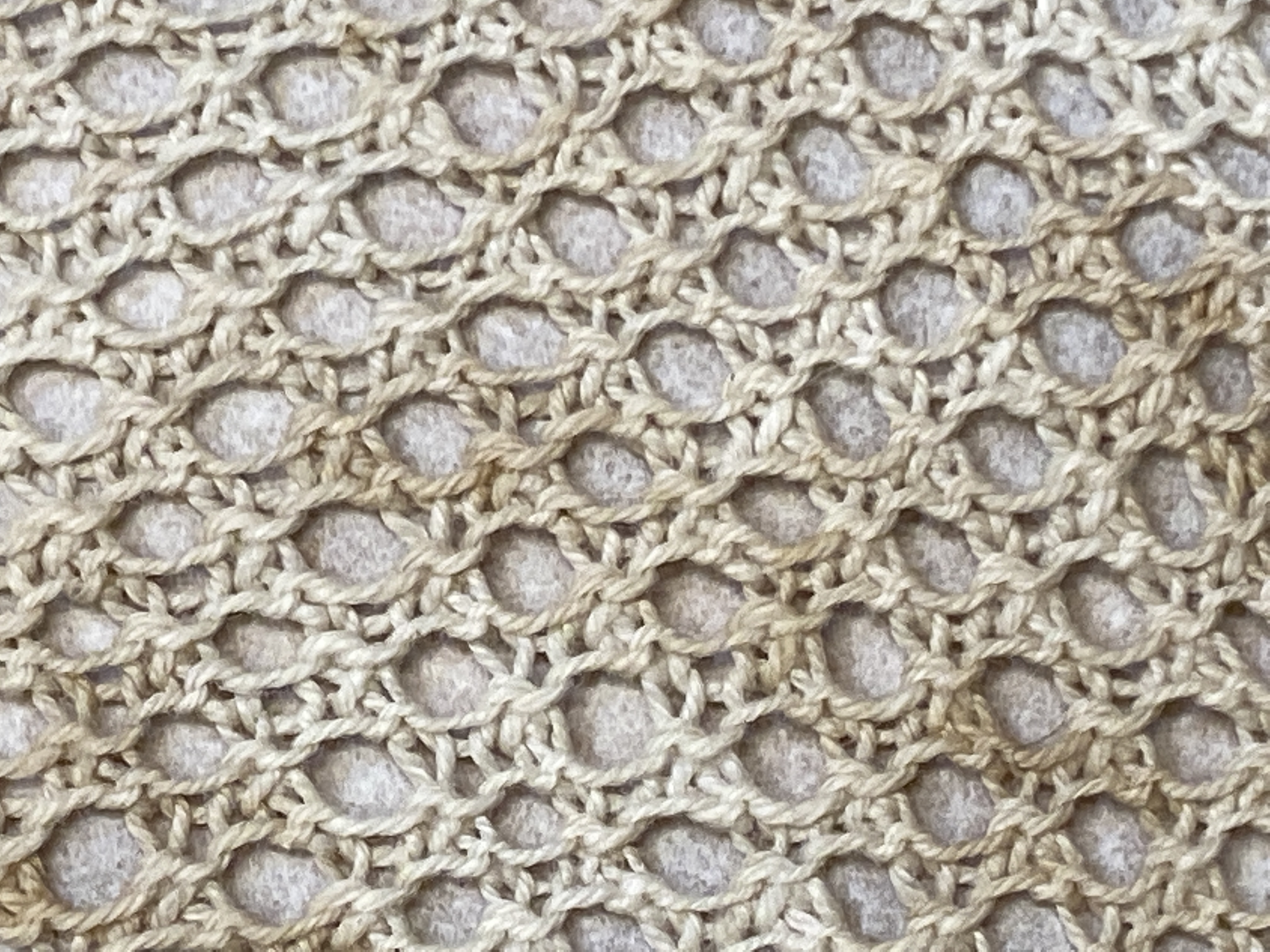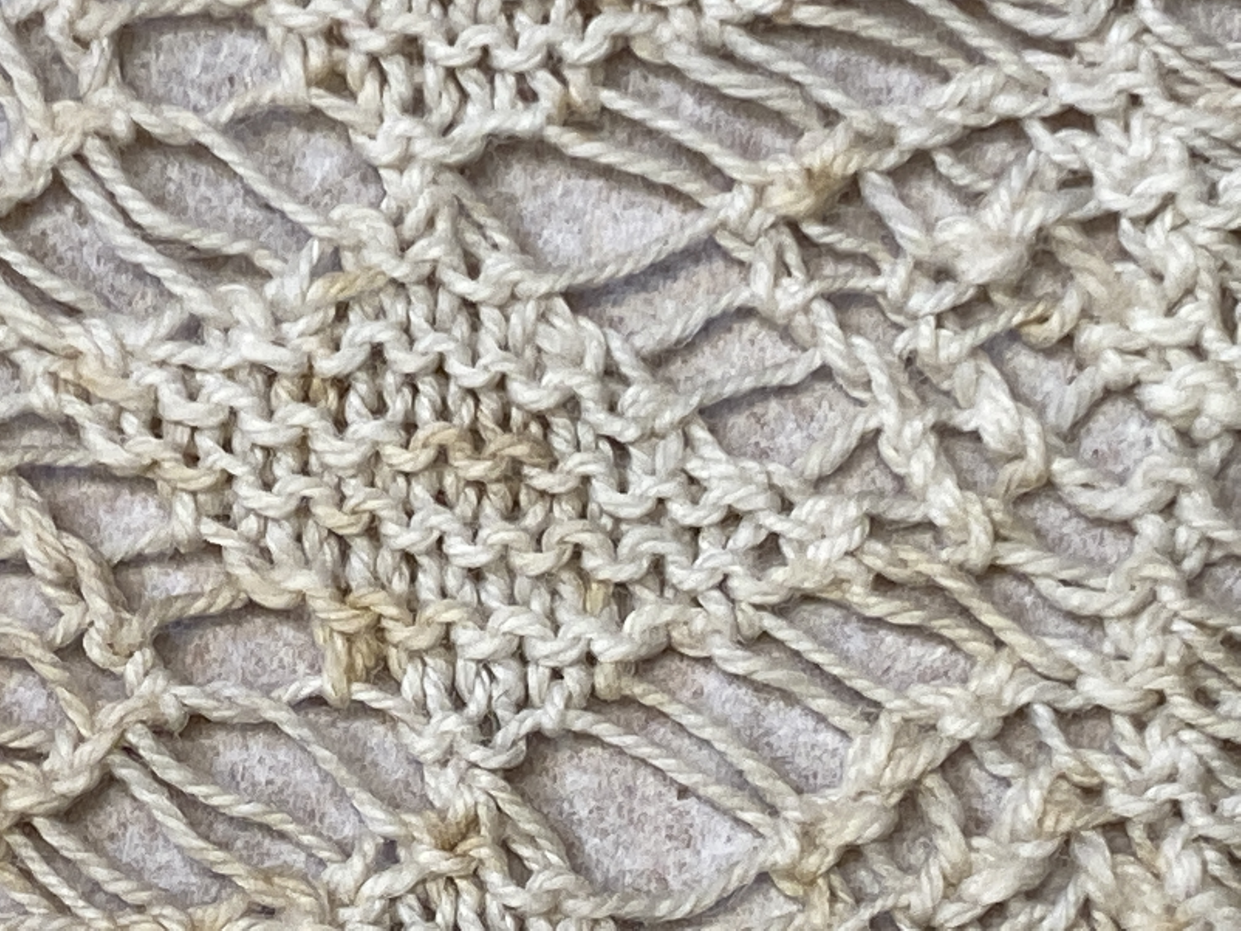 Vitt randigt bomullstyg med stickad spets. Deponerad. Den stickade spetsen är av tvåtrådigt bomullsgarn. / Maria Neijman