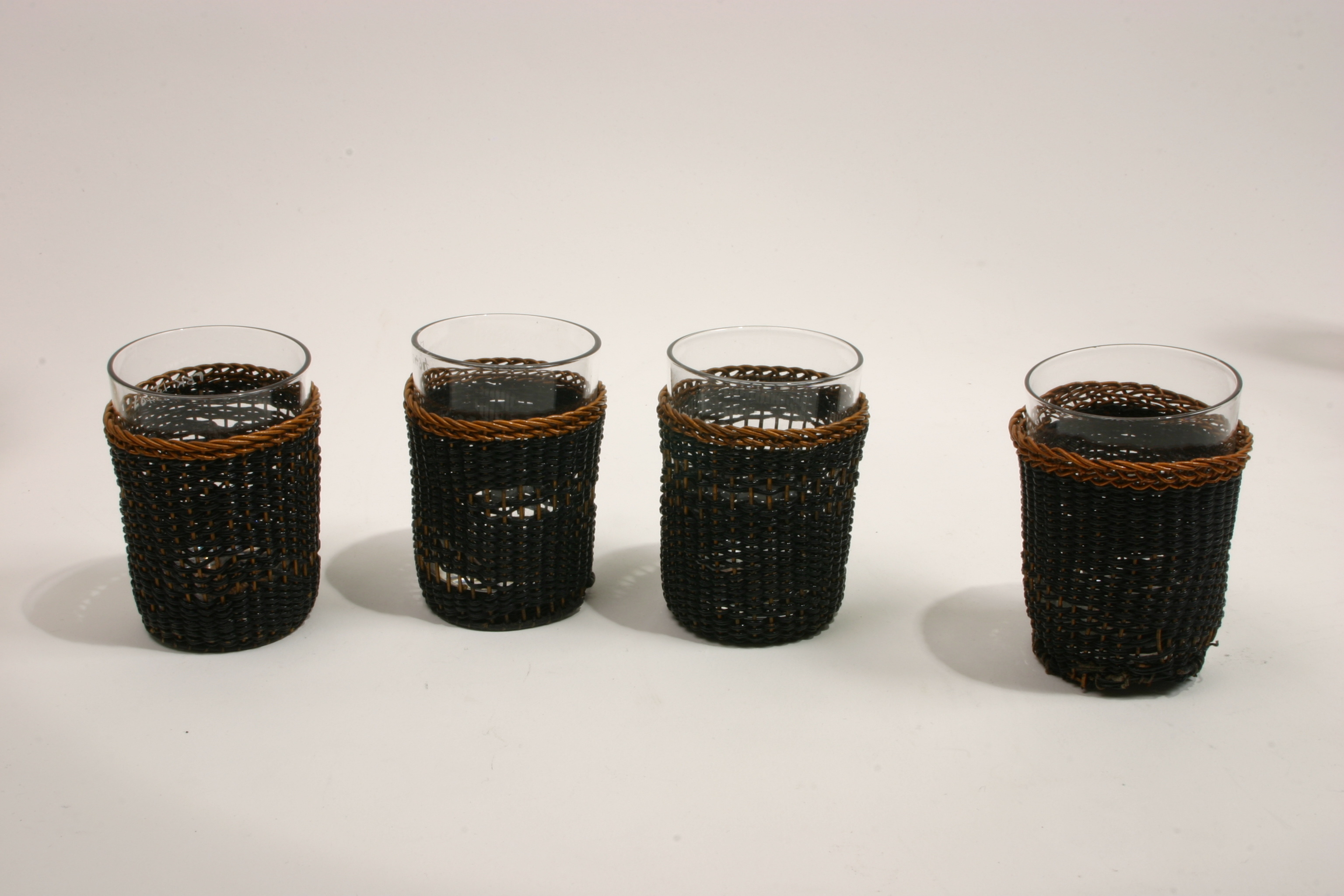 Cylindriskt glas av 2 mm tjockt glas. Hållare av svart flätad korg. Smal kant upptill övermålad med guldfärg. Glaset synligt 14 mm ovanför hållarens kant. Har tillhört drottning Victoria, gåva 1951 av Gustaf V:s arvingar gm K. Husgerådskammaren