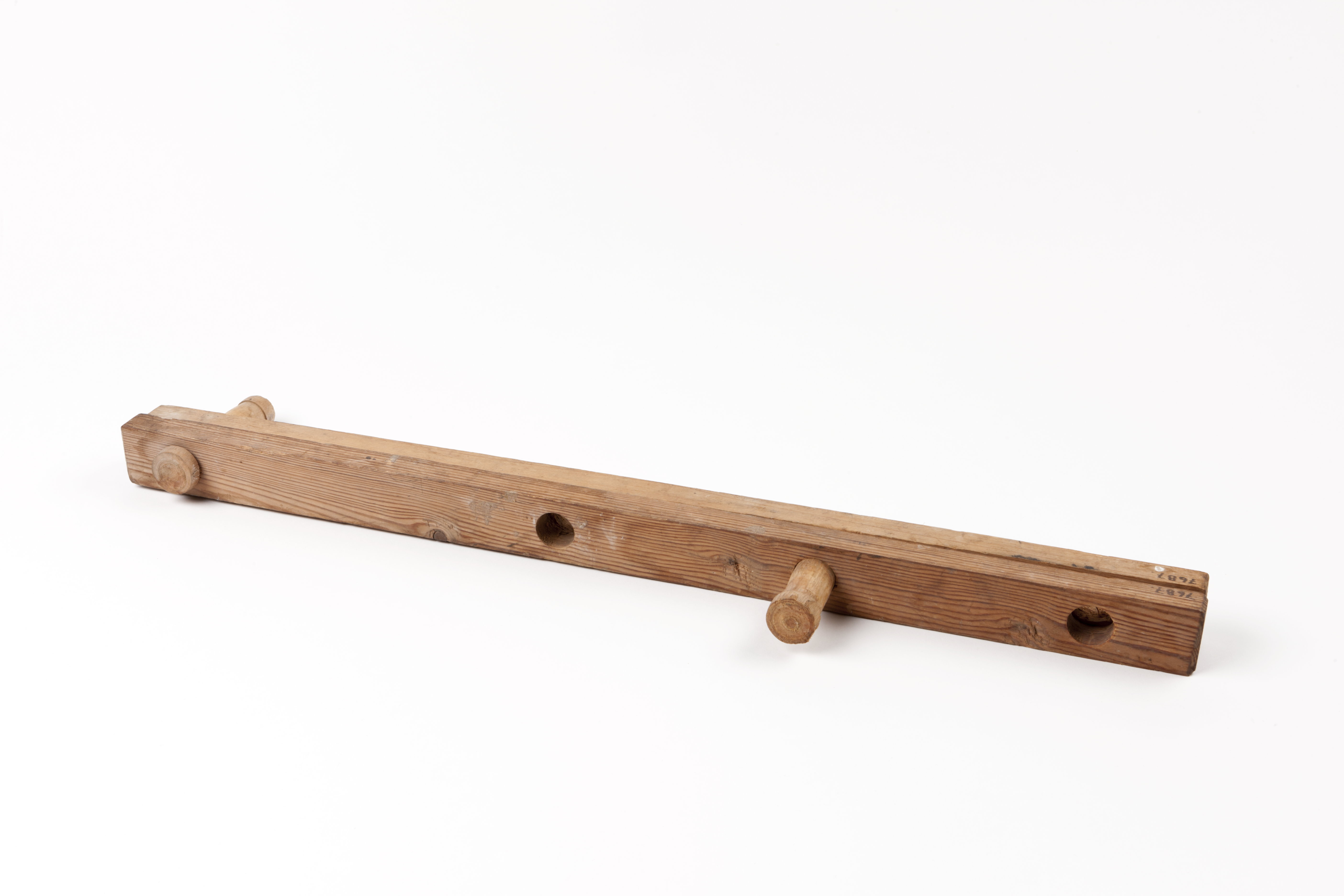 Bestående av två långa och smala furustycken med fyra bulthål, sammanhållna av två bultar av björk.