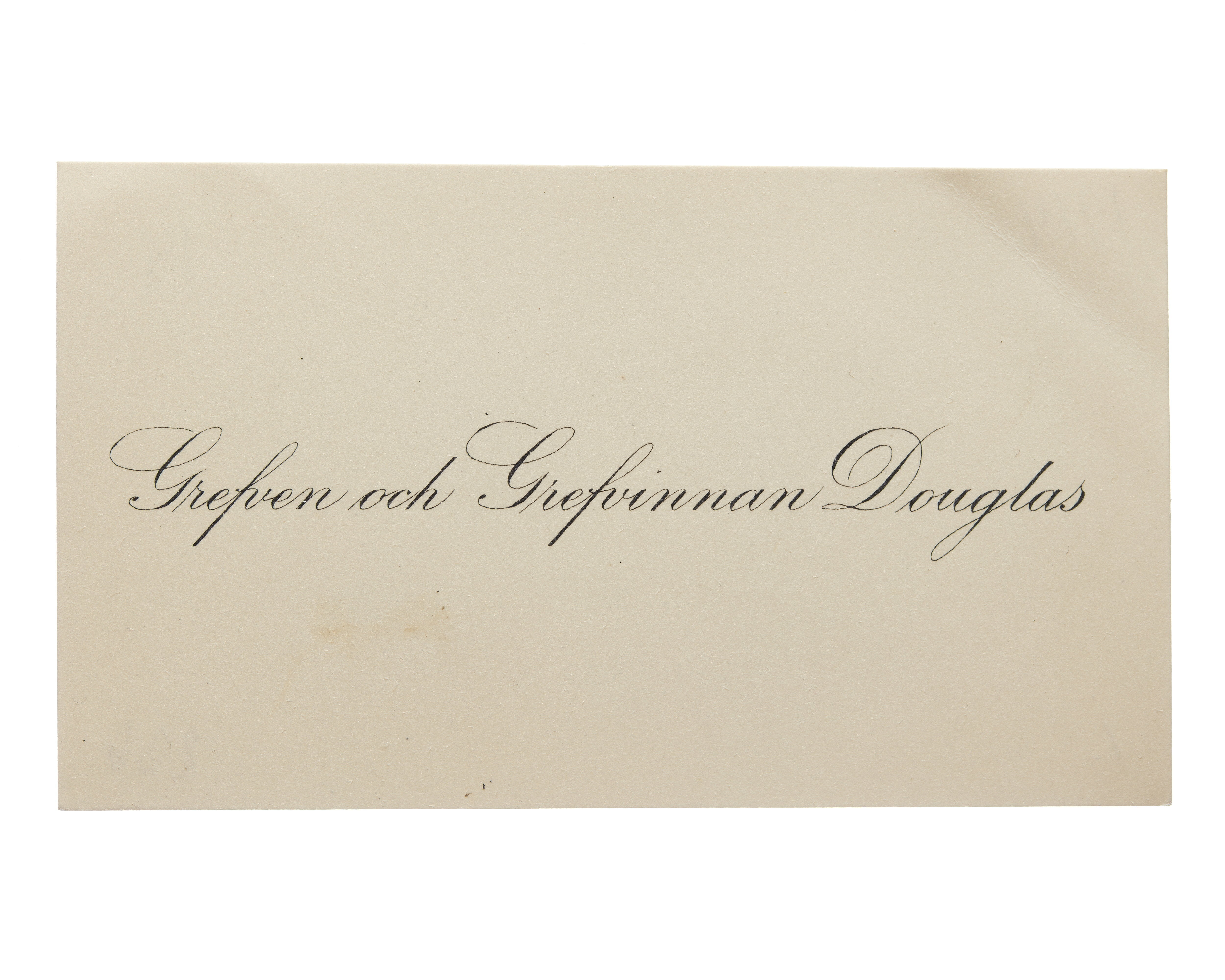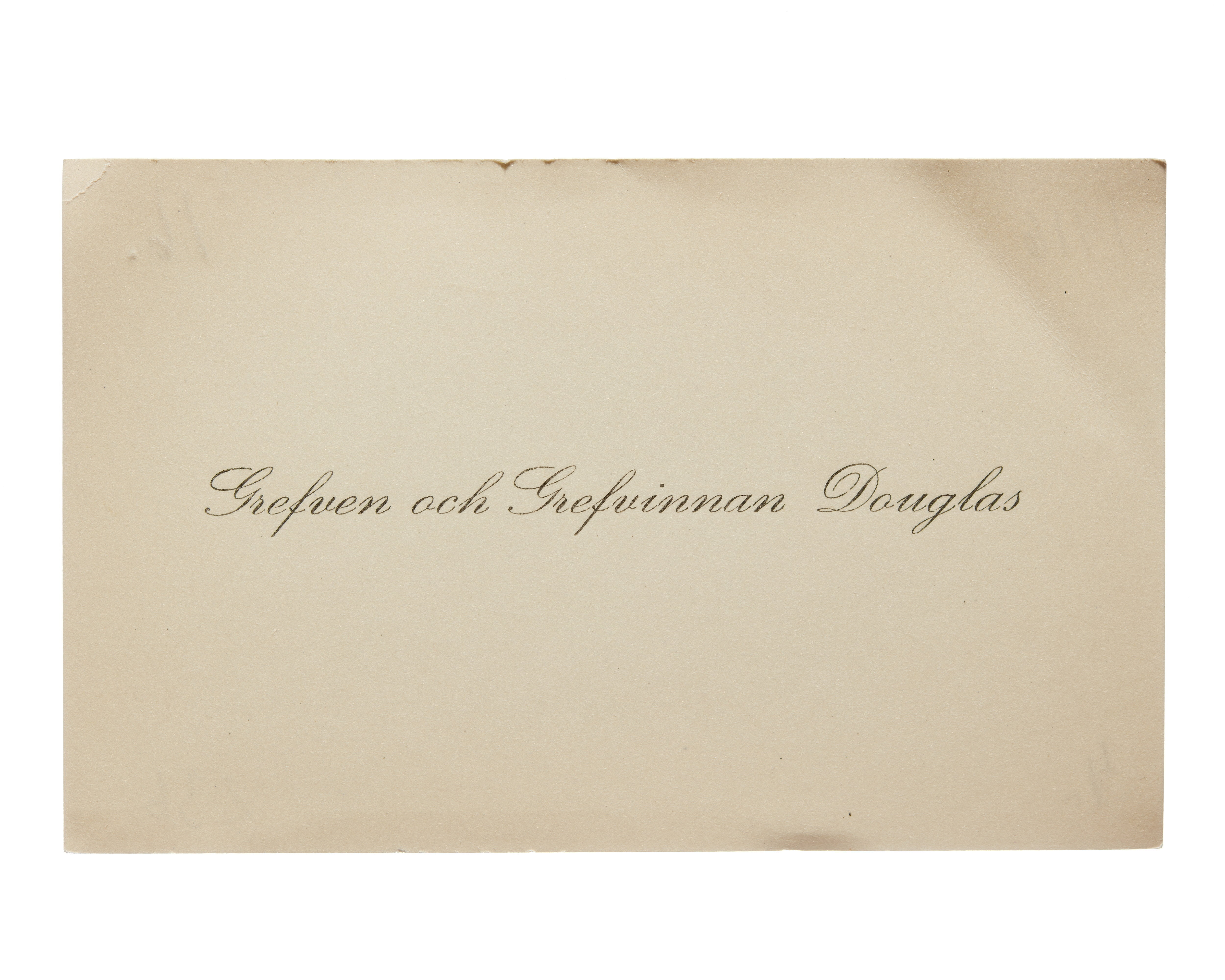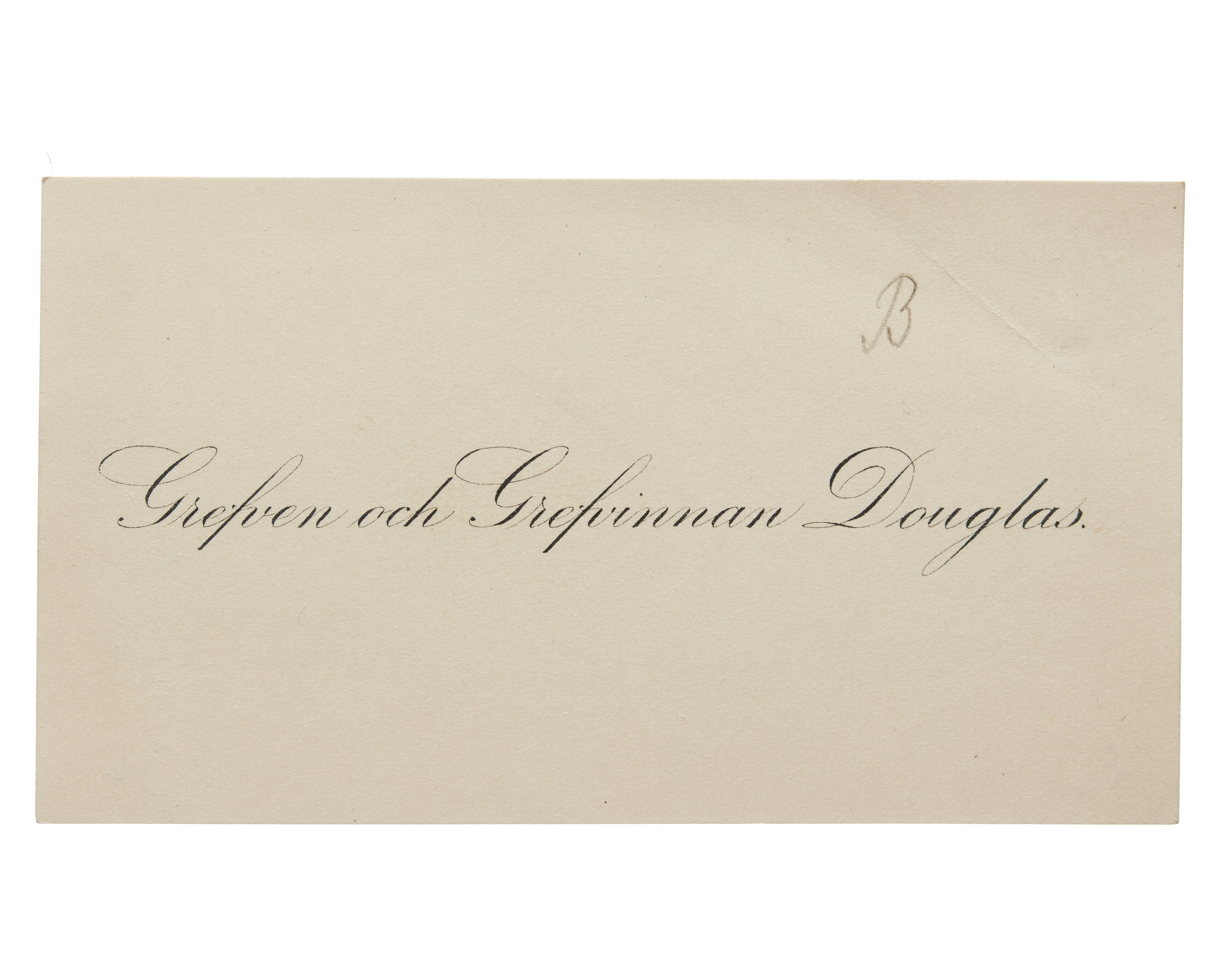 Fyra visitkort från greven Ludvig Vilhelm August Douglas och gravinnan Ludvig Vilhelm August Douglas. Första kortet daterat 1914, vikt i övre högra hörnet. Andra kortet daterat 1915, vikt i övre högra hörnet. Överlämnat i samband med Wilhelminas bilolycka i 1915. Tredje kortet daterat 10.06.1915, vikt i övre högra hörnet. Överlämnat i samband med guldbröllop, 1915. Fjärde kortet daterat 1916, vikt i övre högra hörnet.