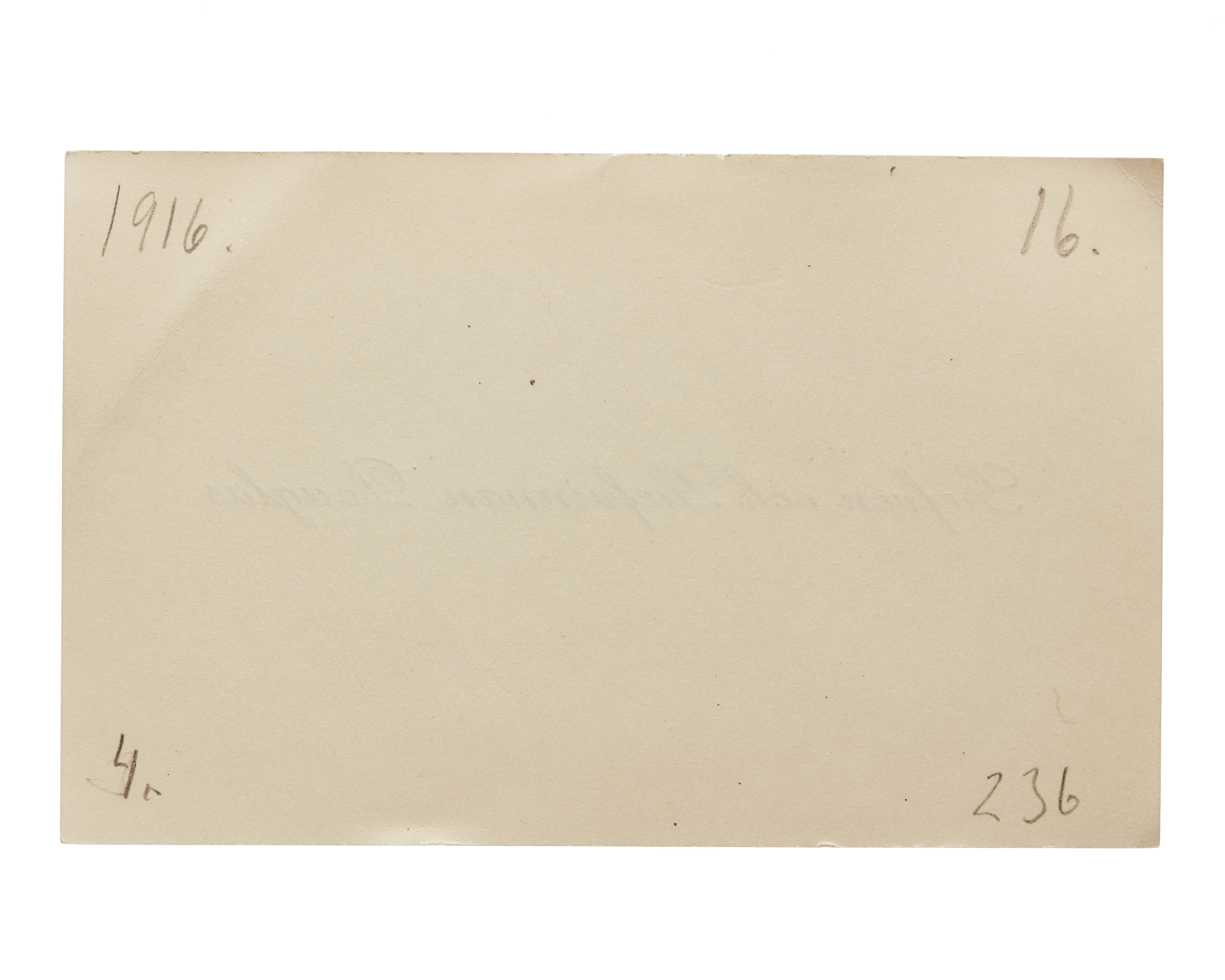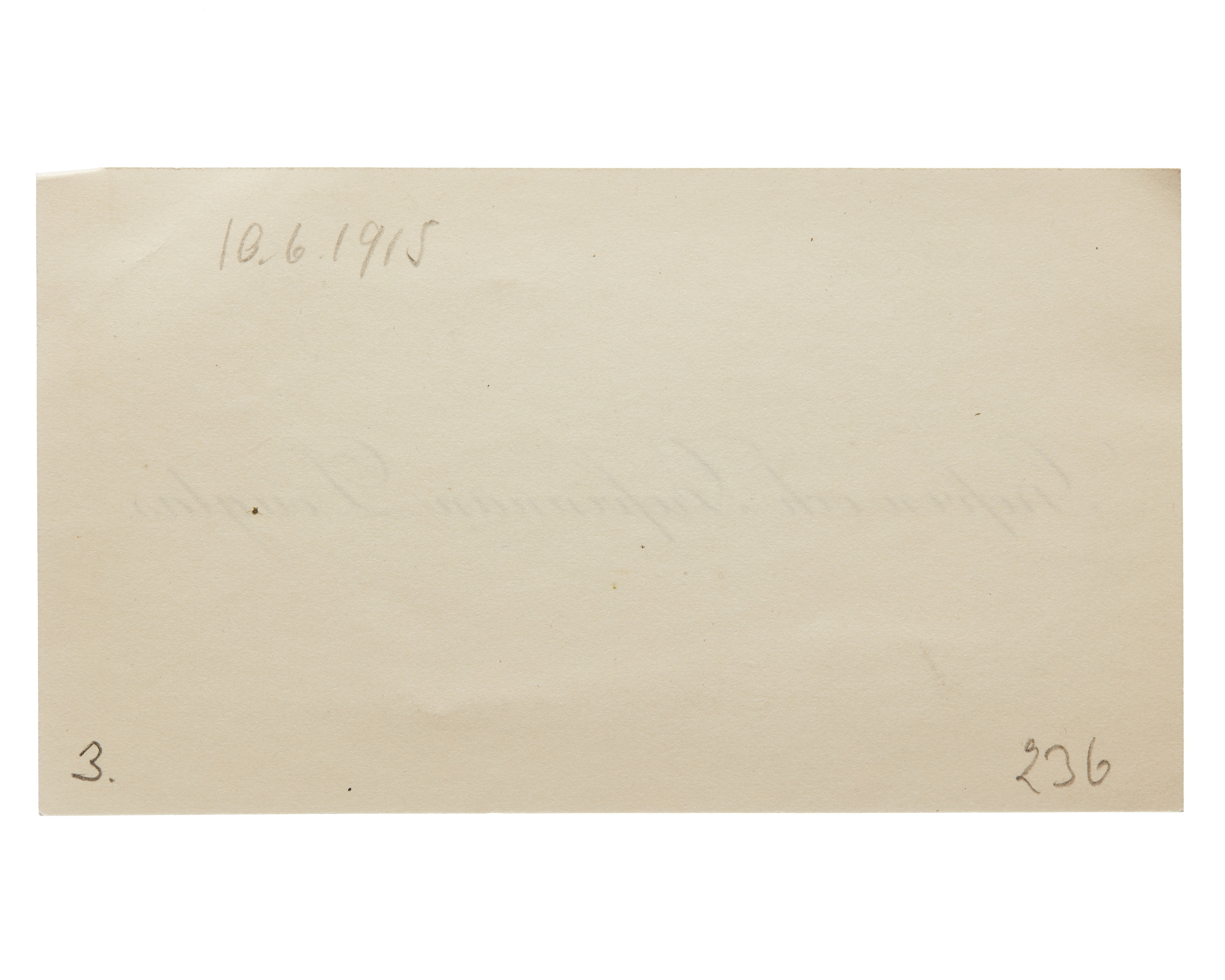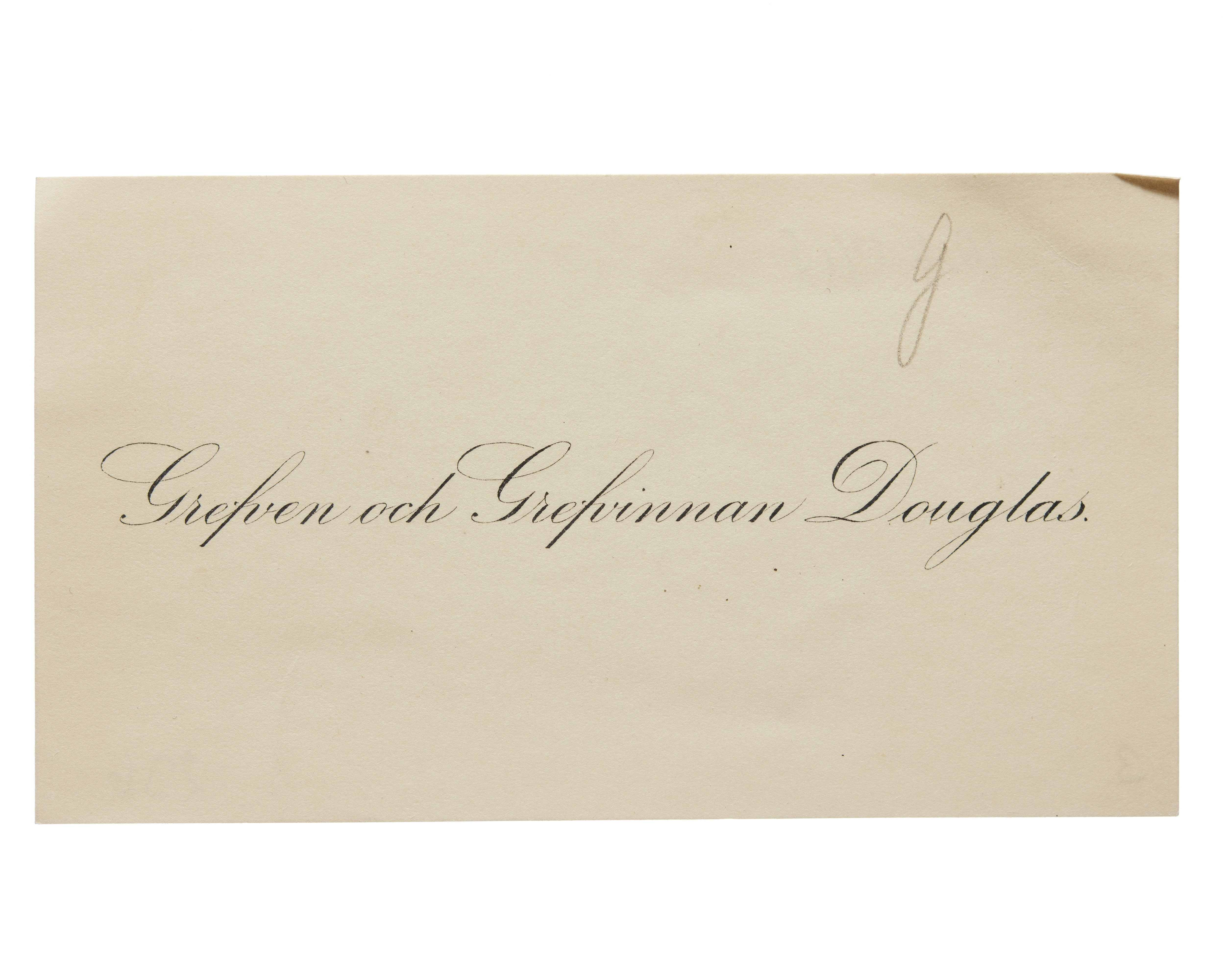 Fyra visitkort från greven Ludvig Vilhelm August Douglas och gravinnan Ludvig Vilhelm August Douglas. Första kortet daterat 1914, vikt i övre högra hörnet. Andra kortet daterat 1915, vikt i övre högra hörnet. Överlämnat i samband med Wilhelminas bilolycka i 1915. Tredje kortet daterat 10.06.1915, vikt i övre högra hörnet. Överlämnat i samband med guldbröllop, 1915. Fjärde kortet daterat 1916, vikt i övre högra hörnet.