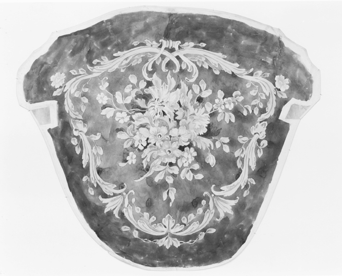 MÖNSTERFÖRLAGA, till möbelklädsel. Utförd i akvarell och gouache på papper, utgörande klädsel till länstol (bergère) inv nr Gr vI:II:A.a.8 (för beskrivning se Hallwylska samlingen Gr VI, text, s 273 f.f.). Motiv av blomsterbukett och bladranka Påskrift: "Fåtölj D väfvd af Karin Nilsson" Mått: H 84.5 cm B 96.9 cm Gåva 1943 av arkitekt Gustaf Clason (se protokoll 54 º 4)
