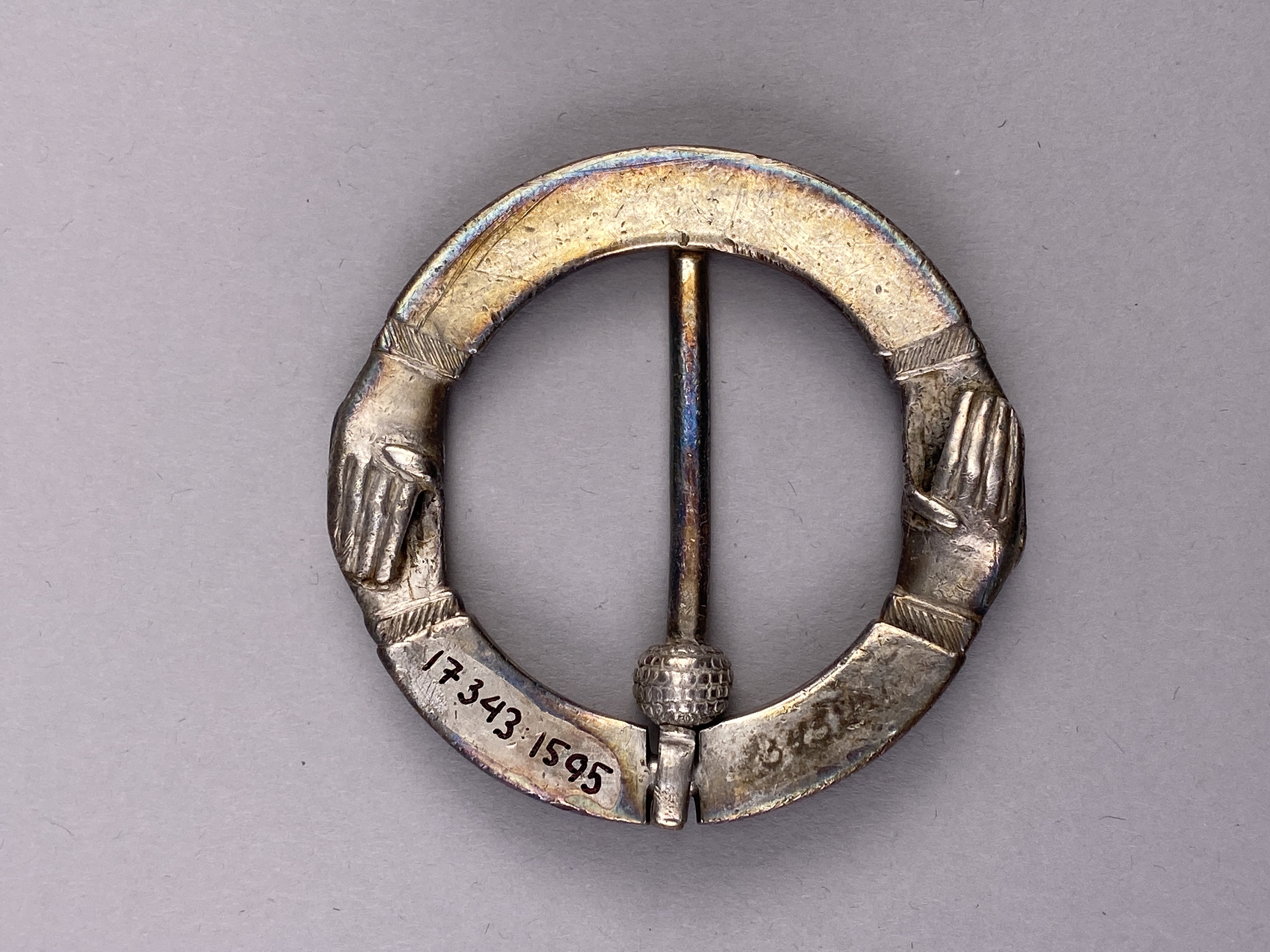 Ringspänne bestånde av två rundböjda, plana bygglar utlöpande i två händer, på vardera sida, som fattar varandra. Händerna är försedda med smala, rutgraverade "manchetter". Nålen är rund och fäster i en indragning i spännets omkrets och närmast nålens fäste sitter en rund kula med små reliefknoppar. Spännet har troligen varit förgyllt.