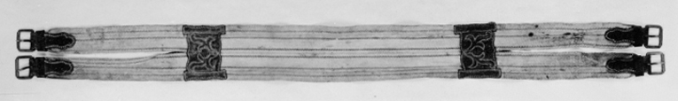 Bukgjord med fyra läderfästa metallspännen och två hällor i läder.