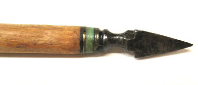Spets av stål, l 20 mm, tresidig med konkav, cirkulär hals och tången inslagen i skaftet. Mellan spets och skaft dekoration, ca 4 mm bred, i form av grön sten? mellan tunna plattor av gulmetall. Skaft av ljust trä liknande furu. Bakpartiet, l 133 mm, målat i fält: guld - rött - grönt - rött - guld med över mitten lindad tunn silvertråd i rutnät av romber. Vita styrfjädrar. Avslutas med strängläge tillskuret med två armar.