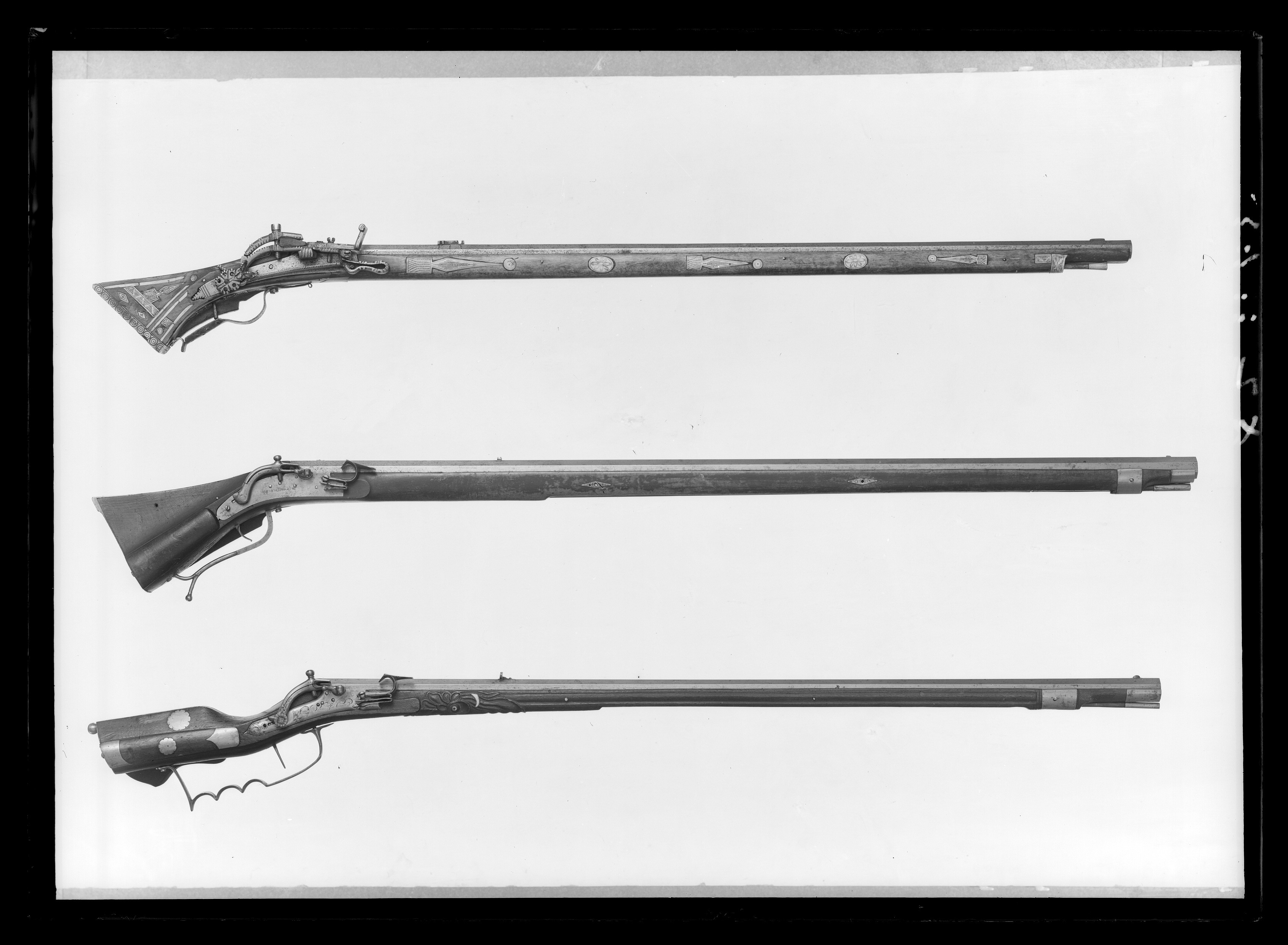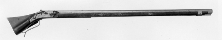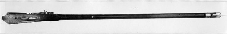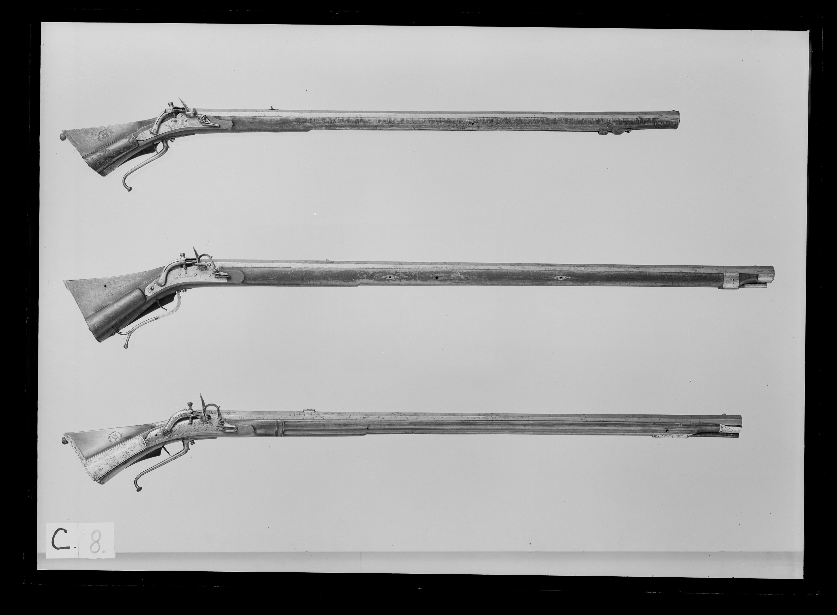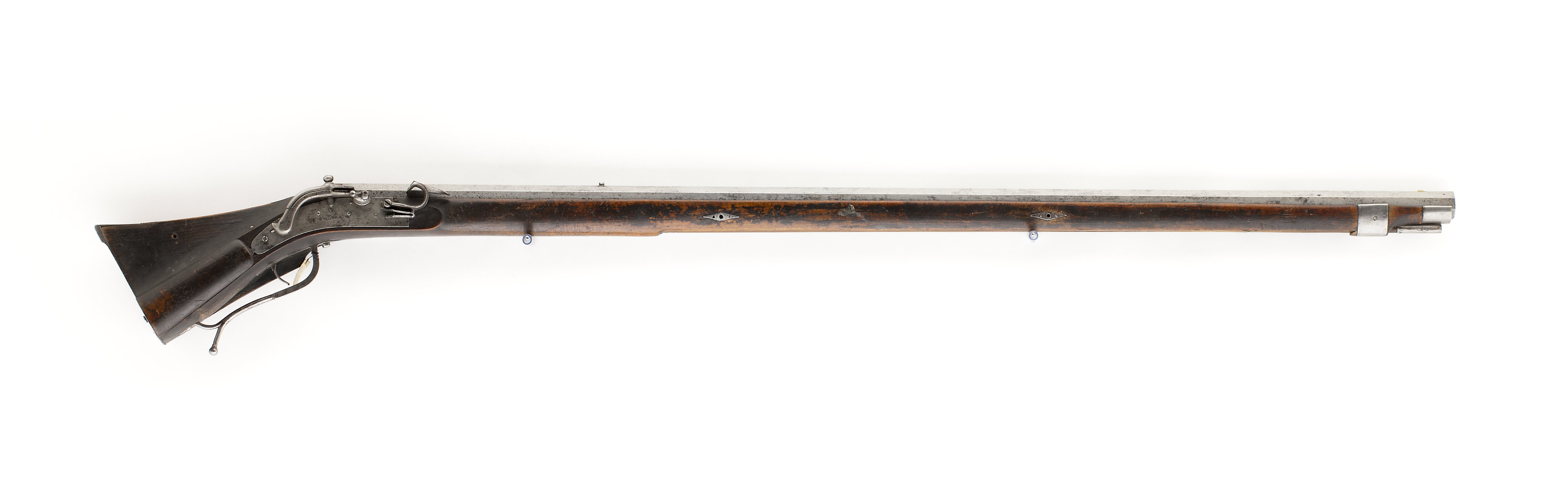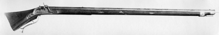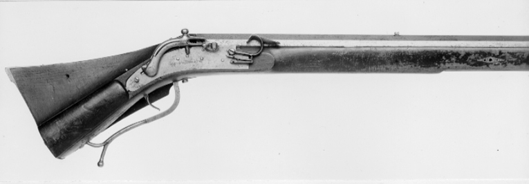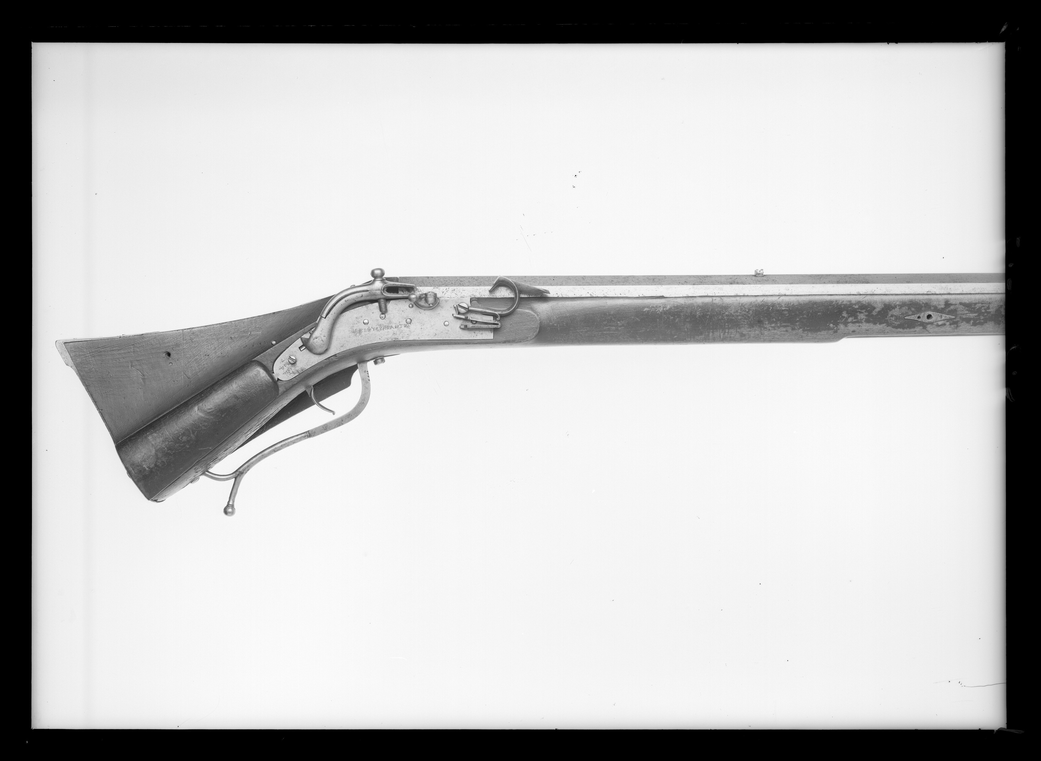 Åttsidig pipa av stål med 8 räfflor, raka bommar. Nedsvängt svansskruvblad med 2 tvärlinjer. Riktmedel: Inlaxade, sikte av stål med bred mittöppning med två runda, små skärningar på vardera sidan, skåra mellan dem. Stolpkorn av mässing. Fästning: Tre inlaxade häften. Pipan fäst med krysskruv underifrån samt två (urspr. tre) pipstift av stål. Snapplås, lägglås av stål med plant låsbleck, bakre änden är nedåtböjd, knoppformig ände samt på tvären graverat: "1667.P.F.". Mitt på låsblecket graverat: "A. REVTERKRANTZ". Rundad, böjd hane av svensk typ med lös överkäke, käkskruv med runt huvud. Liten, rundad fängpanna med fals, vridbart lock med fingergrepp. Batteri med böjd arm och flik. Invändig slagfjäder. Kommaformig nöt. Fästning: Två låsskruvar. C-formig avtryckare. Rektangulärt avtryckarbleck av stål. Helstock av björk, målad mörkbrun. Kolv av svensk typ med trekantig kontur. Beslag av stål, slät bakplåt, förstärkt häl, tunga med separat, lökformig spets, bakom svansskruvbladet ett stålbeslag.Två runda låsskruvbrickor av stål. På vardera sidan av framstocken två romboida brickor för pipstiften. Näsband och överrörka i form av stålband runt framstocken. Varbygel framtill kantig, bakåt rund, utdragen och förgrenad i utskott med knopp och uppåt en stolpe med kort, spetsig arm, fäst med skruv. Främre armen spetsig, fäst med krysskruven. Tillbehör: Laddstock av ljusare trä, skodd med stål. I kolvlådan krats av stål (nr?).