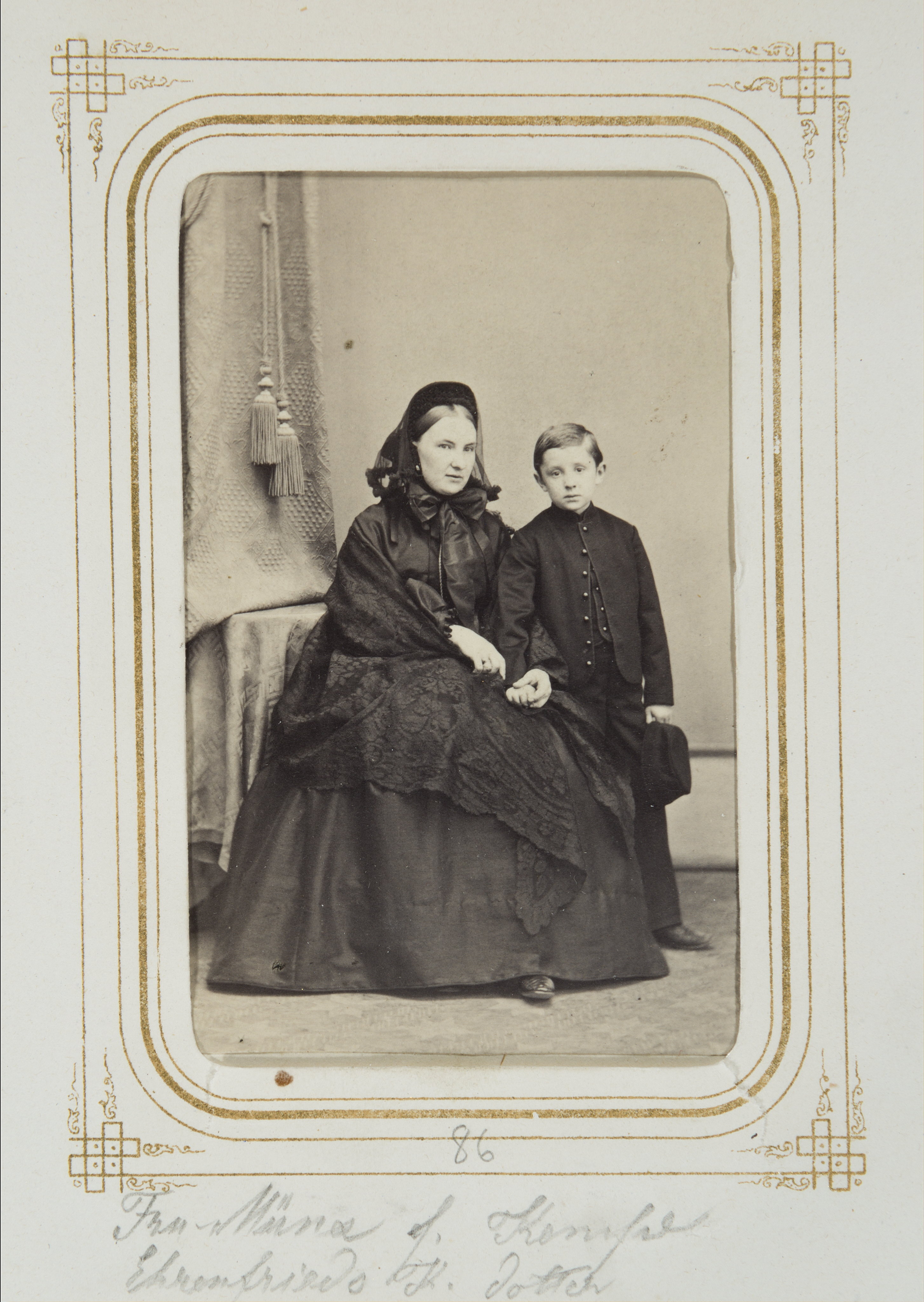 Biografi. Fotografiporträtt. 101 porträtt i album. SOFIA MÜNX, f. KEMPE med sonen RICHARD. Erhållet av Johanna Kempe, f. Wallis på 1860-talet. 26,5x20,7x4 cm.