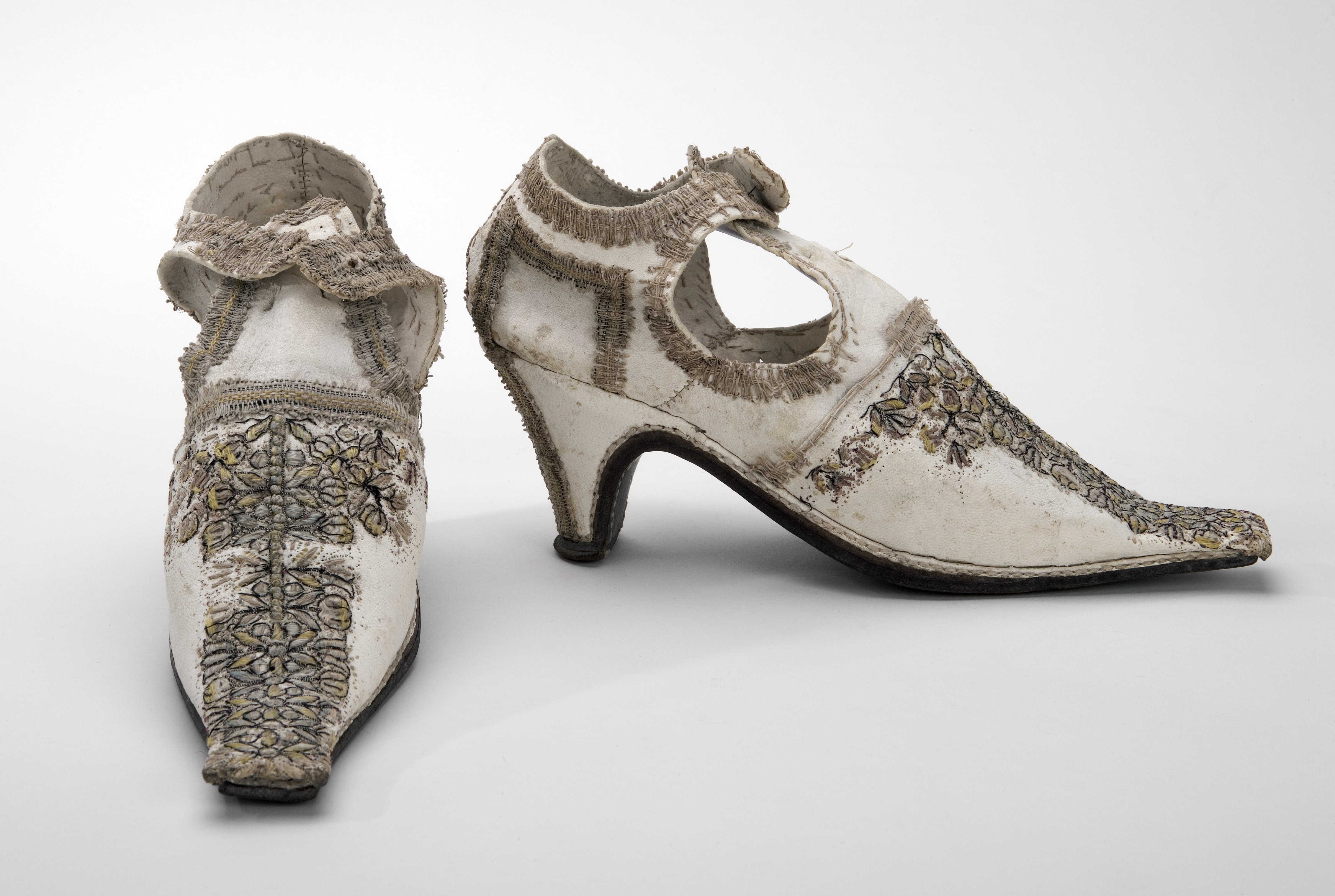 Två damskor av vitt skinn, broderade med mångfärgat silke och besatta med band Banden av linne och silke. Klack (75 mm hög), lång tvärt avskuren tå, två remmar som från bakkappan möts över en plös. Hål för knytning i såväl plös som remmar. Tåhätta broderad i plattsöm, knutsöm och läggsöm med gult, vitt och ljusblått silke i blombladsliknande mönster med konturer av svart tråd nedsydd med röd. Klack, bakkappa, remmar och plös dekorerade med 10 mm breda, vit-, gul- och svartrandiga band. Kraftig sula.