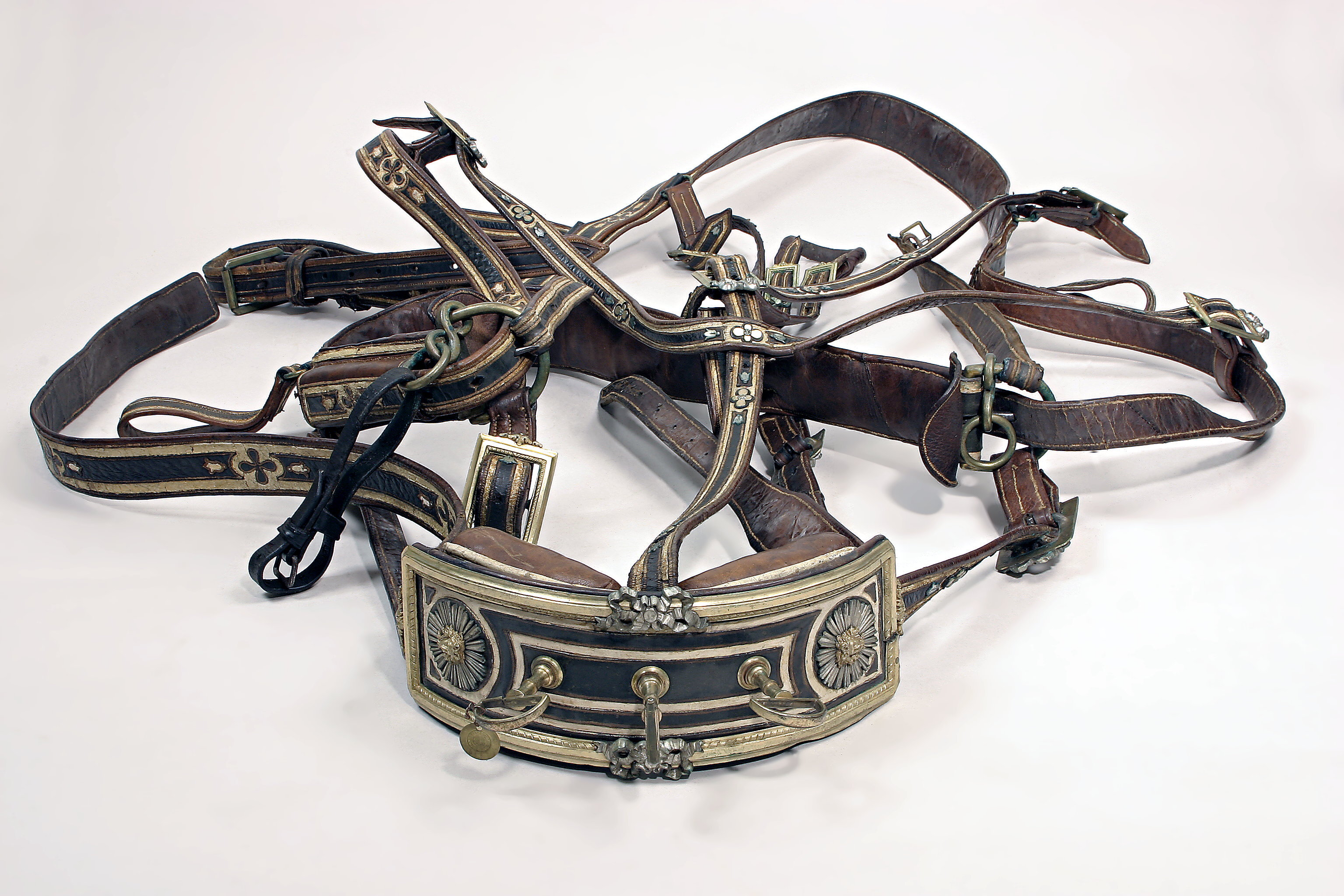 Seltyg av svartmålat läder med dekorsömmar och imålade vita ränder. Stöd- och bärremmarna med grupper om förgyllda fyrklövrar med två försilvrade klockor. Brösta, hindertyg, bukgjord och draglinor med ditsydda grupper av fyrklöver med två klockor var. 90 mm bred brösta med stångkappsring. I stångkappsringen 40 mm bred rem med slät sölja, förgylld och med lös hälla av flätat, brunt läder. I bröstans ändar halvrunda söljor av mässing, i vilka draglinor, bukgjord, deckel, mankrem och mässingsring är fästade. Mankremmen är snedställd och går från deckeln till bröstan. Spännes med rektangulär, förgylld gjuten mässingssölja med fastnitad, försilvrad rosett, rembredd 35 mm. Deckeln, b: 420 mm, L: 125 mm, av svart läder med dekorsömmar och vita fältindelningar, på var ytterkant ett förgyllt Medusahuvud på för- silvrade strålar. Ram av profilerad, förgylld gjuten mässing med två försilvrade mässingsrosetter. Två halvrunda tömlöpare och en deckel- krok av förgylld mässing. Bossa av sömlös läder. Deckelgjord, b: 60-35 mm med förgylld slät sölja. Bukgjord, b: 35 mm, fodrad med läder, med förgylld slät sölja. Främre bärrem rörlig med nedtill två öglor, för dragrem och hindertyg. Bakre stödrem fastsydd vid ryggstyckets sölja och fäst vid hindertyget med en mässingsögla. Båda remmarna med två rektangulära förgyllda och försilvrade söljor. Svansremmen kluven, med två mindre förgyllda och försilvrade söljor. Hindertyget, b: 70-45 mm, med två stroppar för draglinor fästade i mässingsöglor. Draglinor, L: 2380 mm, b: 42 mm med fyrkantig mässingsögla för fäste vid svänglar.
