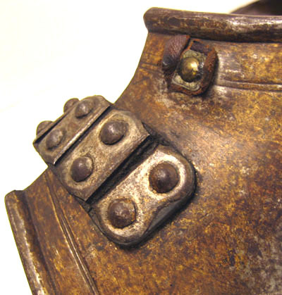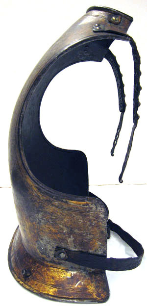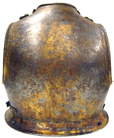 Driven ur ett stycke stålplåt, utsidan slipad med rester av förgyllning. Rundade urtagningar för armar och nacke. Omikta rundsmidda kanter. 10 mm in en ristad kantlinje. Drivna förhöjningar över skulderbladen. Nertill krage, utåt vinklad 45 grader, b 40 mm, med i var sida en utstående tapp, genomborrad från sidan. Över var axel läderremmar, l 260 mm, med nitade plåtar, rektangulära med avfasade hörn. I ändarna konturerade beslag av stål med tre över varandra ställda hål, för reglering av längd. Nertill i var sida en läderrem, l ca 340 mm, den vänstra med sölja och hälla av stål, att spänna runt bröstharnesket.